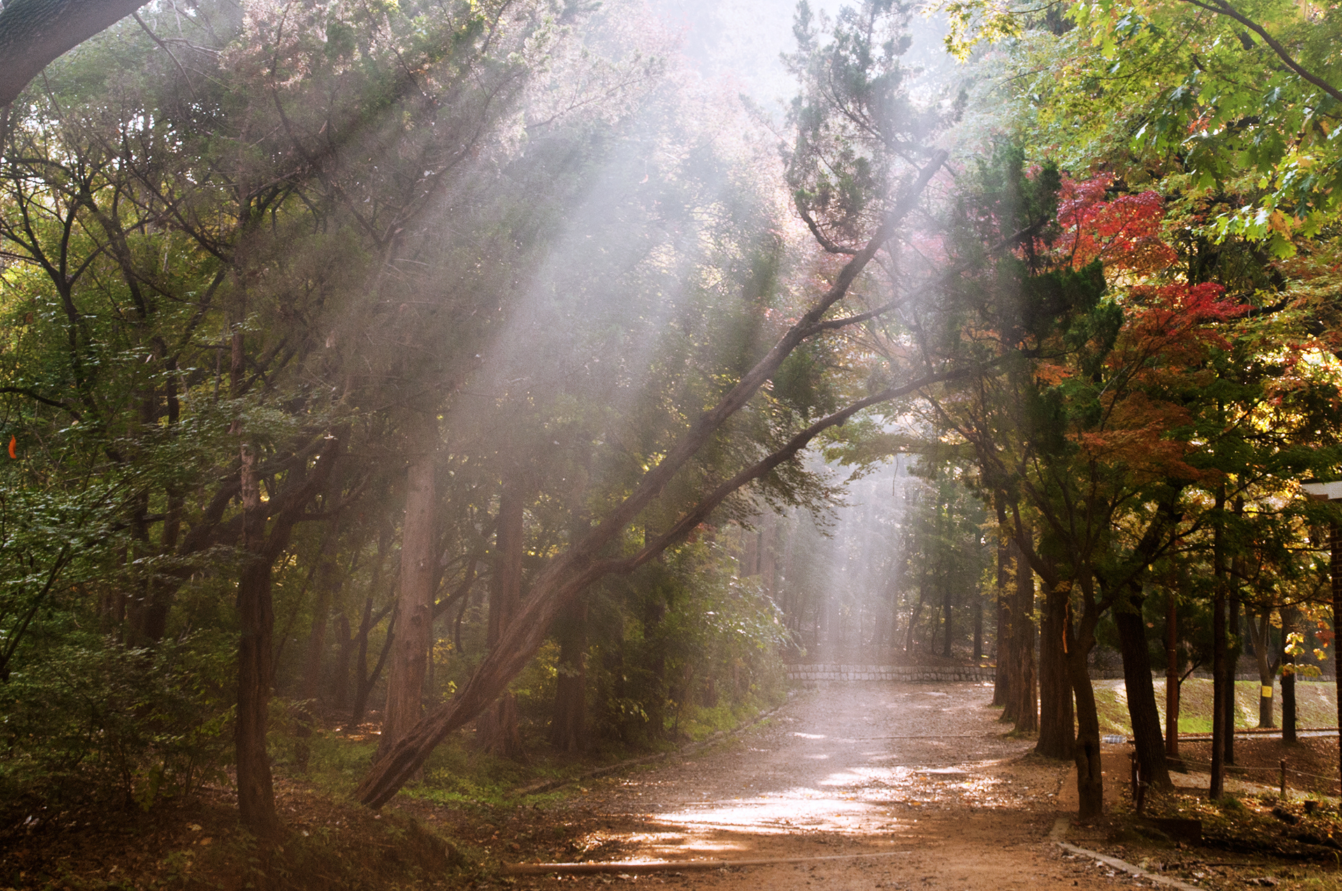 해가 산 위로 떠오르자 빛내림이 있을것 같아 빛내림 촬영장소로 이동해 본다.