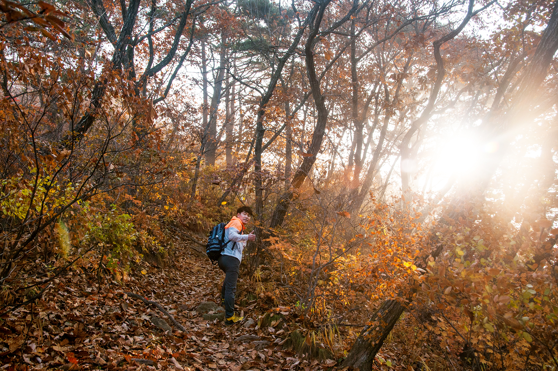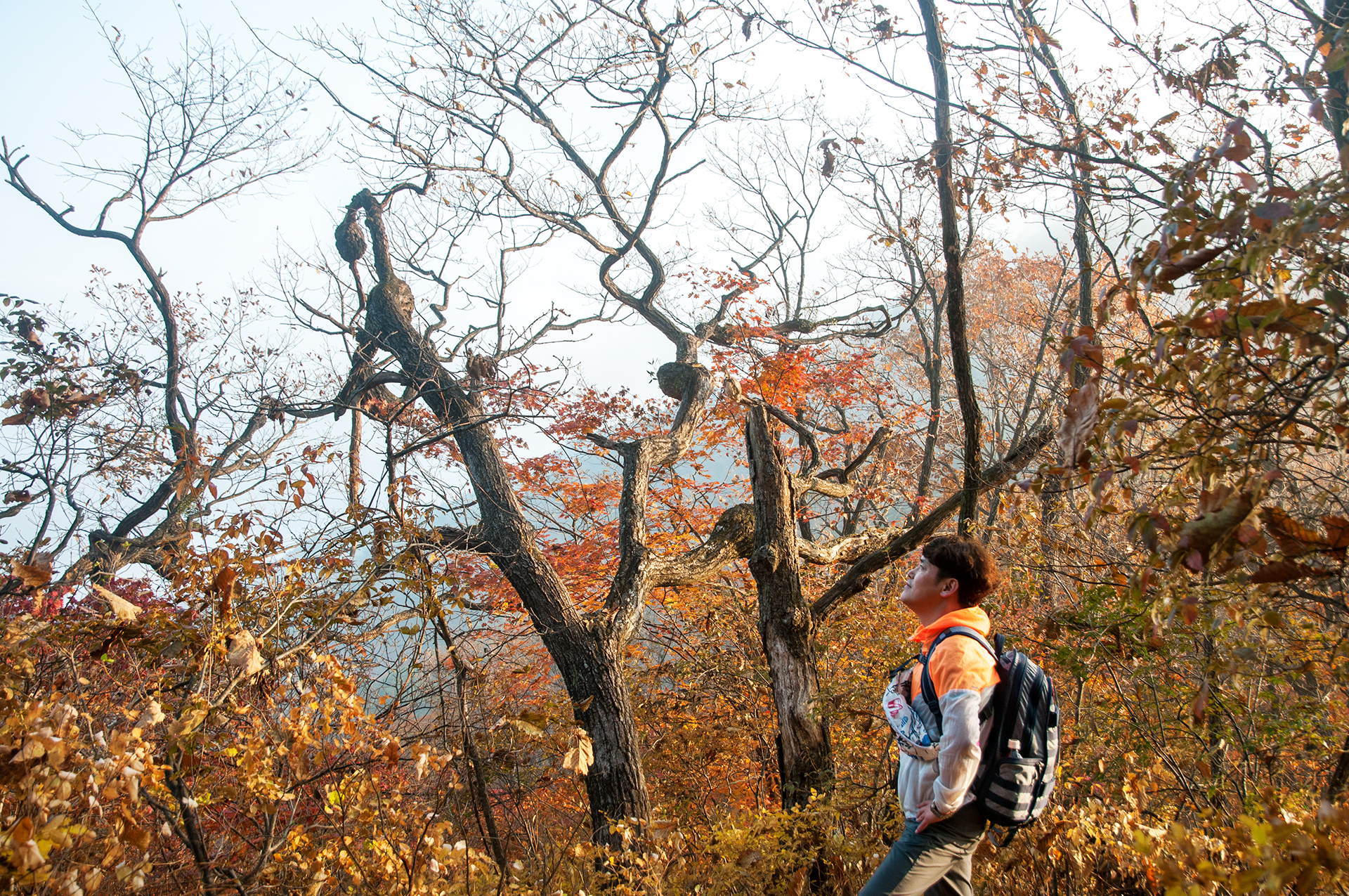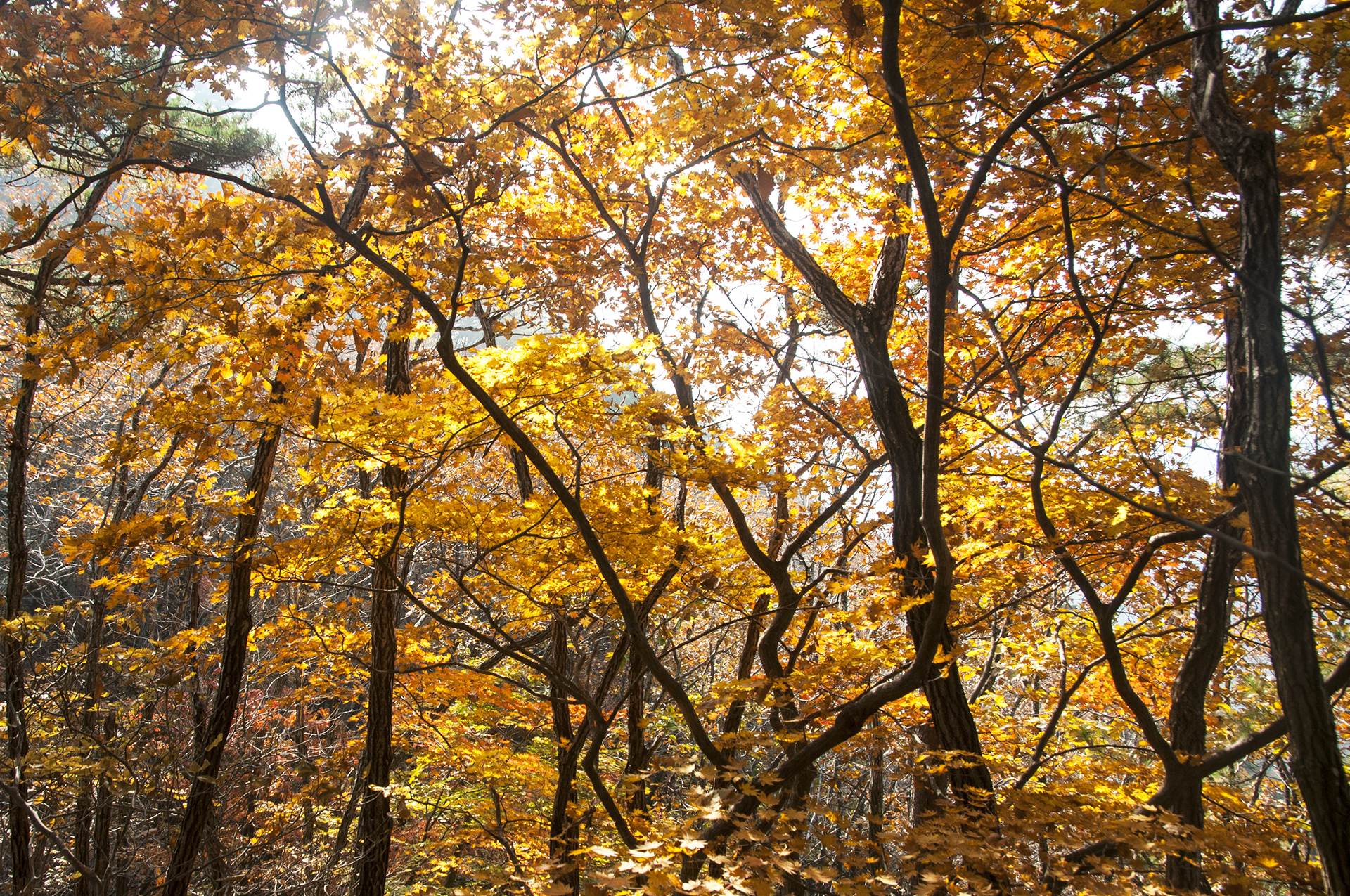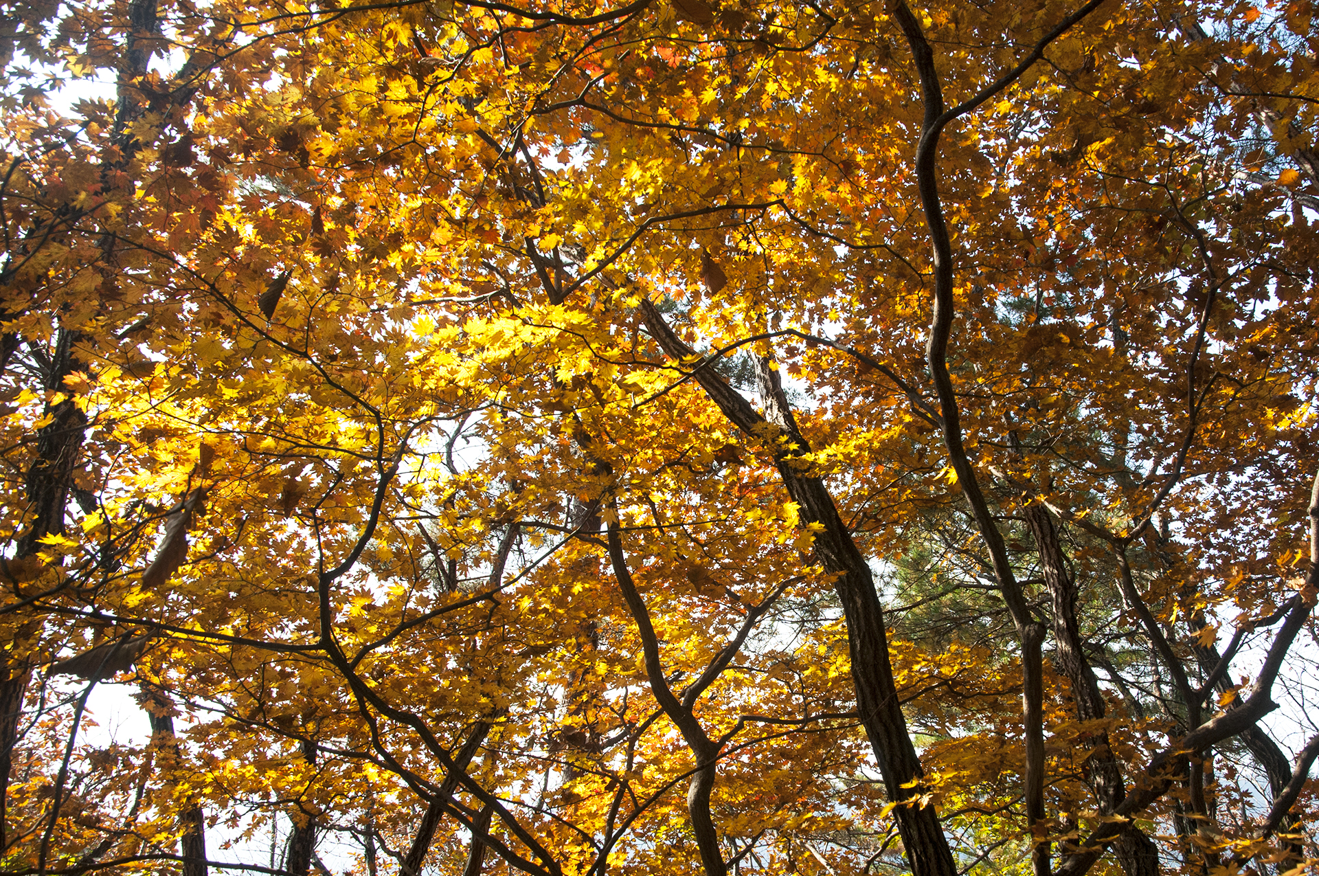 상수리나무가 천지인 숲에서 올라올땐 역광에 안개까지 끼어 이 예쁜 단풍을 못보고 지나쳤던 모양이다.