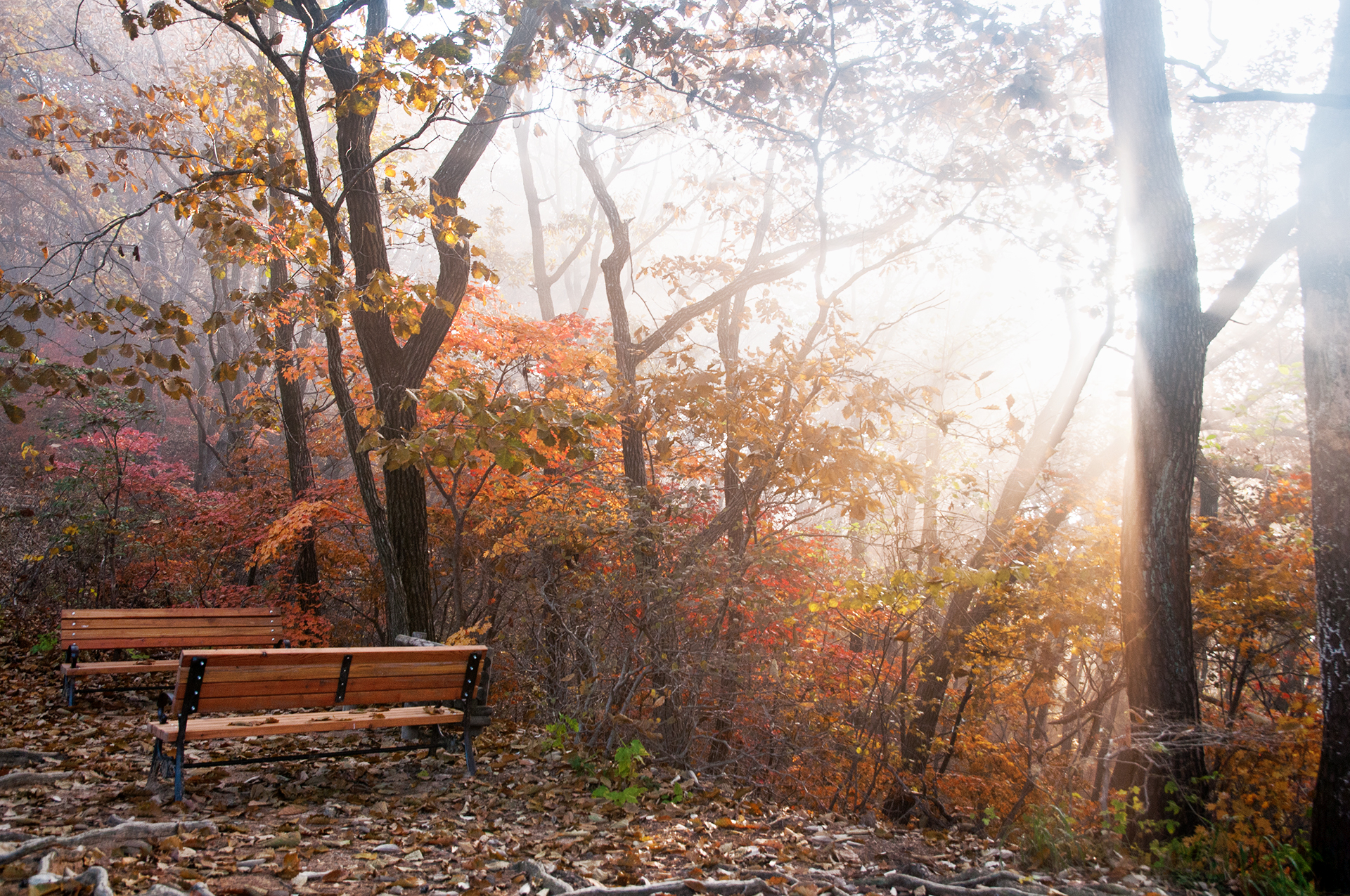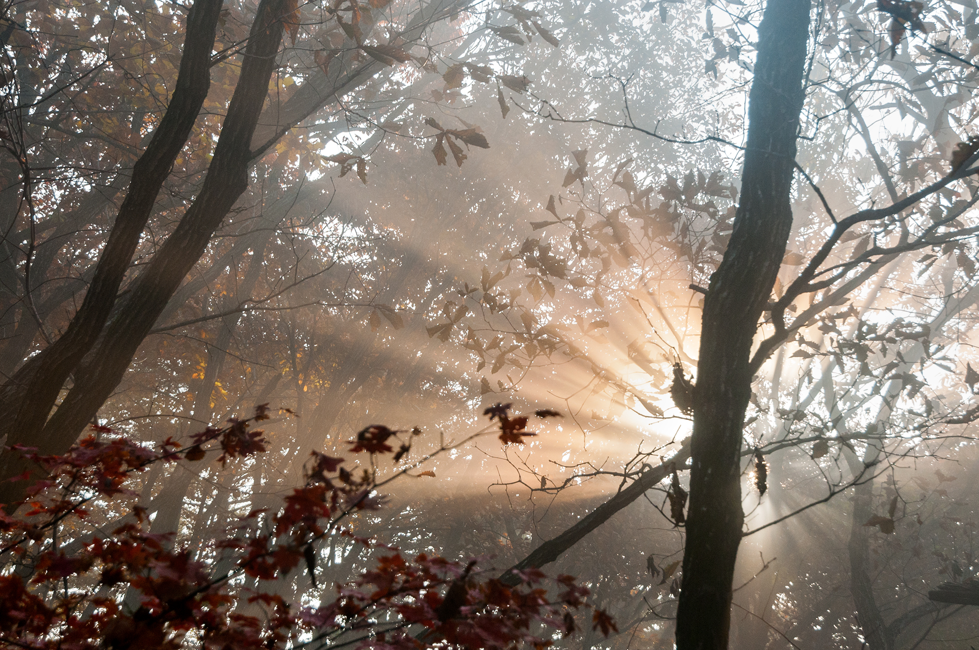 안개가 밀려오고, 햇살도 드리우는 숲,