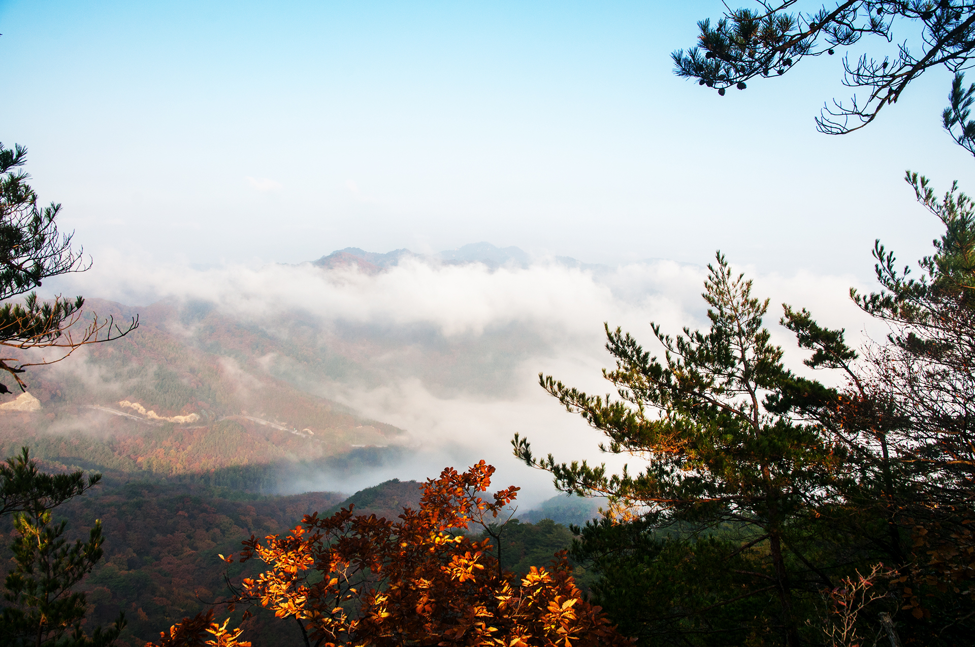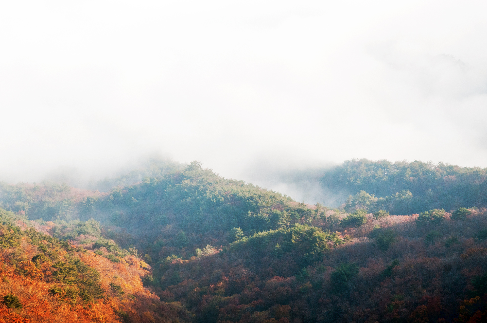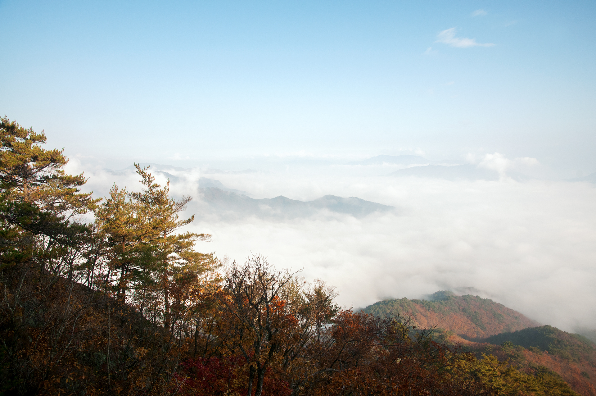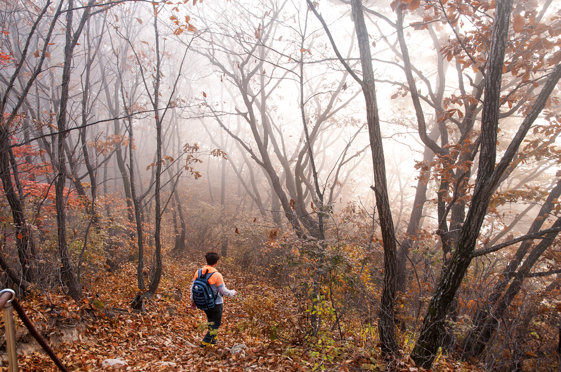 가을 산행은 단풍인데 단풍색이 곱지 않은 상수리나무가 주종이라 차라리 안개도 괜찮다 싶었다.