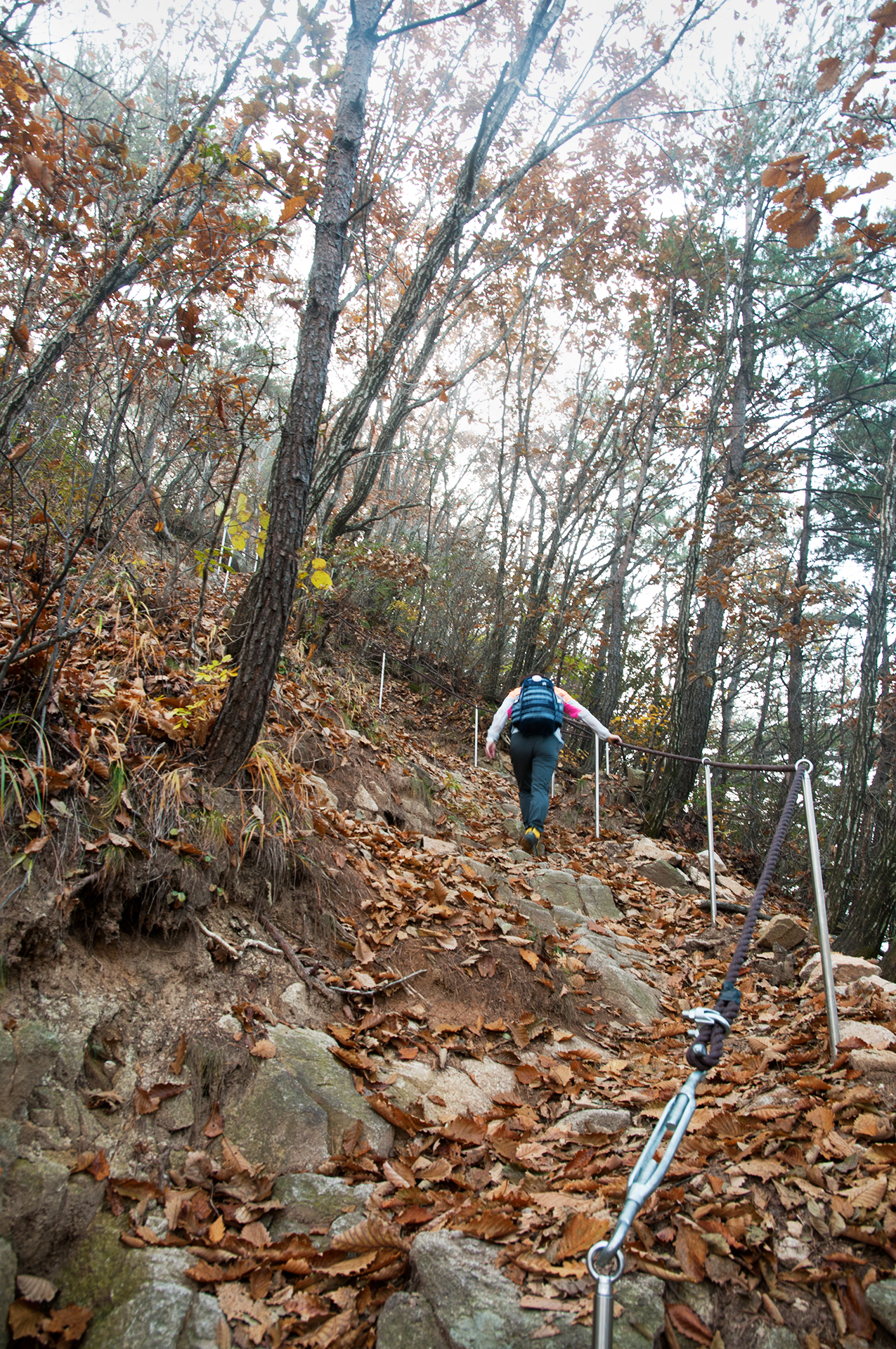 철난간과 밧줄을 엮어 등산로를 만들어 놓은 암벽 구간을 만나게 된다.