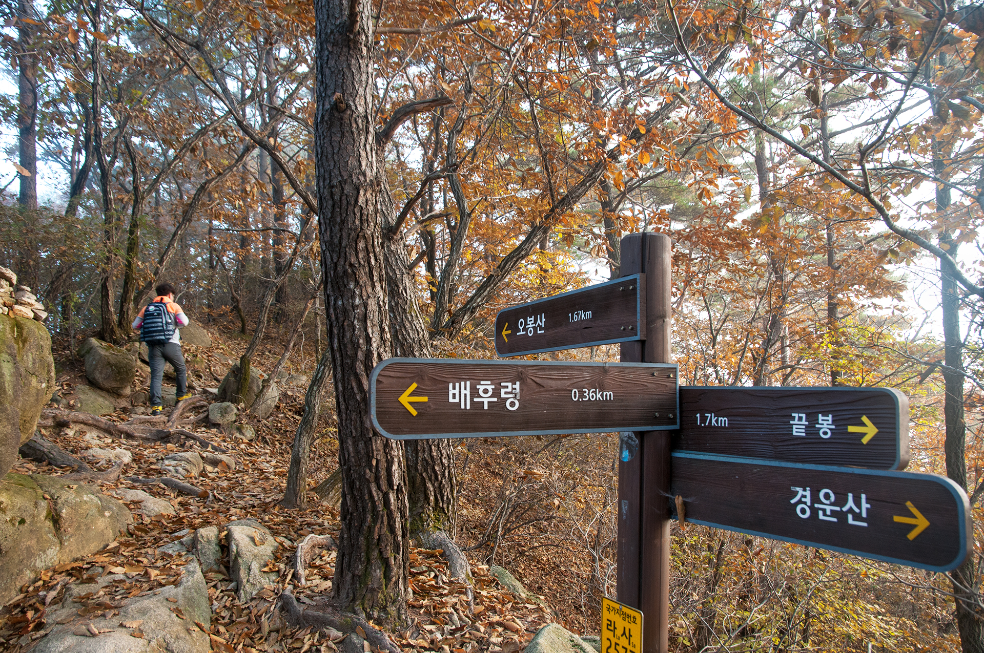 첫 이정표가 나오면 일단 오봉산의 힘든 구간을 절반은 통과한 셈이다.