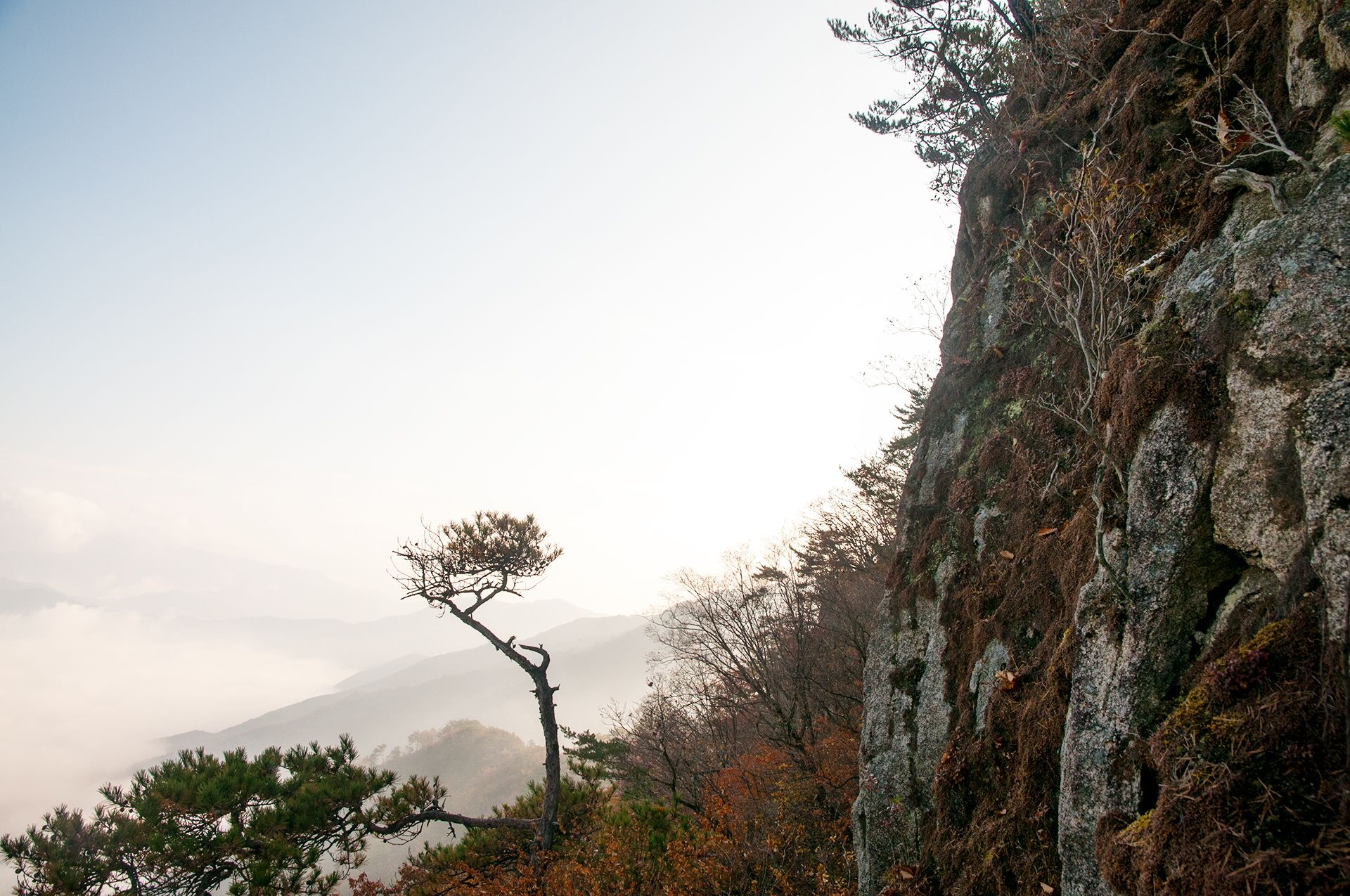 한쪽 절벽 위에 우뚝 솟은 바위 사이로 뿌리를 내린 청솔이 홀로 유연한 자태를 뽐내고 있다.