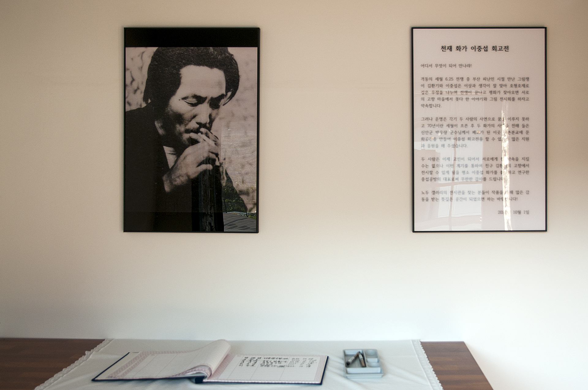 입구로 들어서면 방명록 위에 이중섭 화가의 모습과 중섭공방 대표의 글도 걸려 있다.