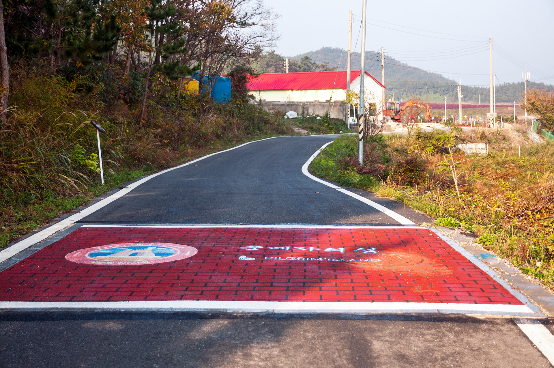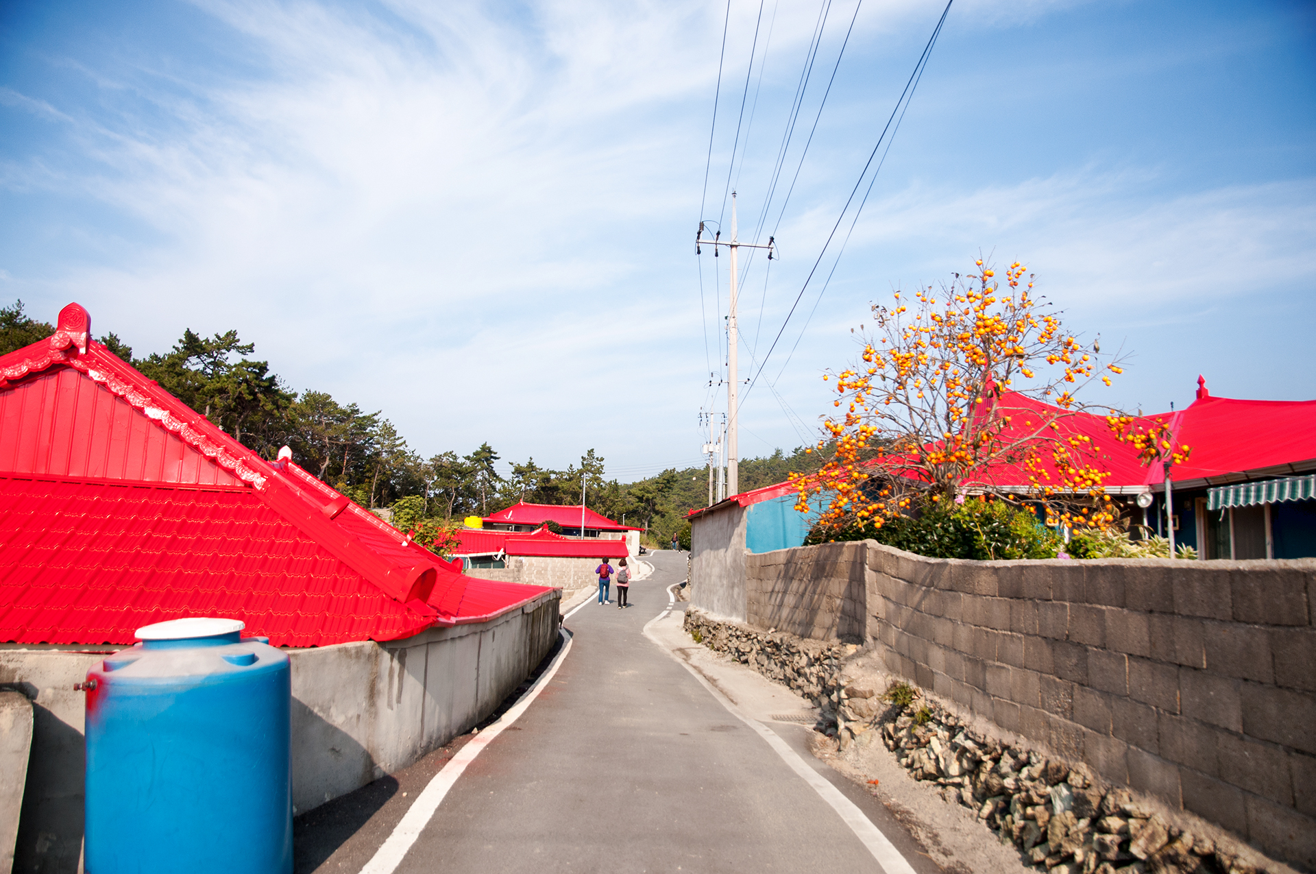 남촌마을을 지나가는 길, 빨갛게 칠한 지붕이 인상적이다.