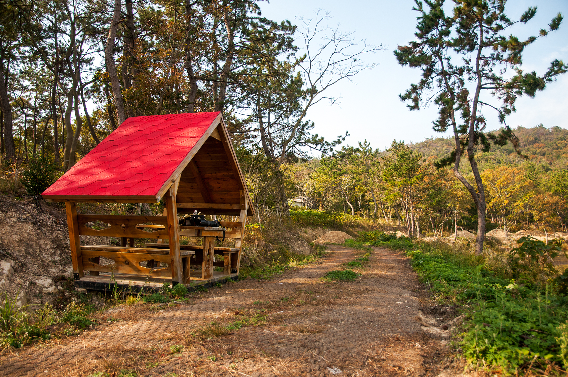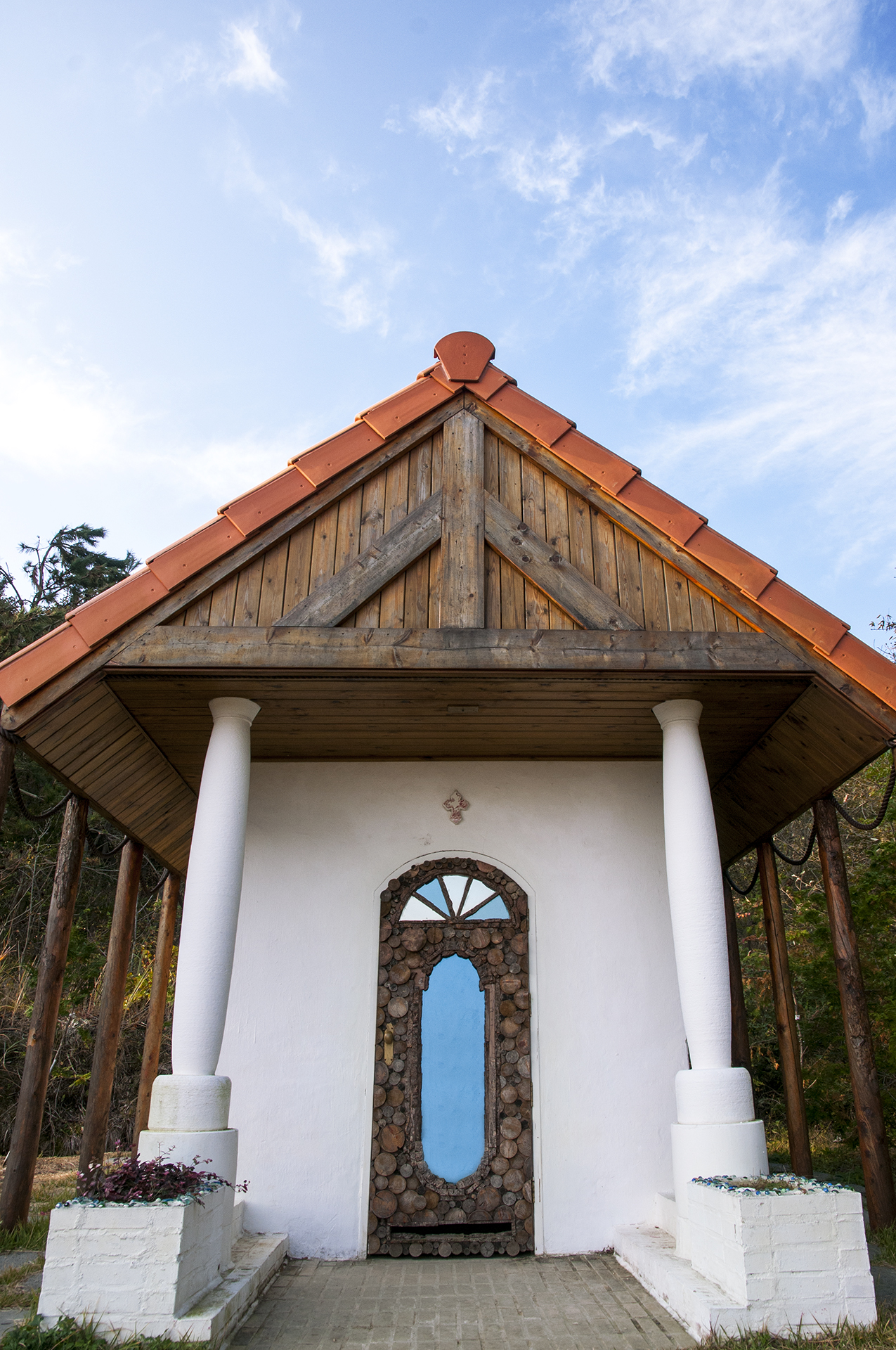 붉은 기와와 통나무로 처마를 완성한 지붕을 보면 숲속의 오두막을 연상하게 한다.
