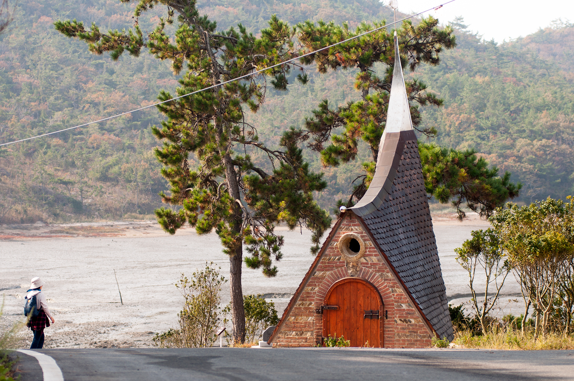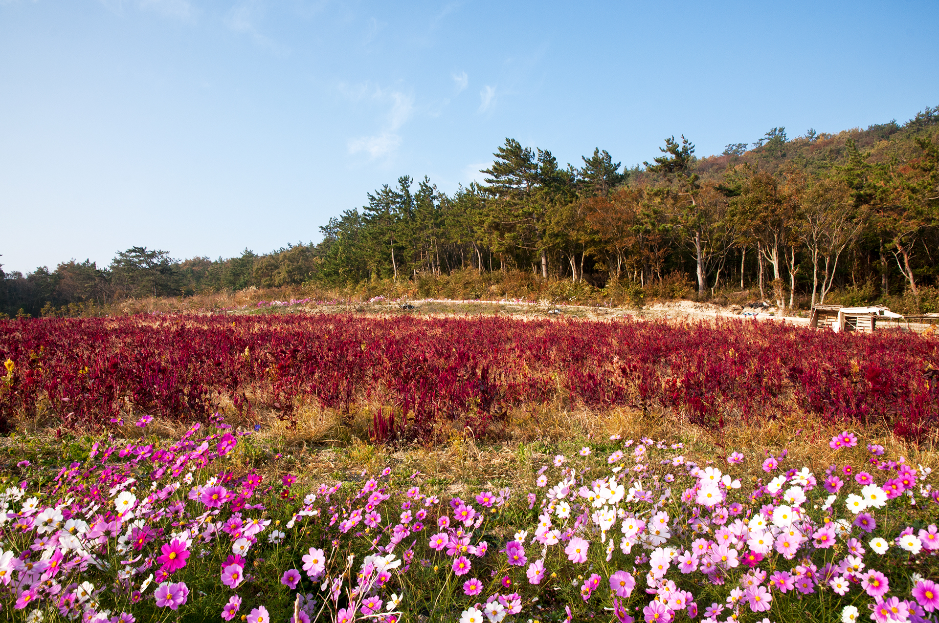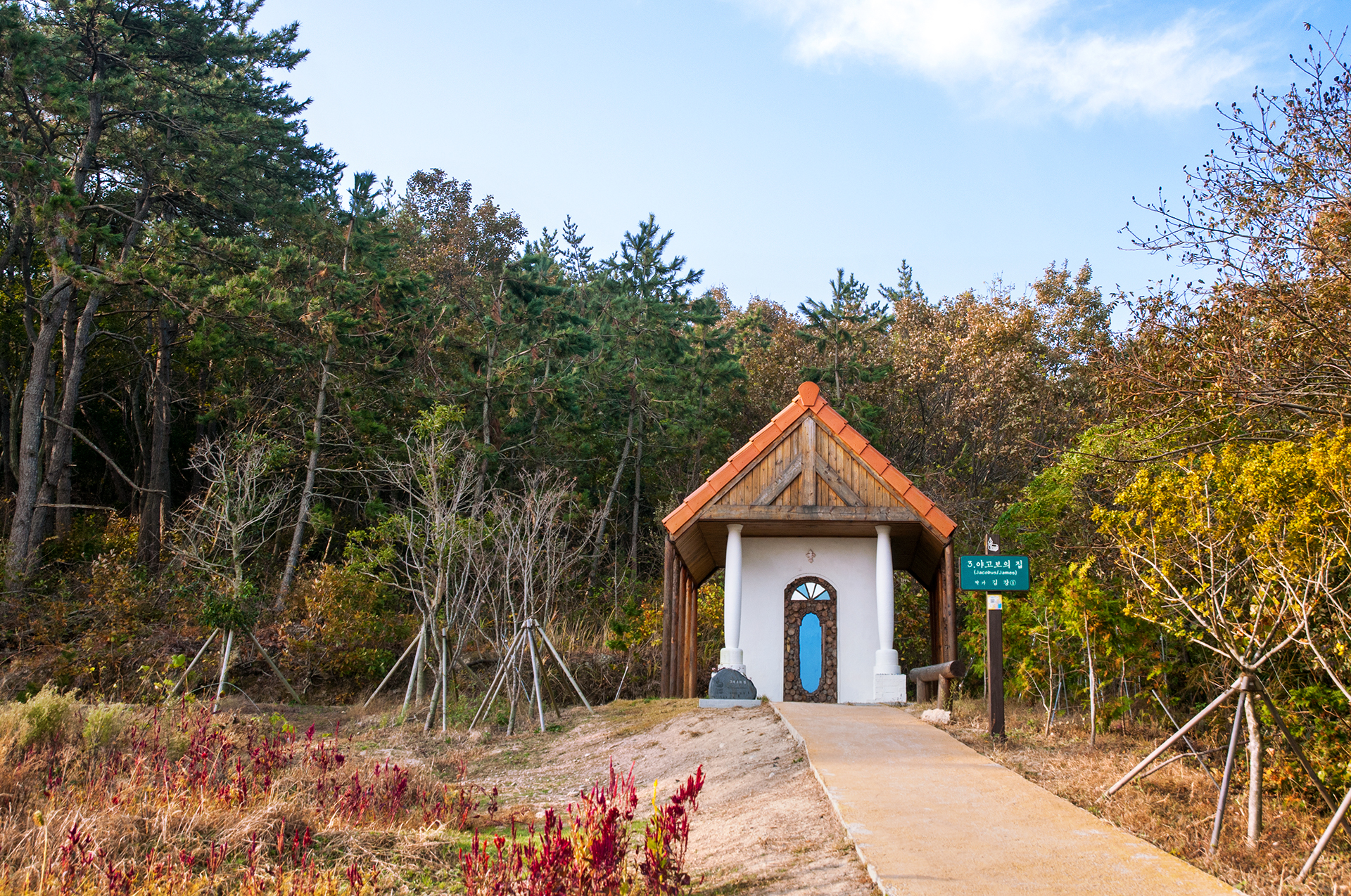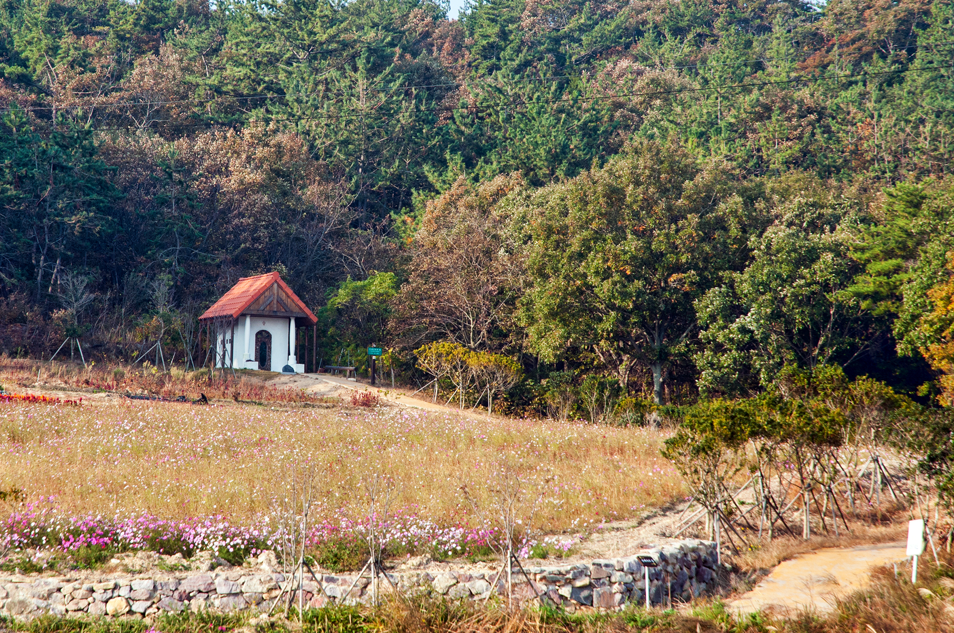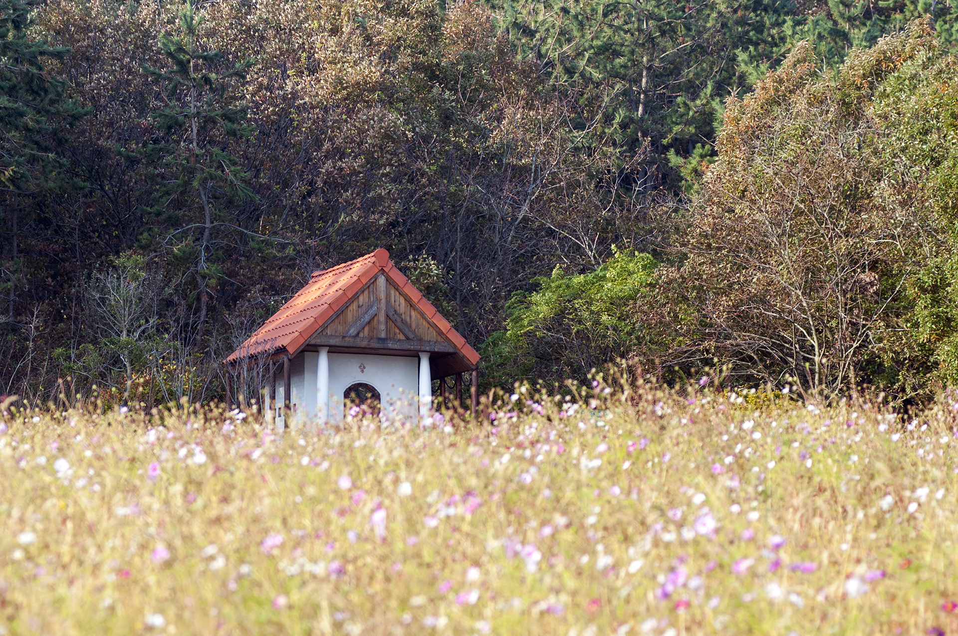 코스모스 밭 끝에 위치한 숲속의 작은 예배당
