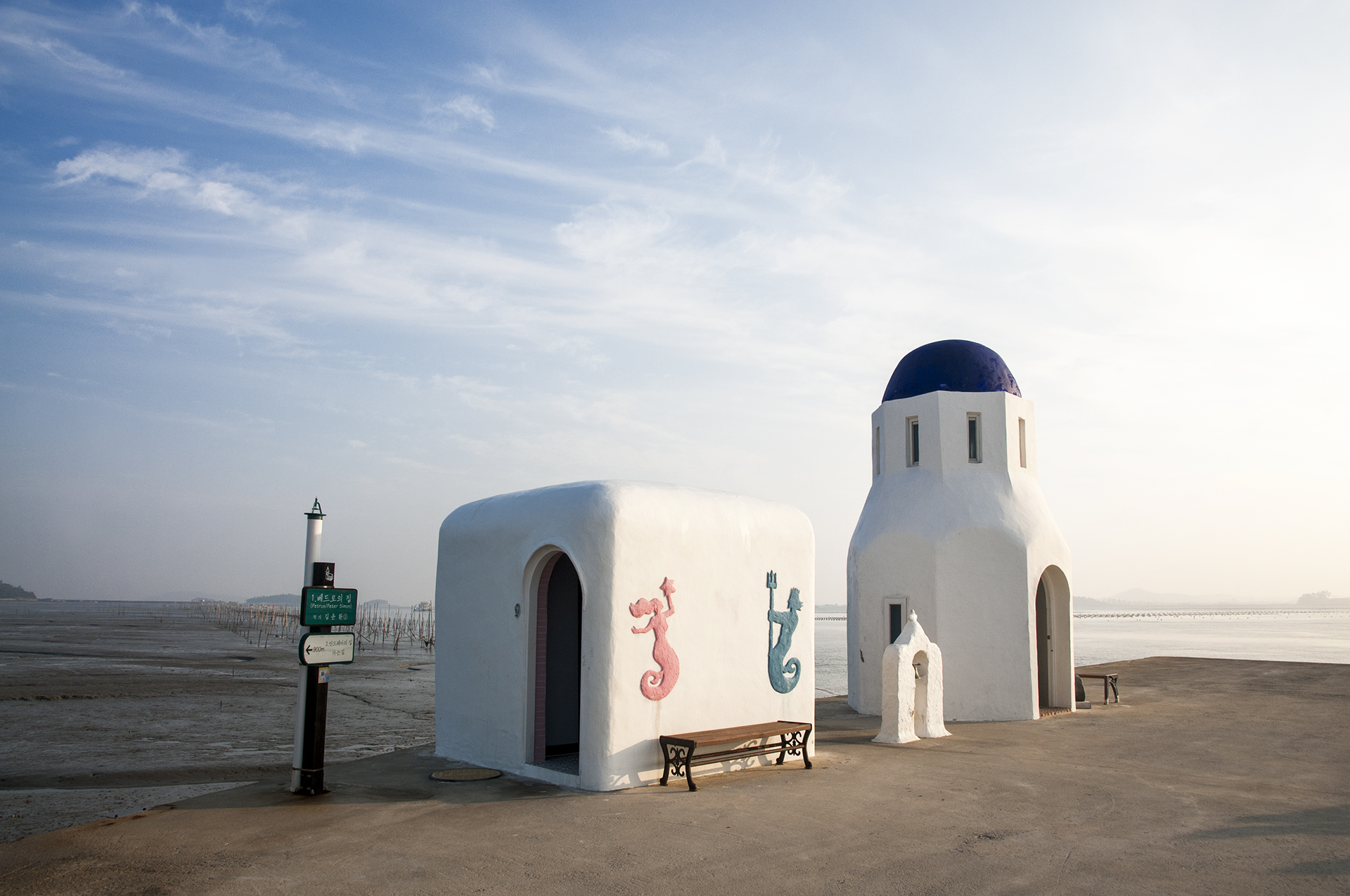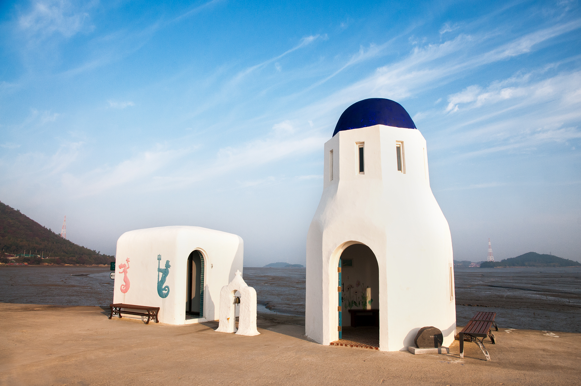 오른쪽의 둥근 예배당과 왼쪽 사각 건물은 화장실이지만 하얗게 지어져 바다와 잘 어울린다.