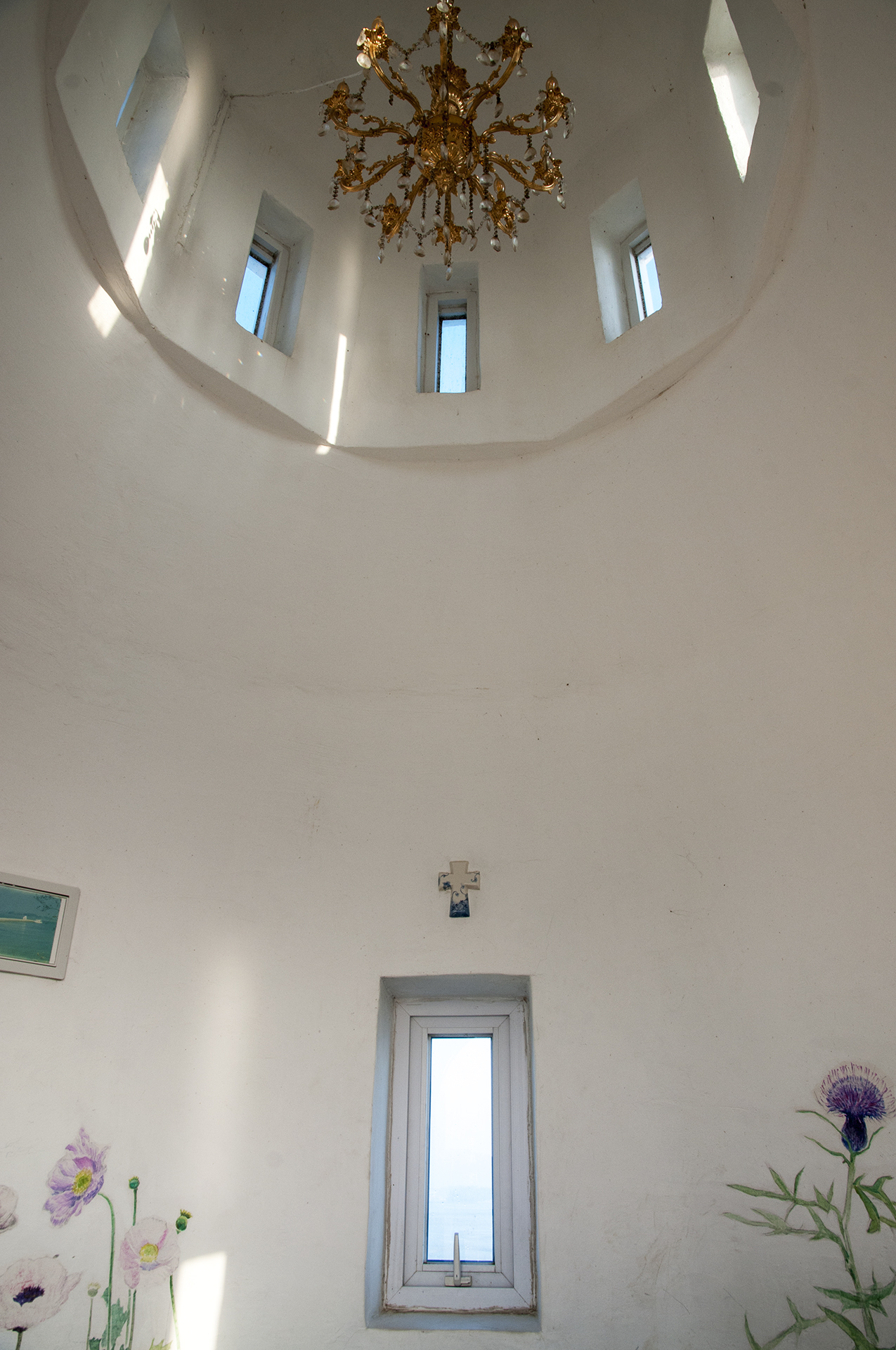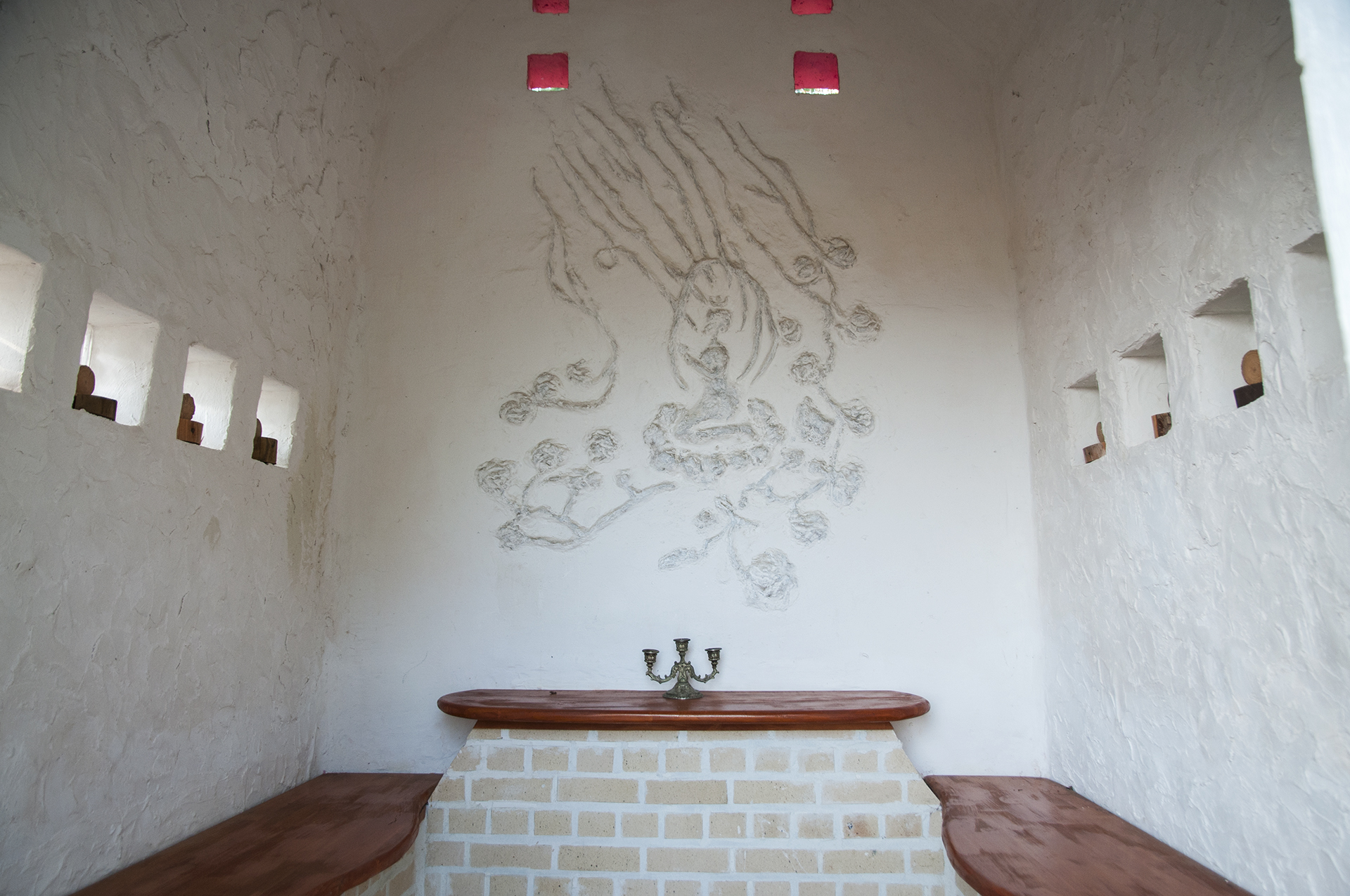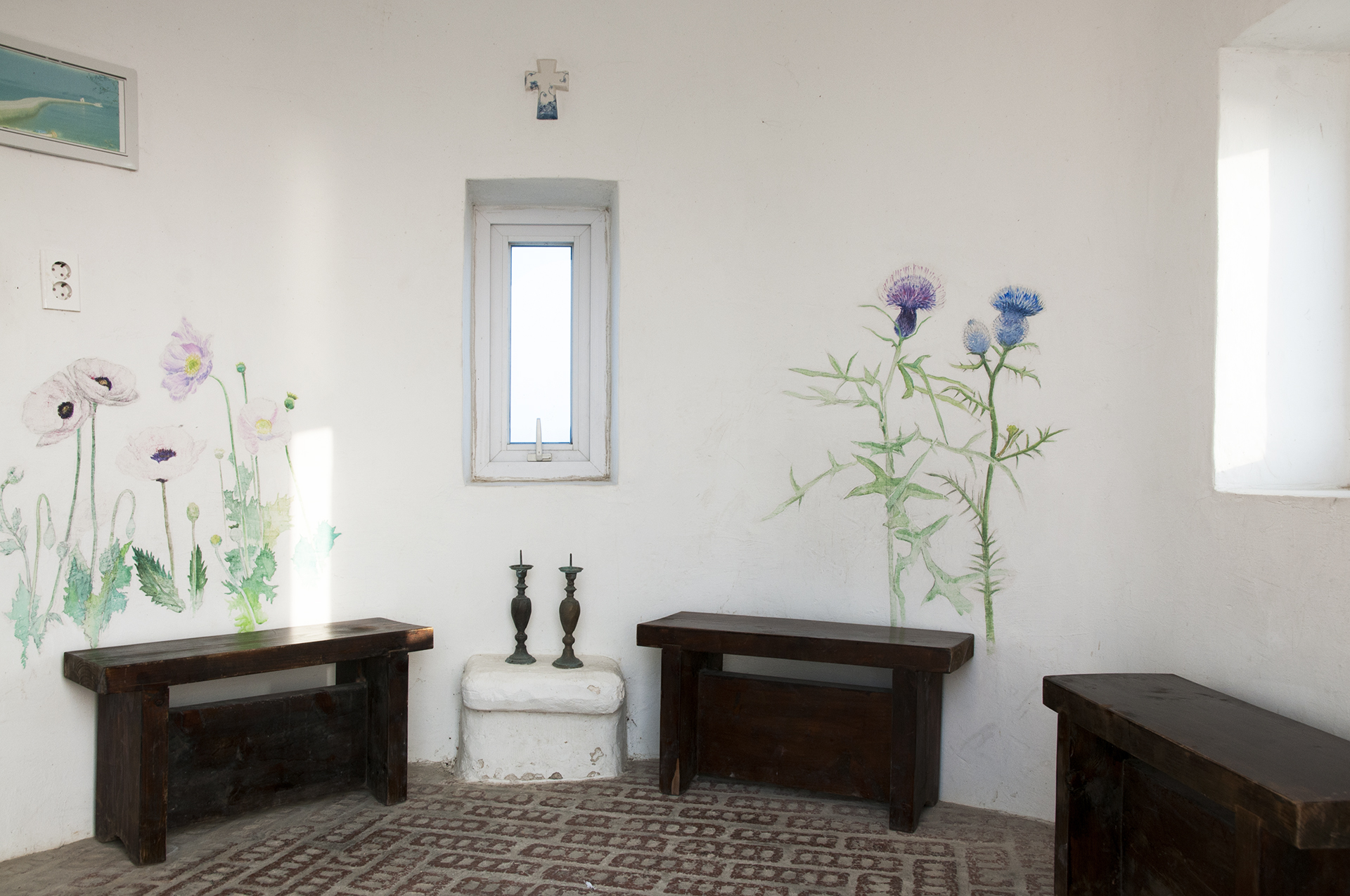 내부에는 꽃양귀비와 엉겅퀴가 수채화로 그려져 있고, 촛대와 기도할수 있는 탁자, 바다가 내다보이는 창이 세로로 나 있다.