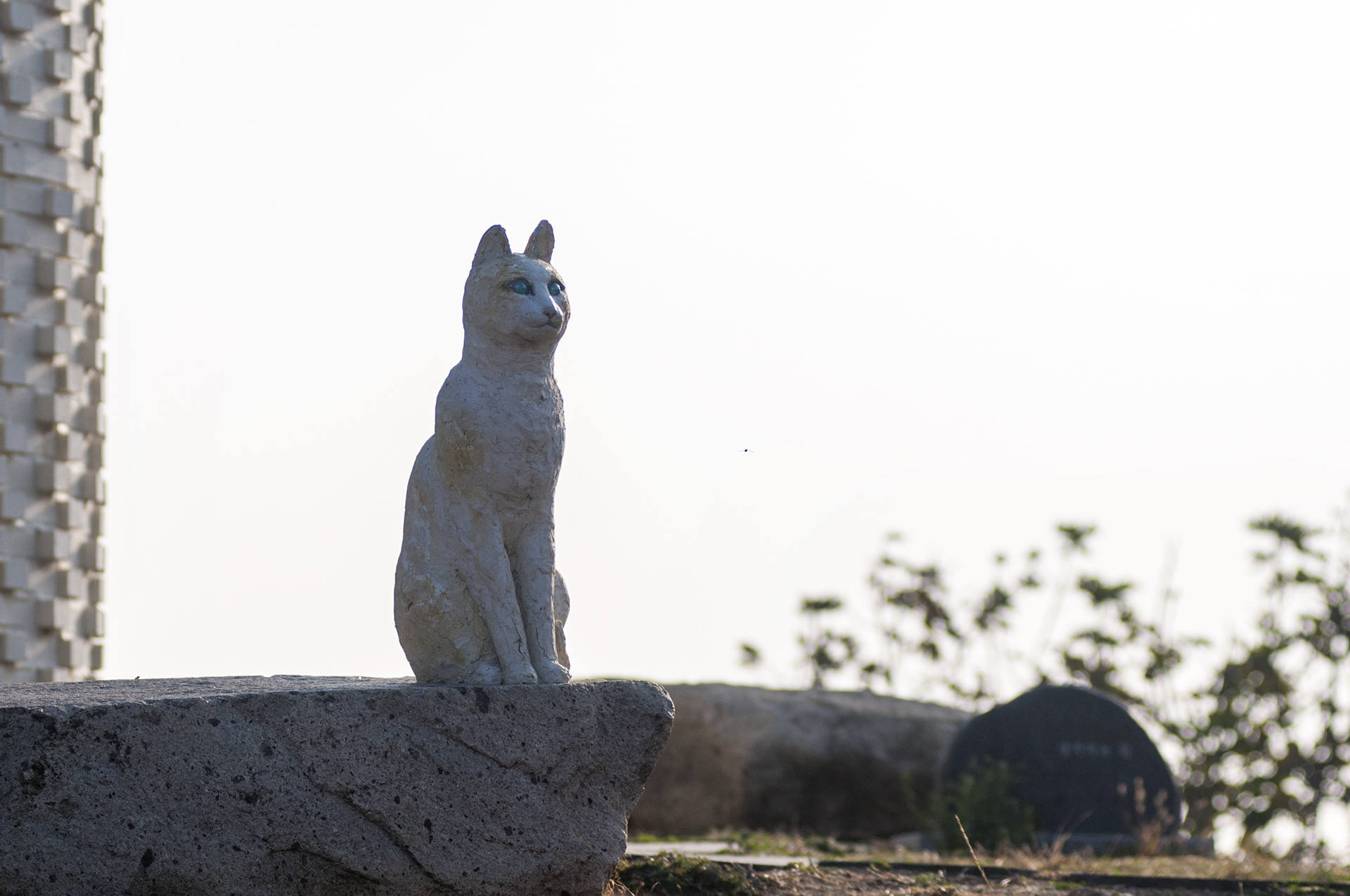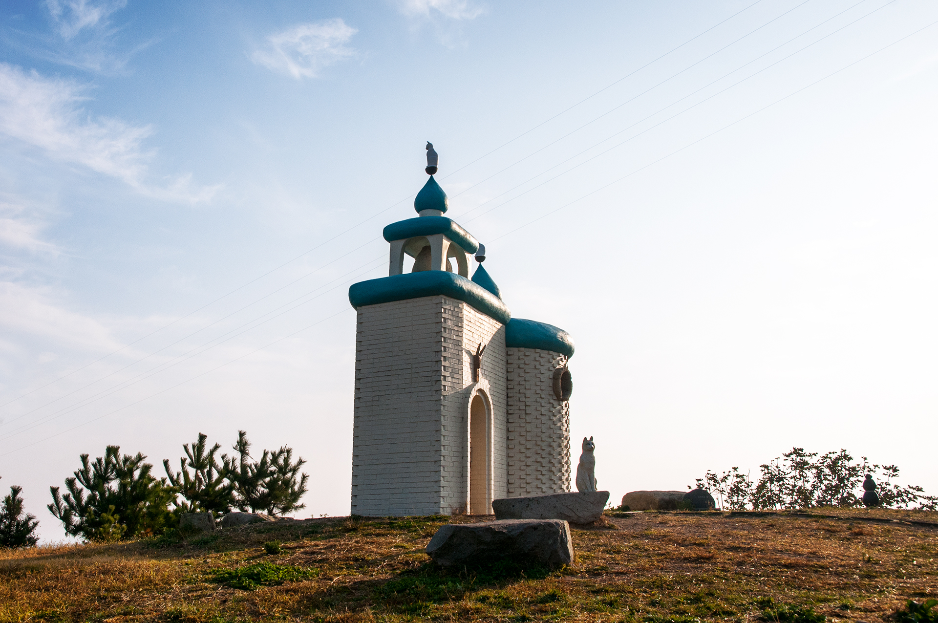 고양이가 많아 섬의 수호신으로 여겨지던 고양이가 우아한 자태로 작은 예배당 앞을 지키고 있다.