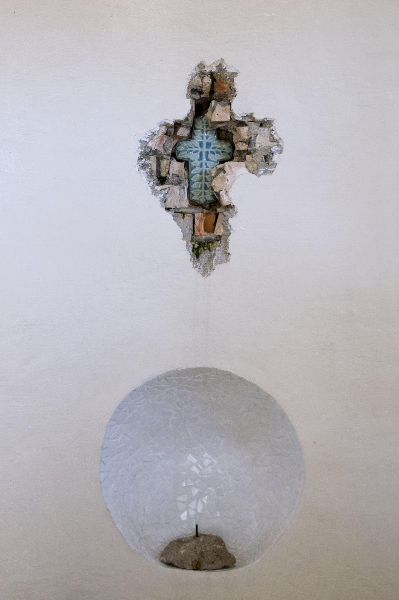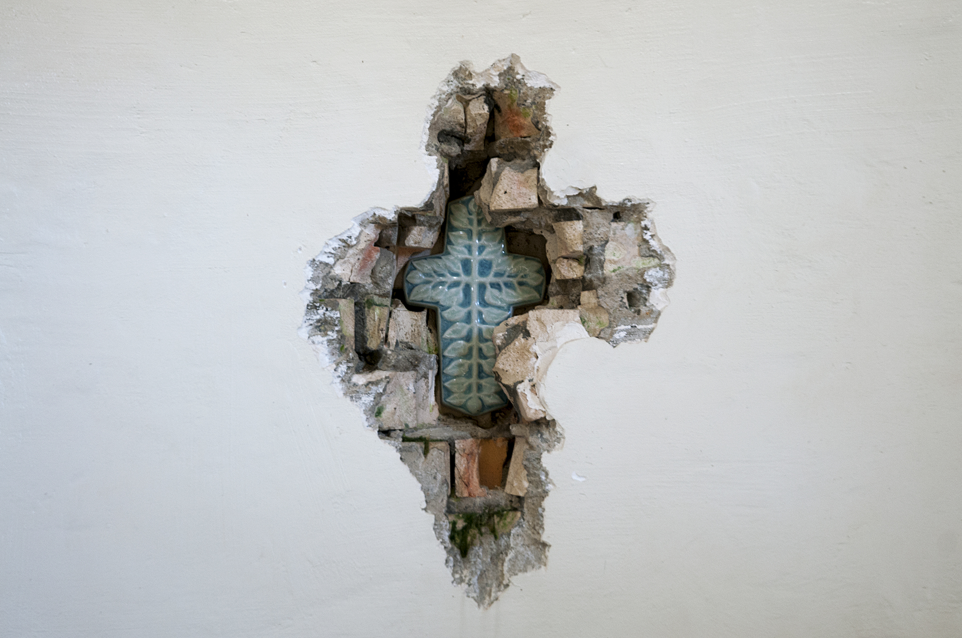 벽돌이 파인 안쪽에 박혀있는 십자가가 강렬한 느낌을 준다.