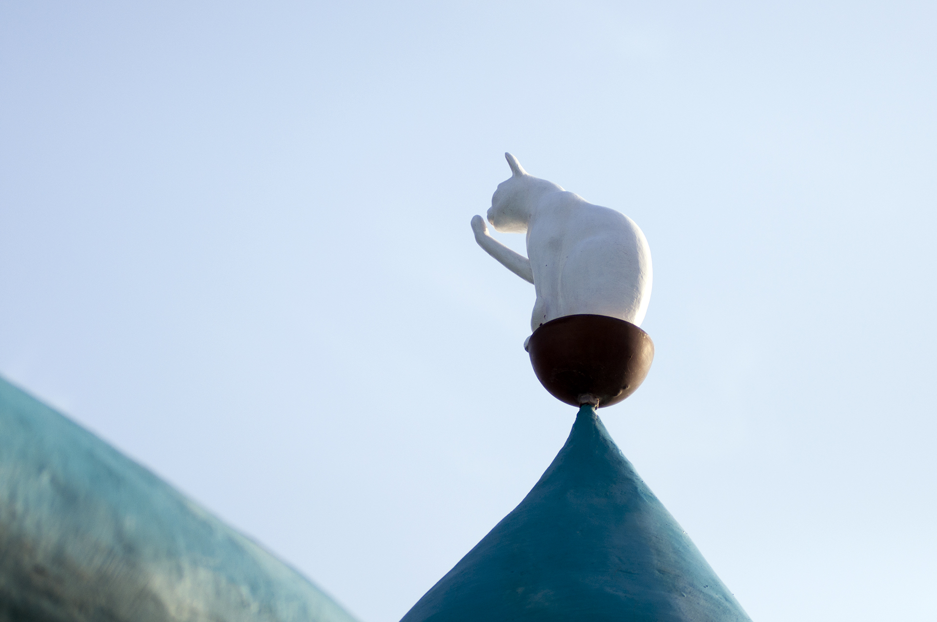 두개의 높고 둥근 지붕 첨탑에는 종처럼 매달린 여물통을 볼수 있고, 그 꼭대기에 고양이가 앉아 있다.