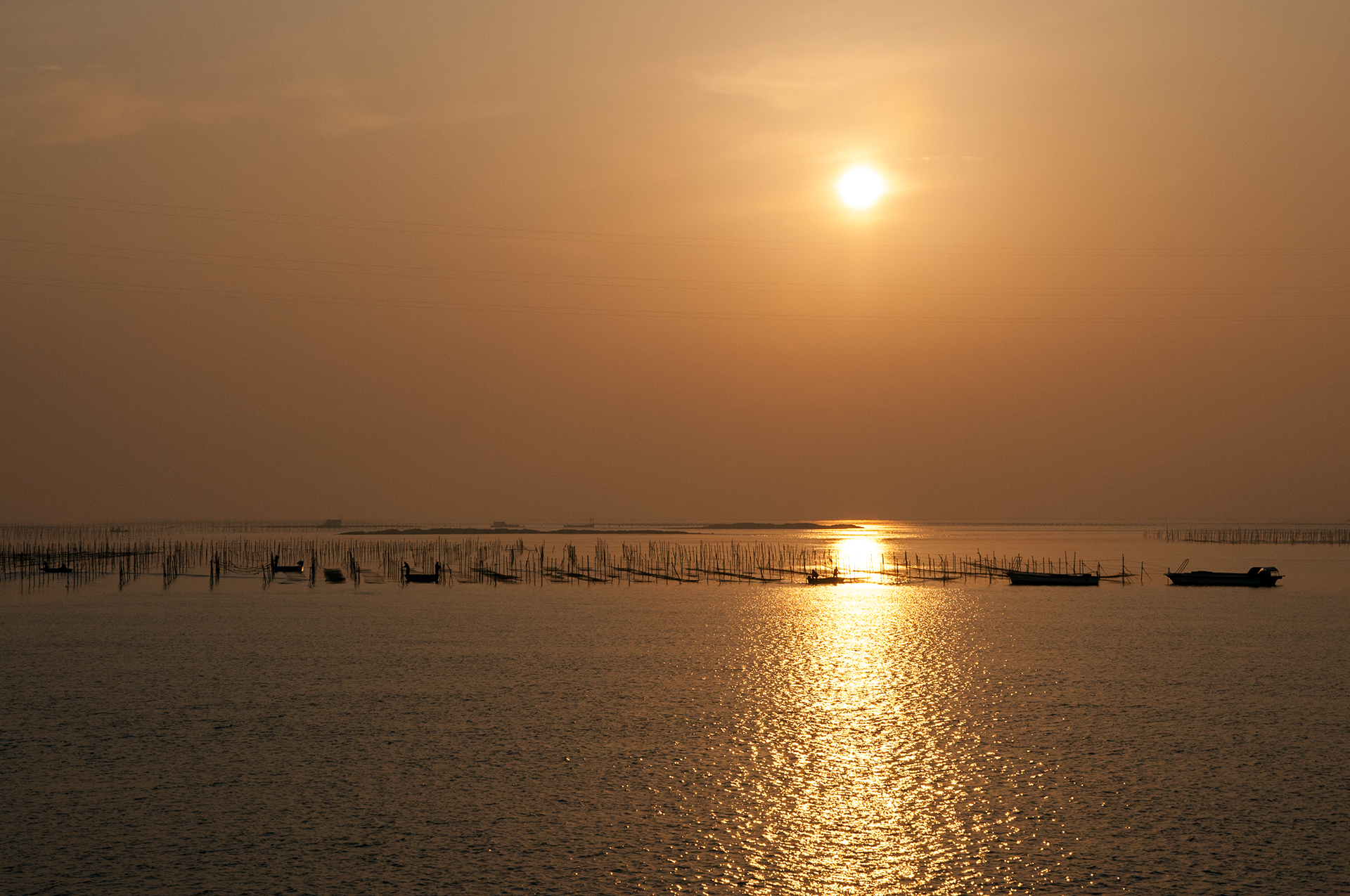 한창 작업중인 김 양식장 위에도 해가 드리우고~
