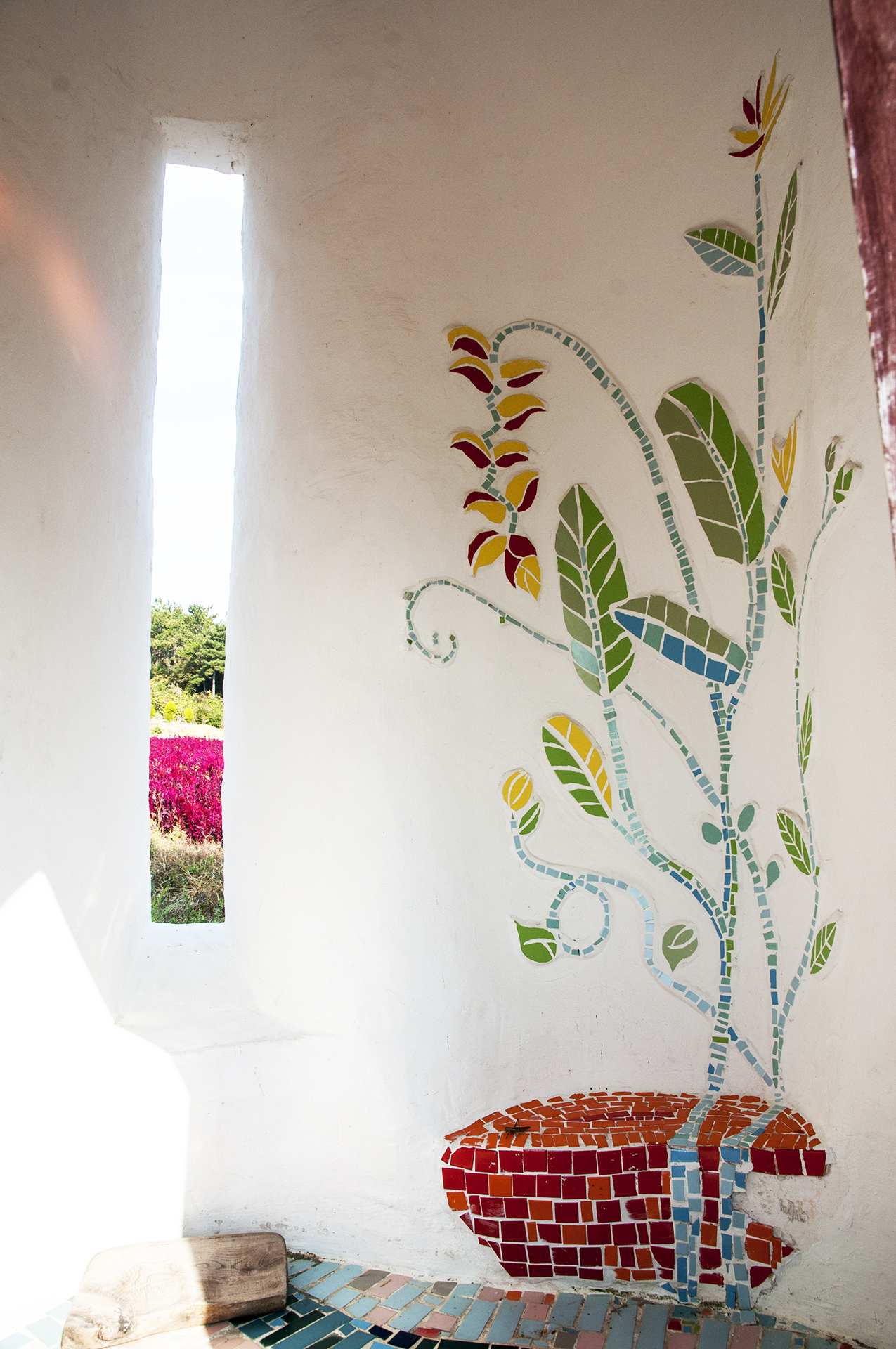 벽면 창은 돌절구를 뚫어 사용해 주민의 삶과 풍경을 작은 예배당에 담았다.