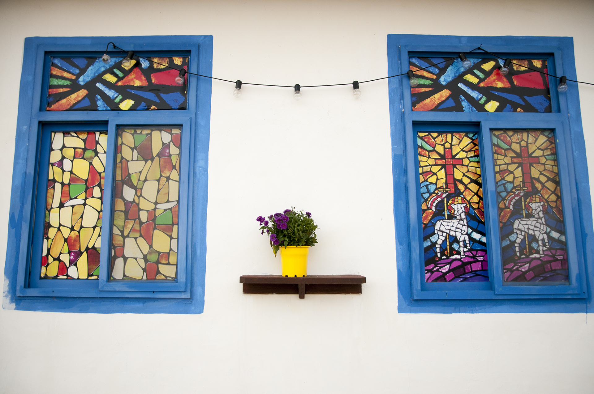 지붕은 바다를 상징하는 파도이고, 커다란 물고기 모양의 스텐드글라스를 전면에 배치하여 어부의 집을 만들었다.