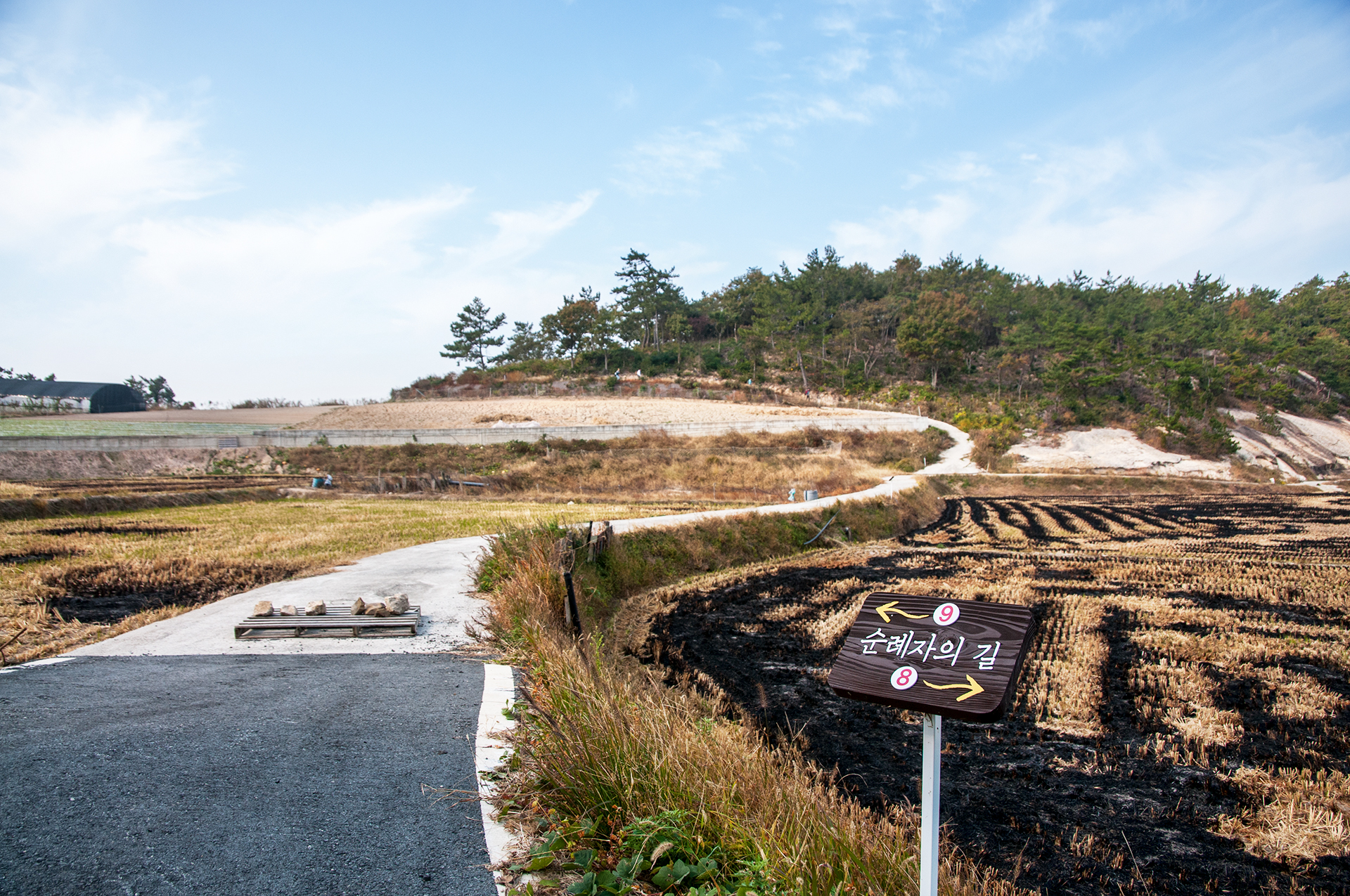 벼베기를 끝낸 논에는 병충해 예방을 위해 불태운 흔적이 보이고, 그 논뚝길로 순례자의 길이 열려있다.