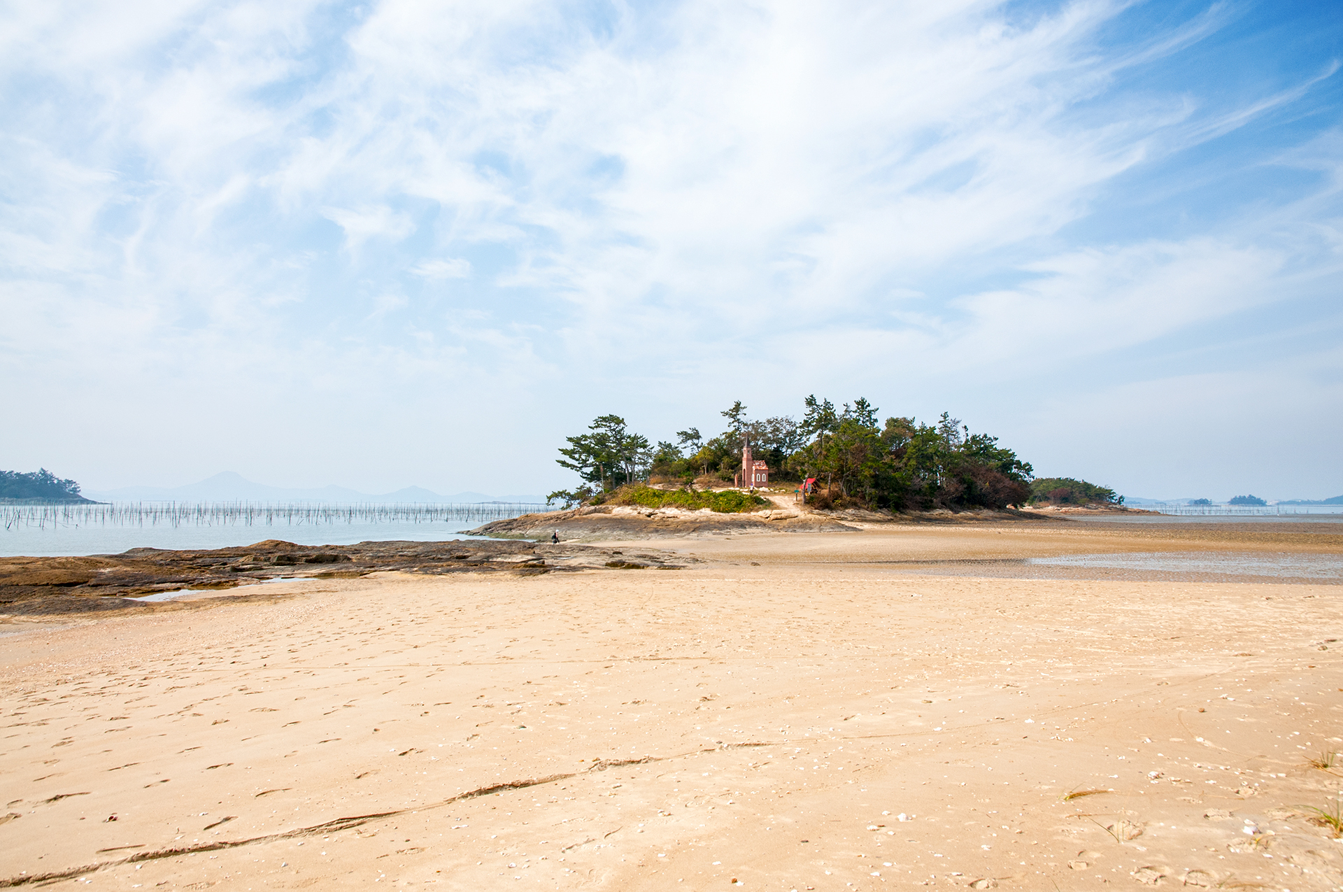 대나무길이 끝나는 지점에 광활한 모래해변이 나타나면서 딴섬으로 들어가는 길이 보인다. 길이 사라지기에는 아직 여유가 있었다.