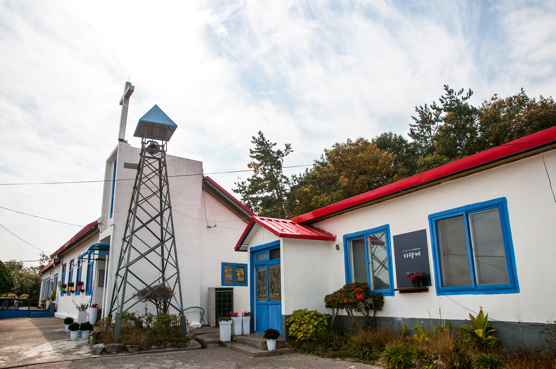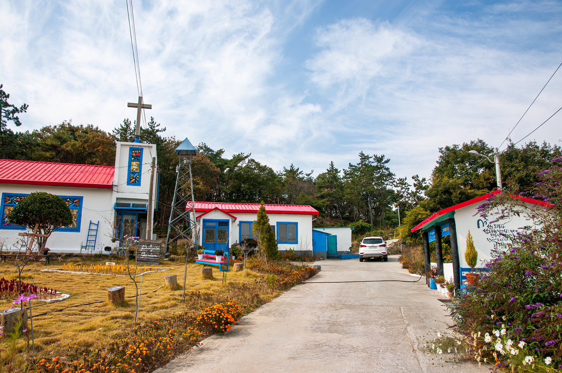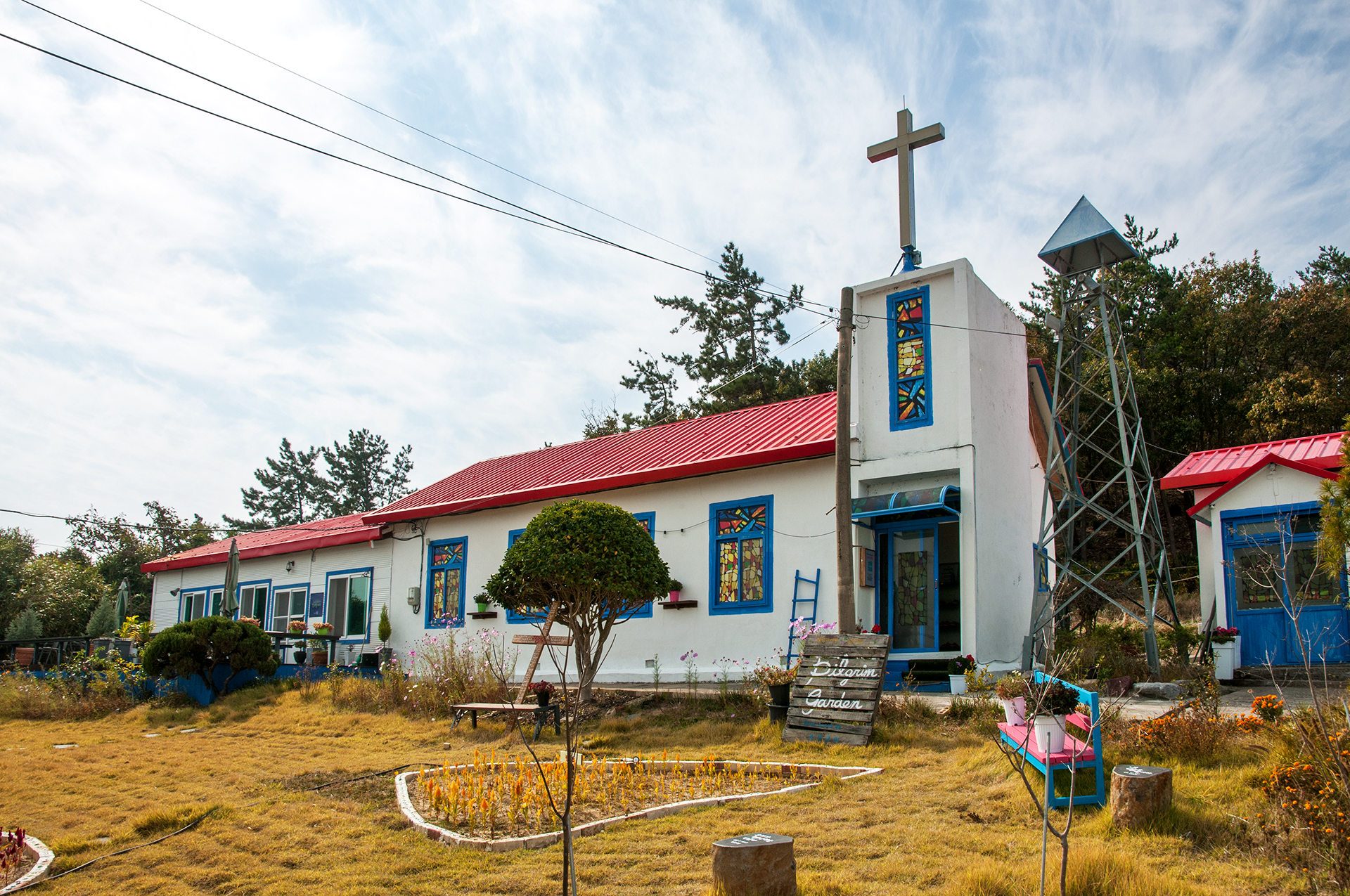 노둣길을 건너가기 전에 반대방향으로 잠시 걸어가면 빨간지붕에 파란 창틀이 예쁜 소악교회를 만날 수 있다.