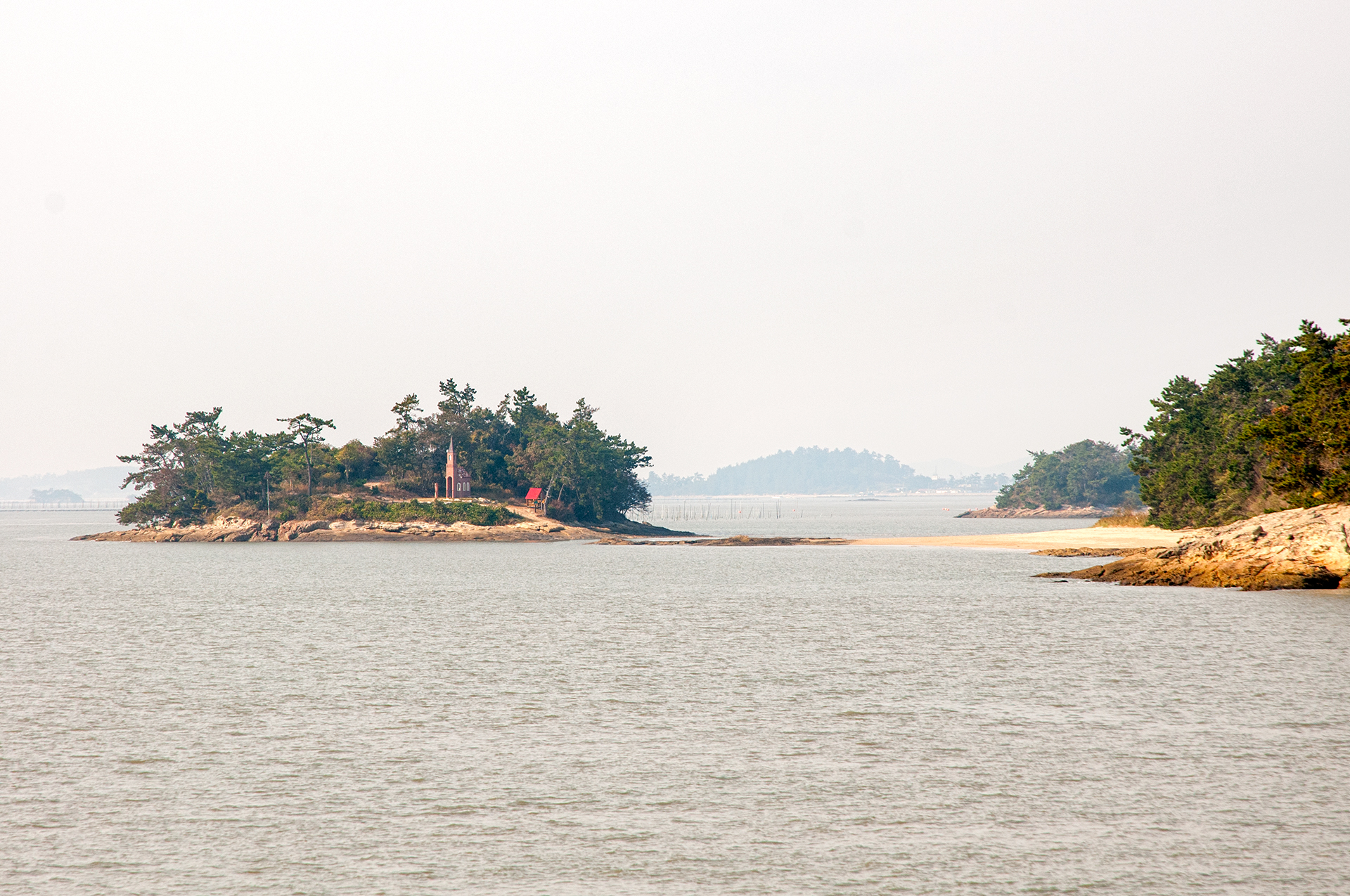 배에서 바라본 딴섬의 가롯 유다의 집, 물이 들어와 길이 끊겨 있고 딴섬은 진정 섬이 되고 있었다.