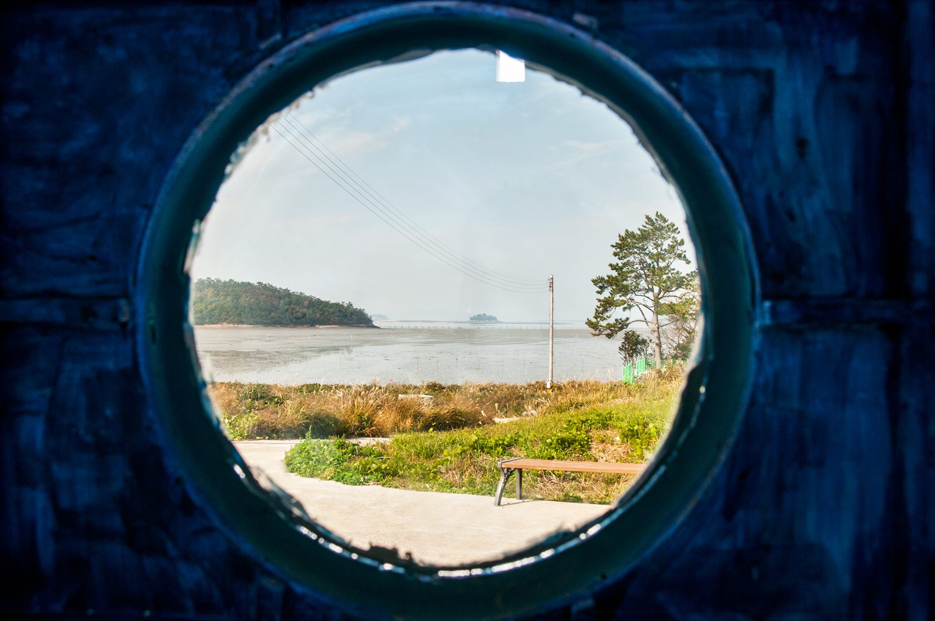 둥글고 푸른 창을 통해 바다가 내다보이는 풍경이 아름답다.