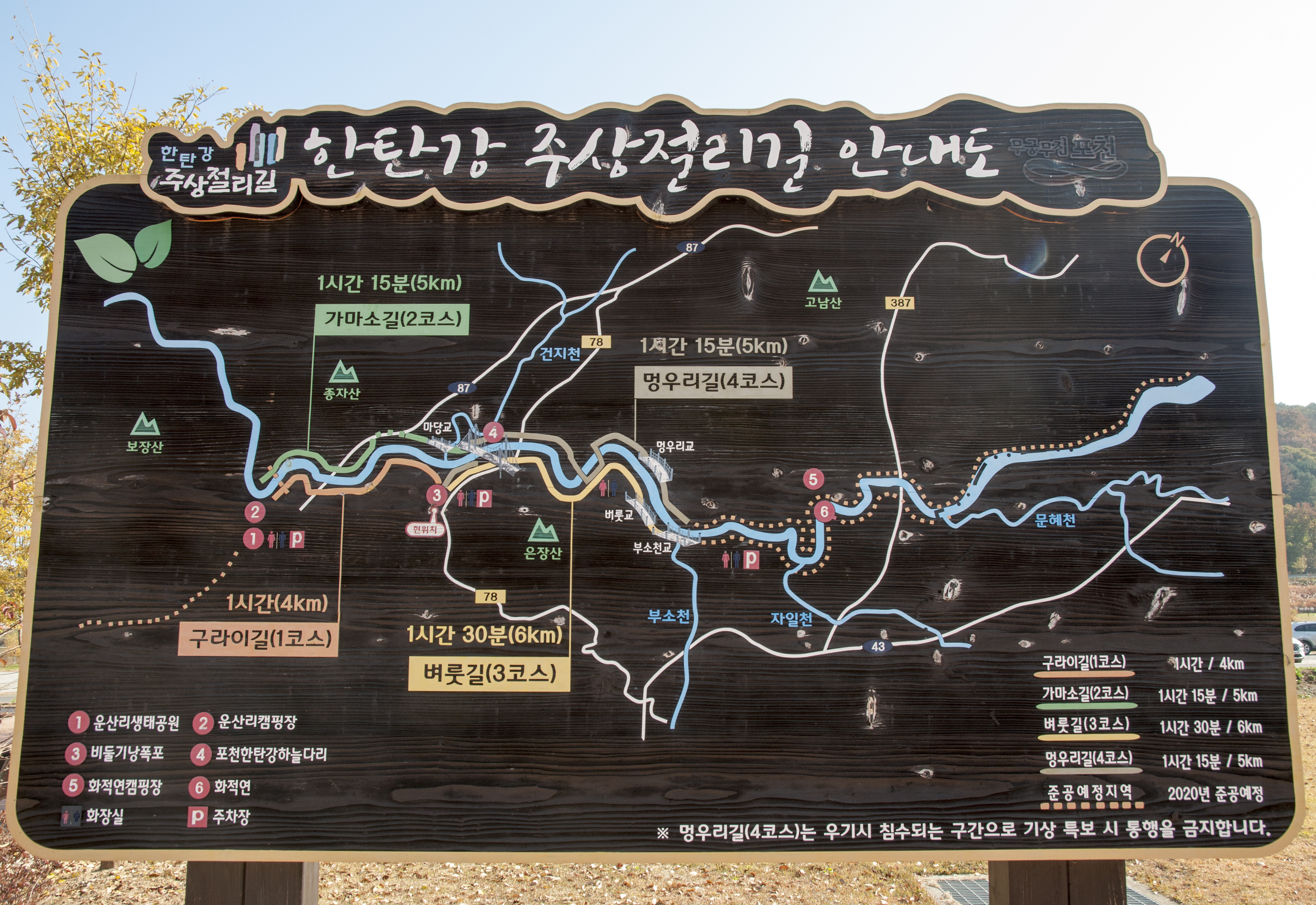 정보를 얻으려는 중 제2하늘다리가 완공됐다는 글이 있는가하면 통행금지라는 글도 있고, 한탄강변 데크로드는 걸을수 있는지도 궁금하고,, 해서 직접 걸어볼 참이다. 1시간 소요 4km로 안내되어 있는데 실제 걸은 거리는 4.95km, 1시간 22분이 걸렸다.