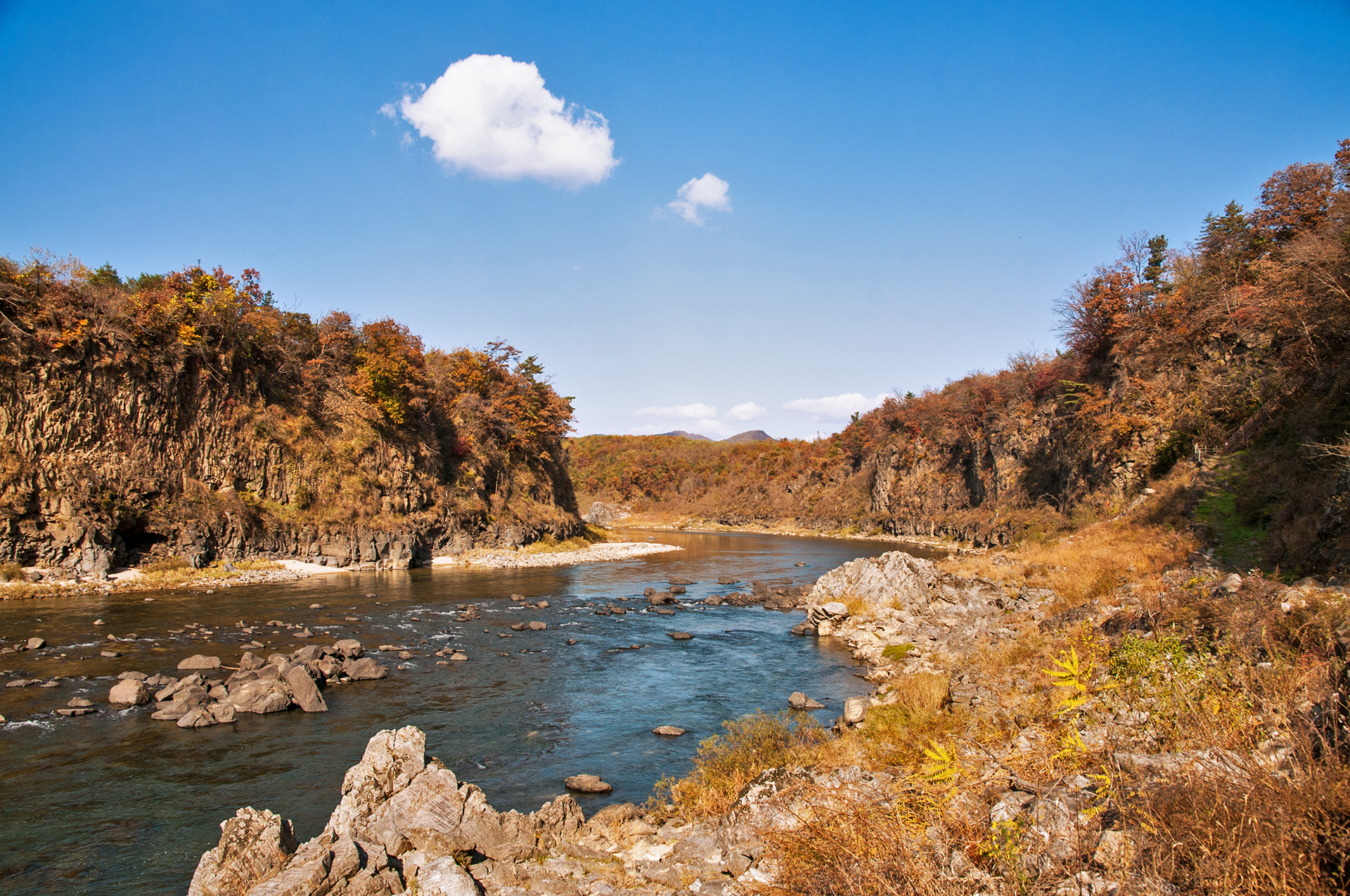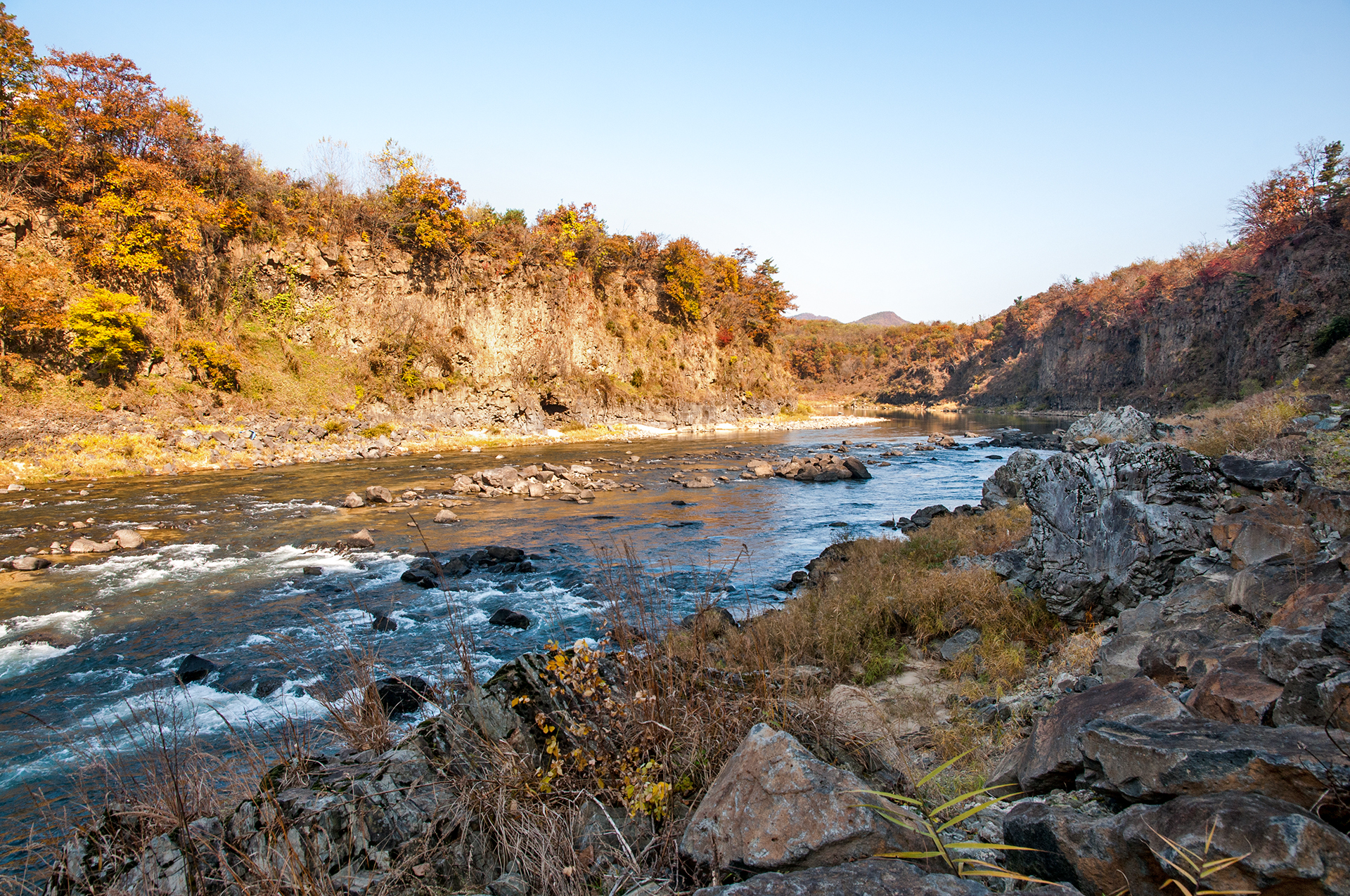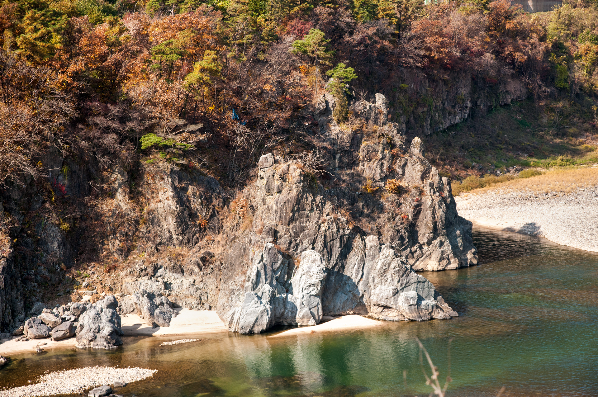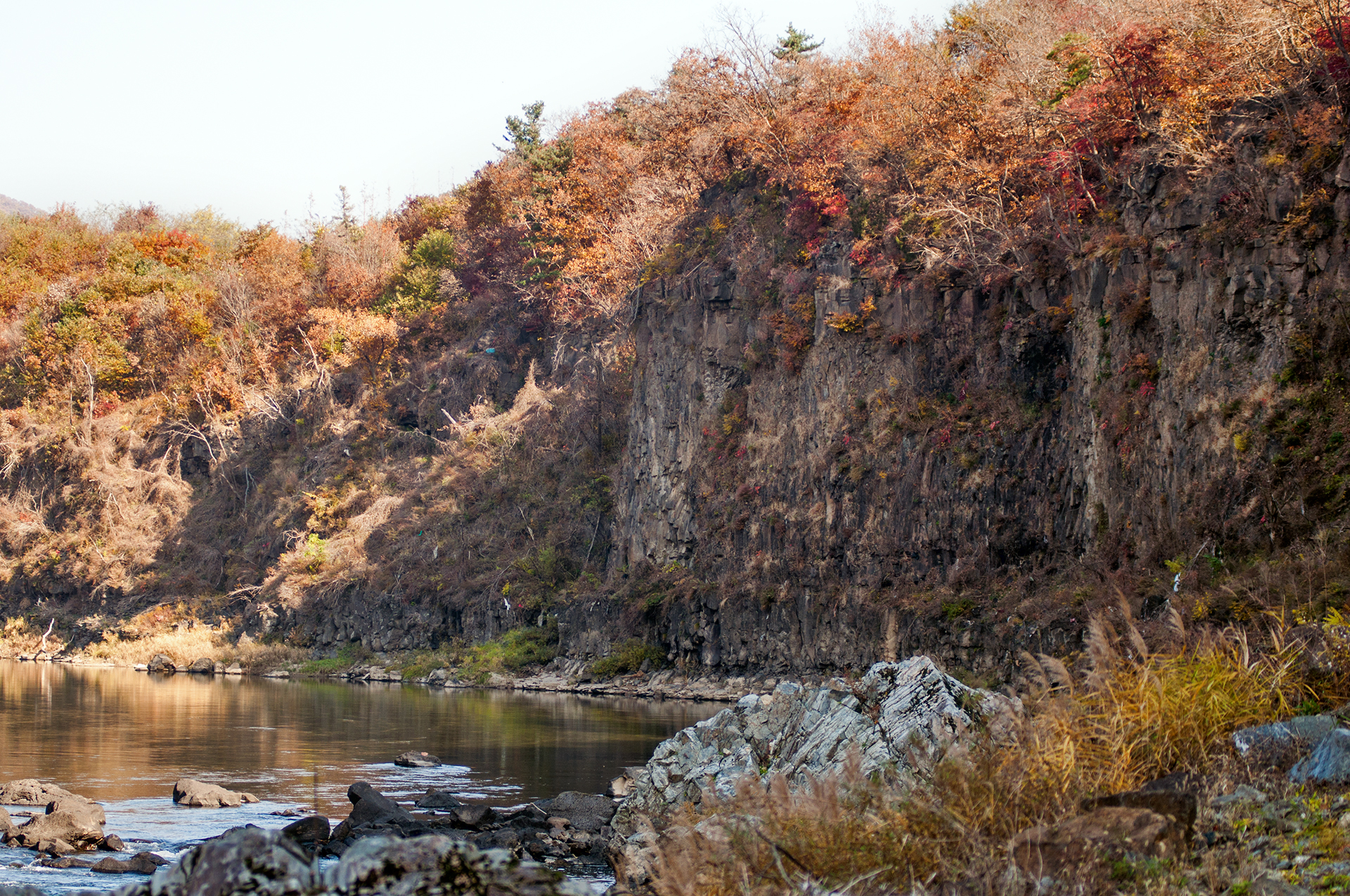 길게 이어지는 주상절리를 강물은 물빛에 고요하게 담아내며 유유히 흘러가고 있다.