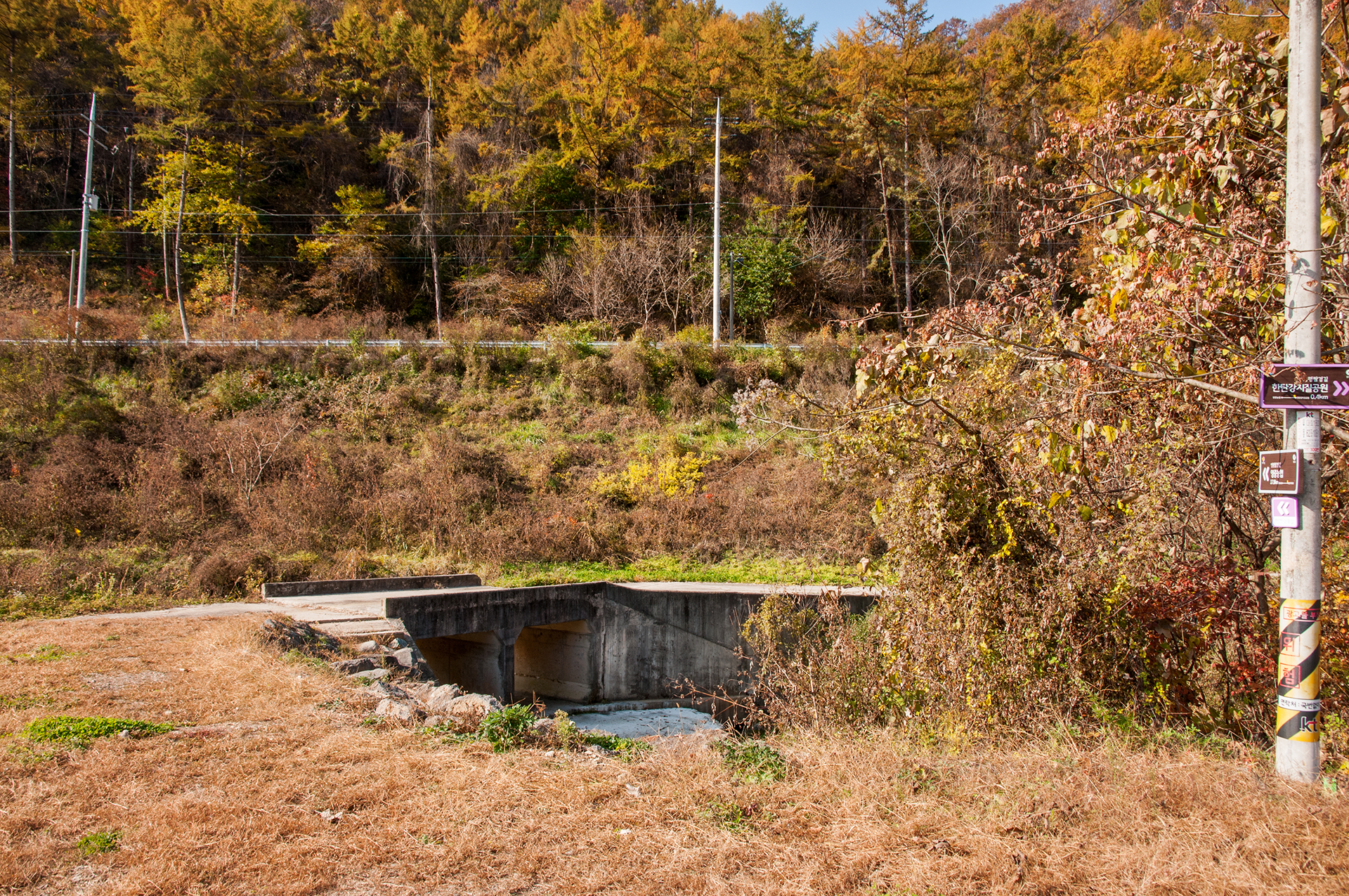 도로로 나가기 전 우측 방향으로 다리를 건너간다.