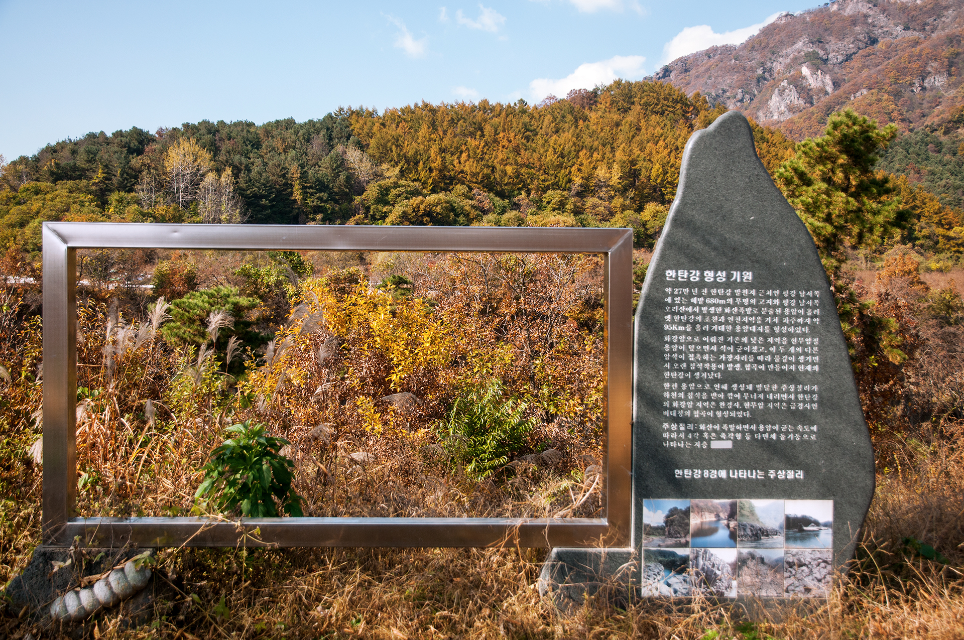 한탄강 형성 기원에 대한 설명이 적혀 있고 포토 액자 프레임이 설치된 곳이지만 잡목만 우거진 풍경으로 이 멋진 길이 관리가 안되고 있는 점이 아쉬운 부분이다.