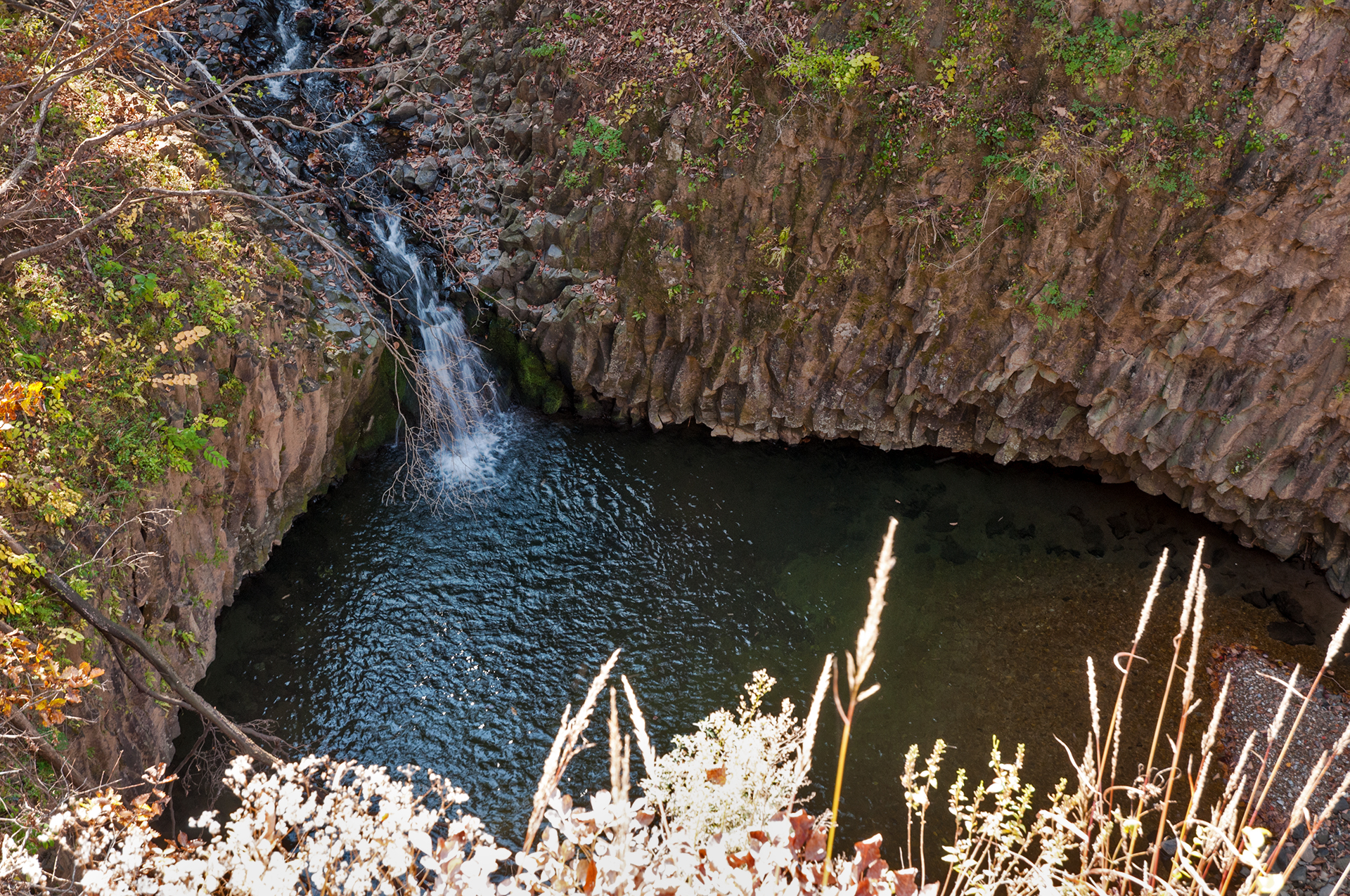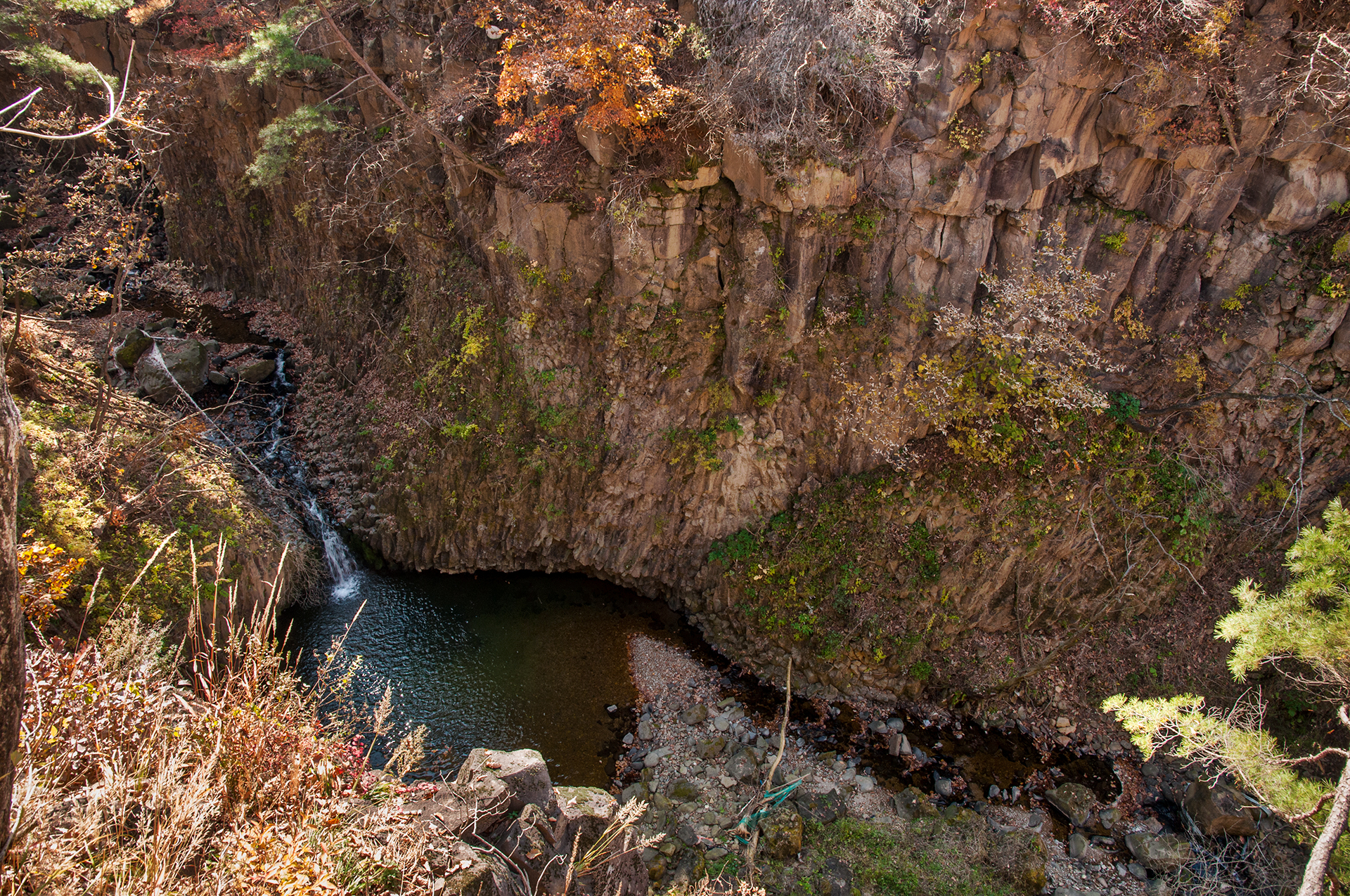 작은 폭포는 주상절리로 벽을 두른 곳에 깊은 소를 형성하며 물길이 한탄강으로 이어진다.