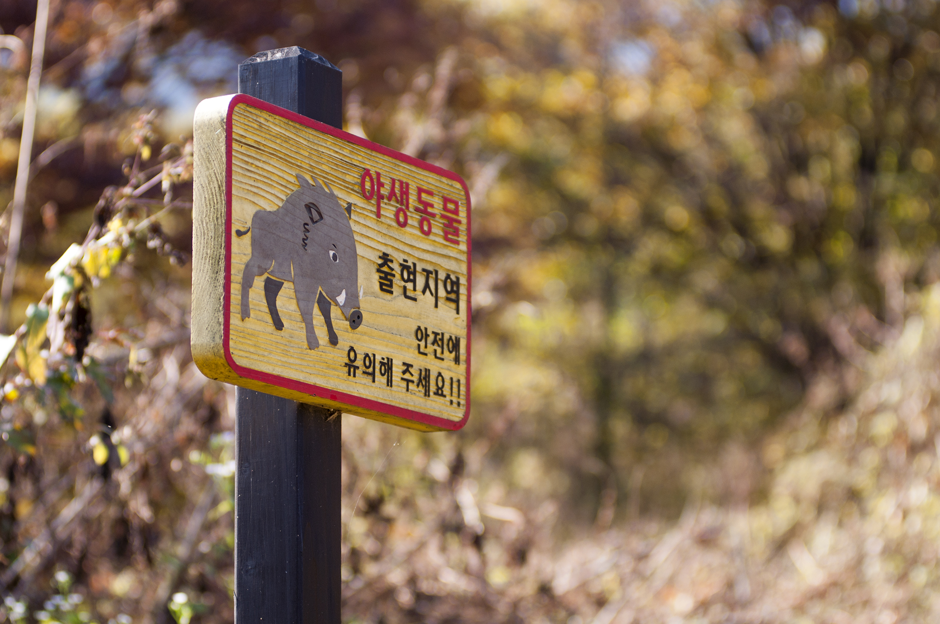 야생동물 출현지역이니 안전에 유의하라는 팻말,, 도보여행자들의 걸음을 위축되게 만드는 멧돼지 그림!!