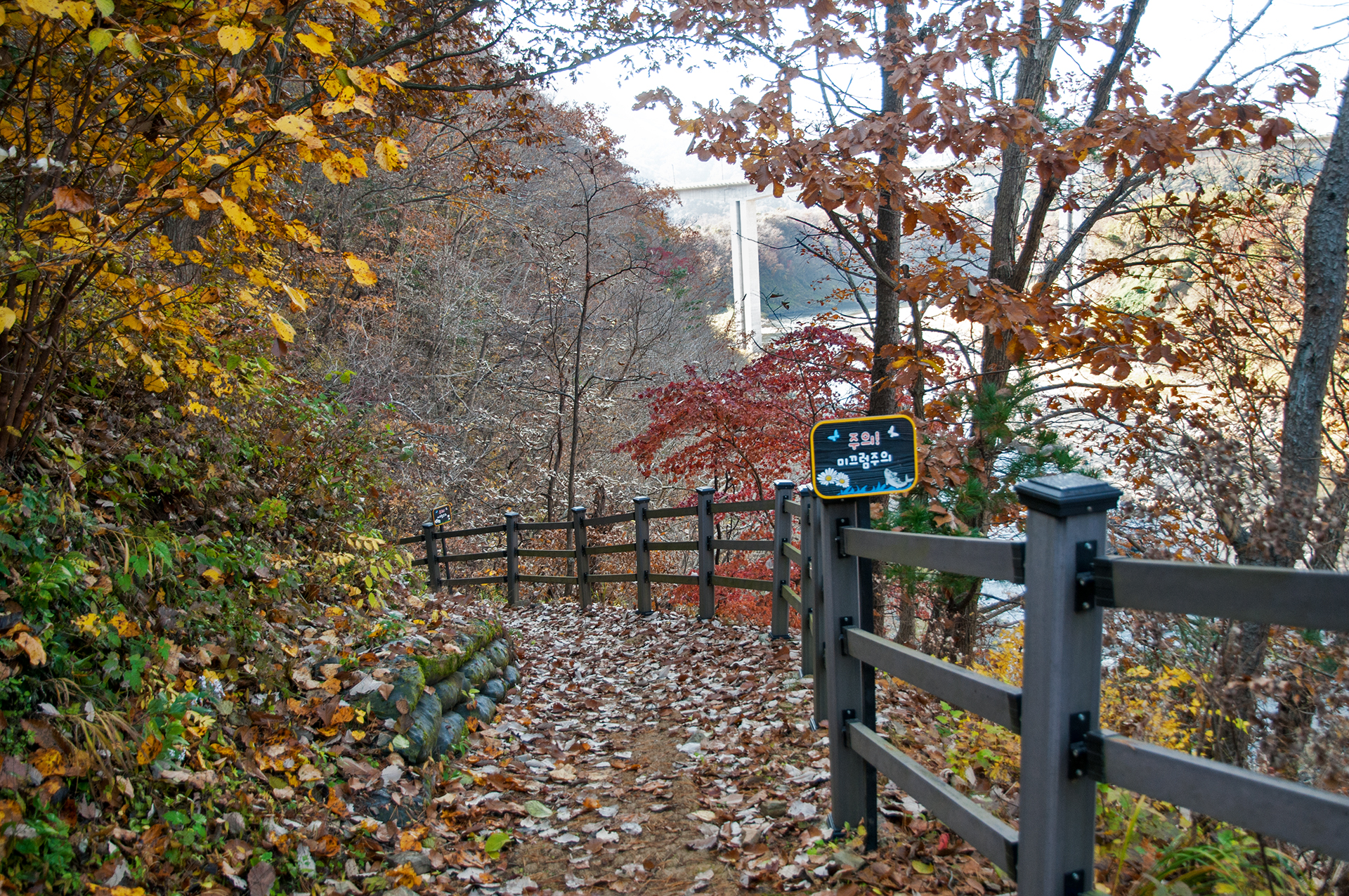 낙엽이 많아 미끄러운 내리막길