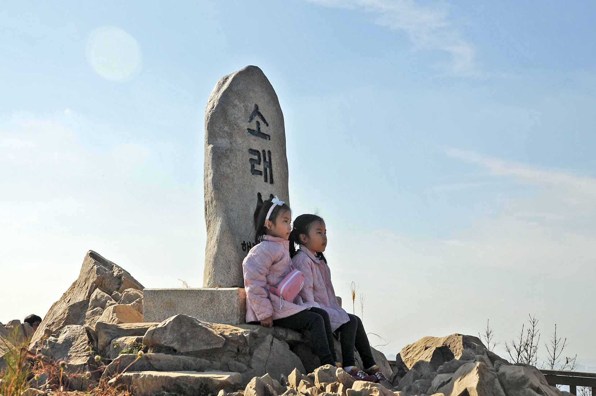 자매로 보이는 귀여운 두 아이가 정상석 앞에서 인증사진을 찍고 있다.