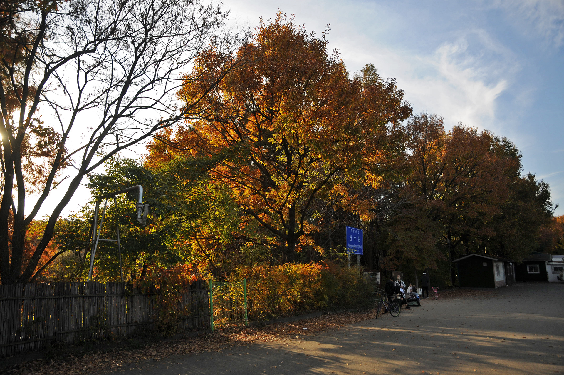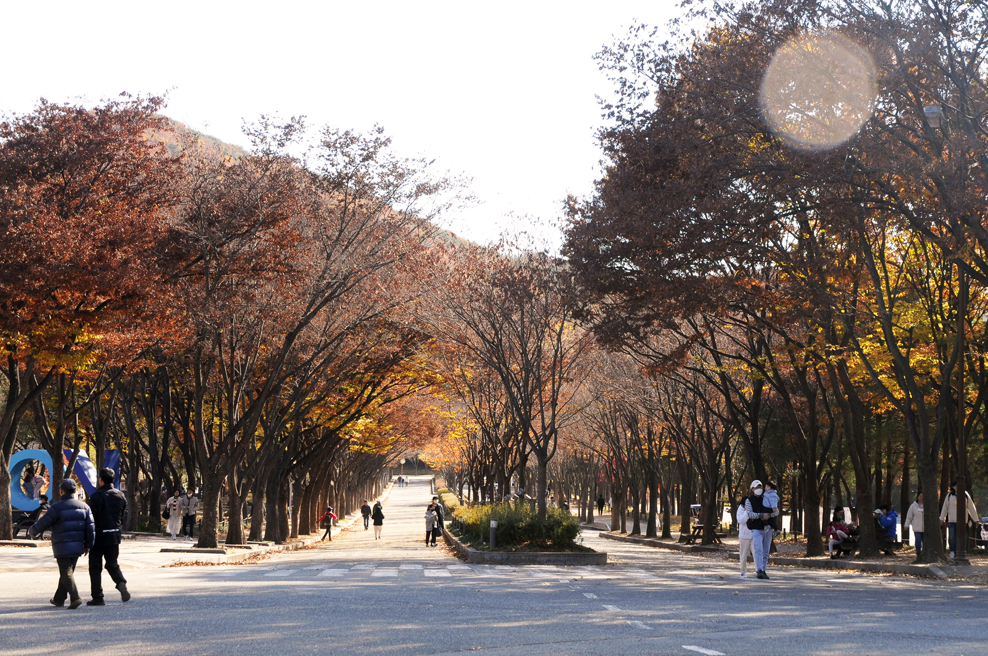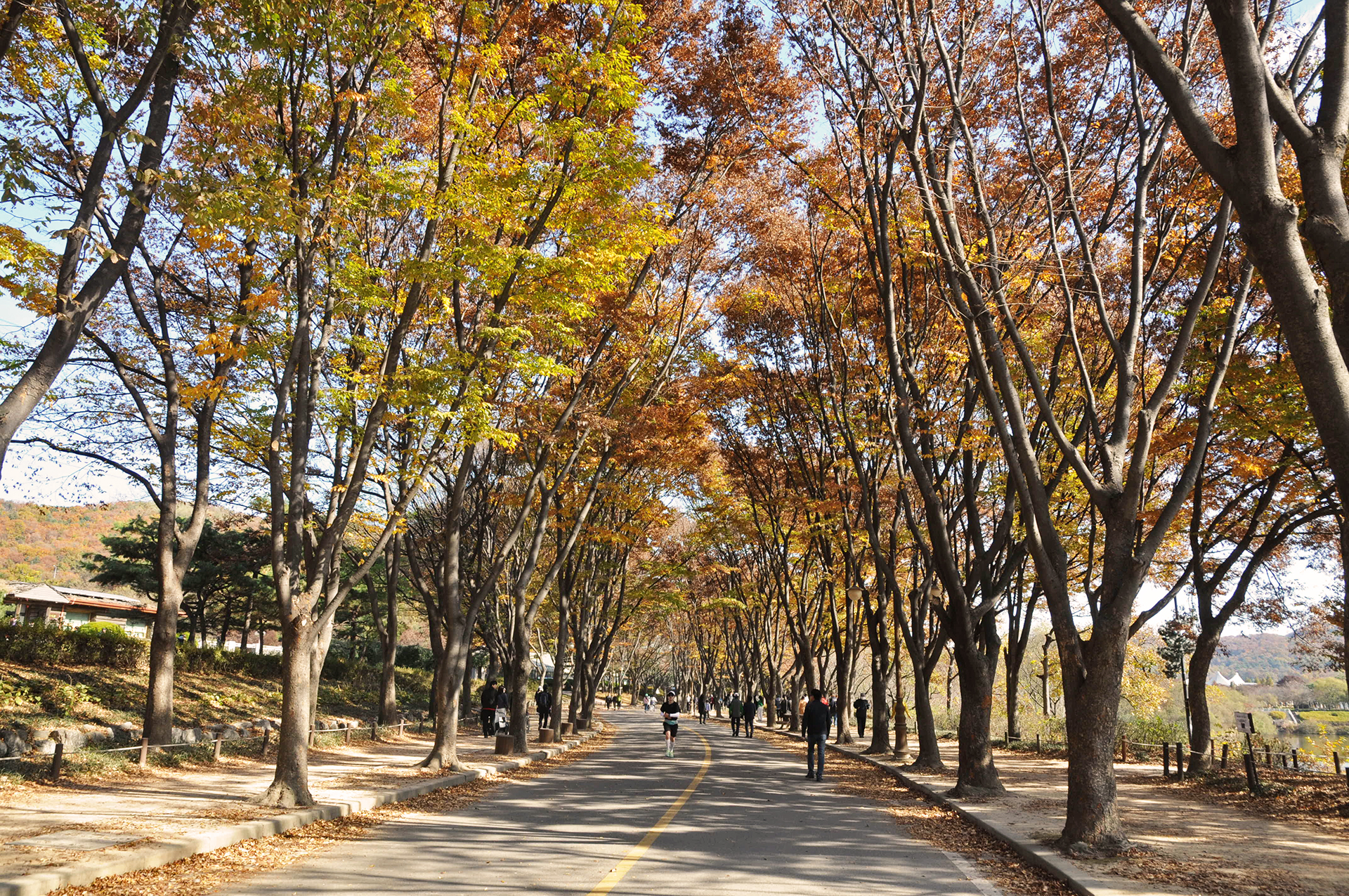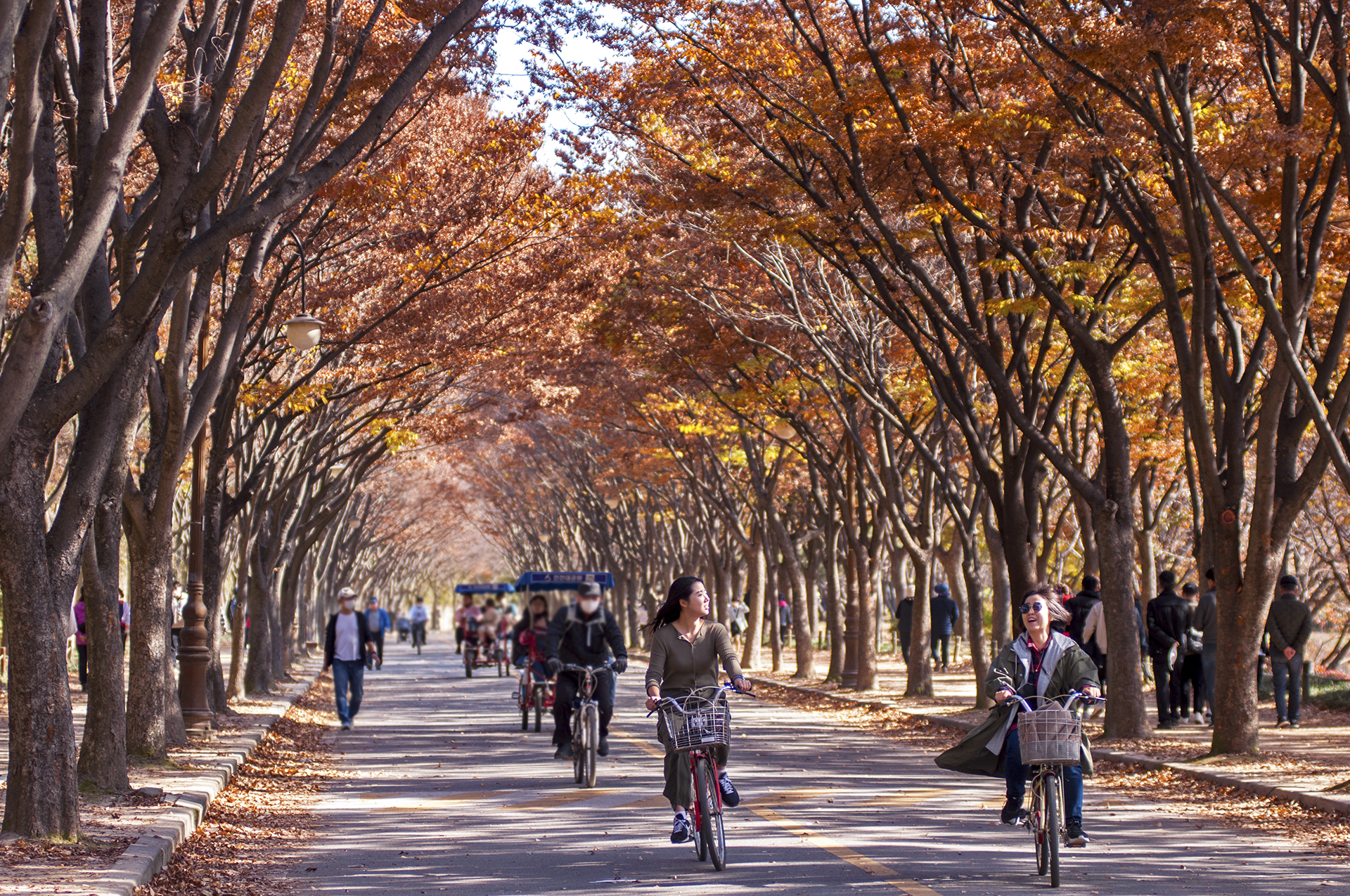 느티나무길은 여전히 가을 풍경이 남아 있고, 많은 사람들이 휴일을 즐기고 있다.