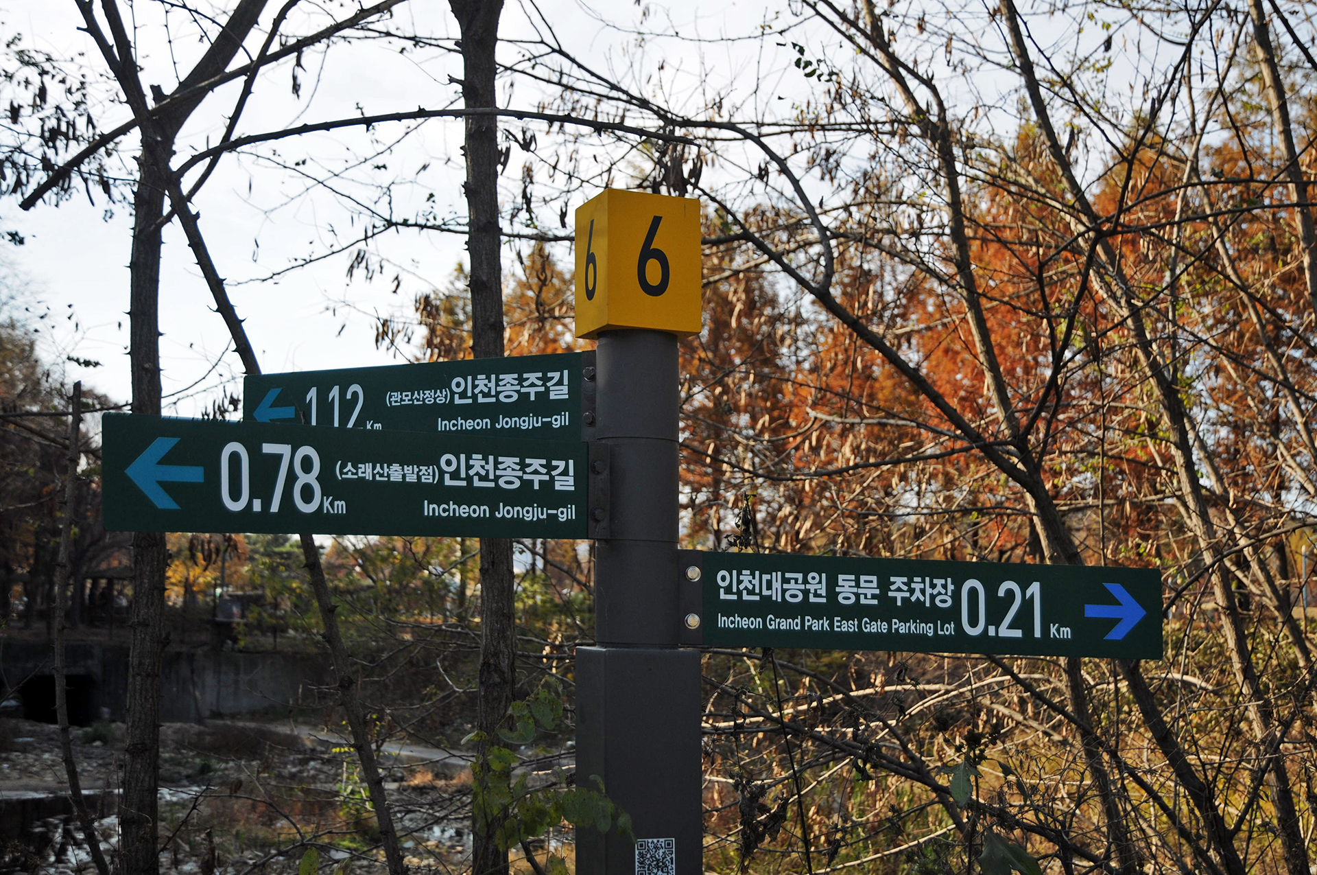 하천을 따라 끝까지 가면 인천종주길 이정표를 만날수 있는데, 이곳에서 좌측길 관모산 정상 방향으로 가면 된다.