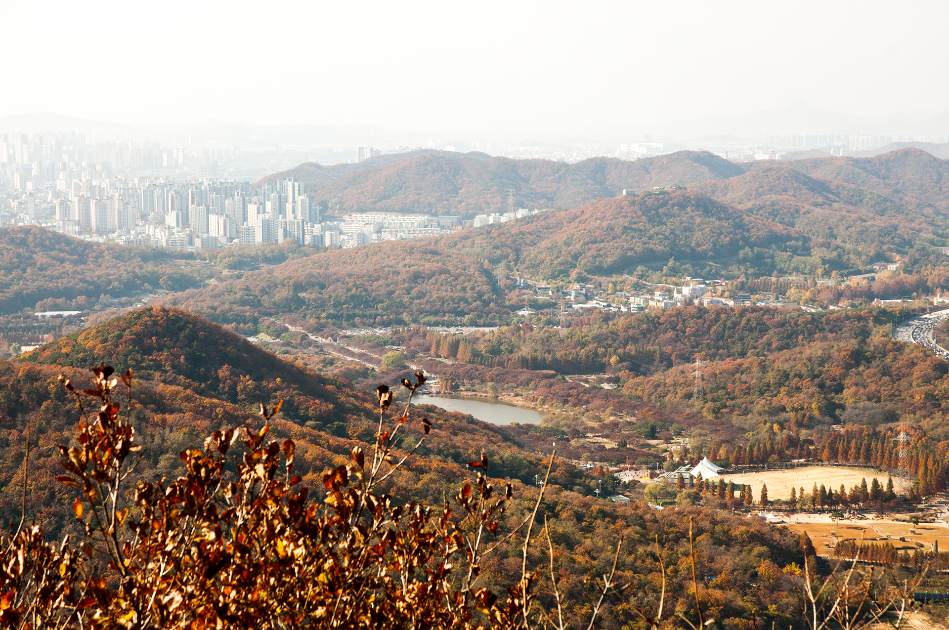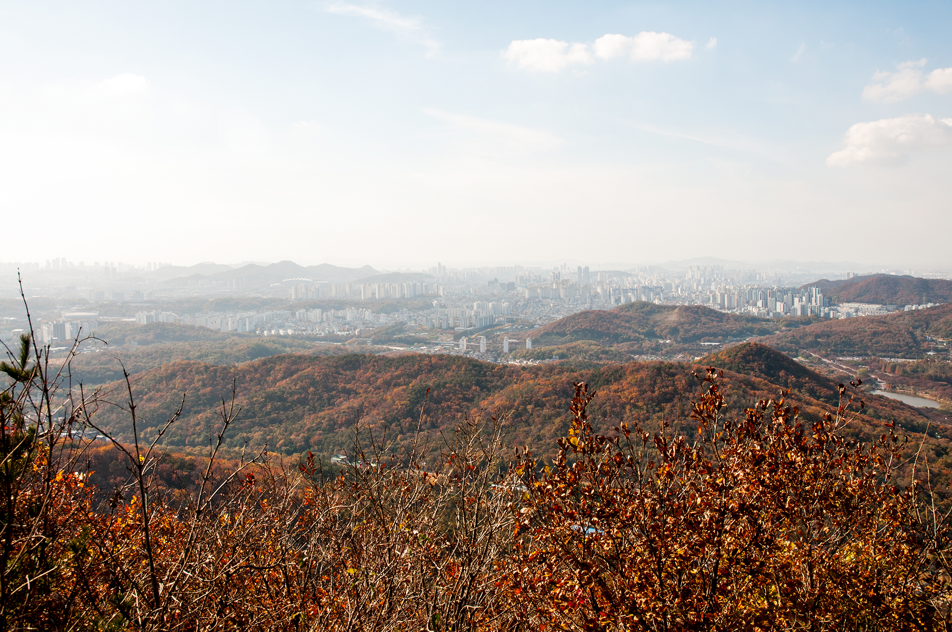 넓어 보이던 인천대공원 호수가 작은 연못처럼 보이고, 소래산 앞으로 관모산이 이어져 있다.
