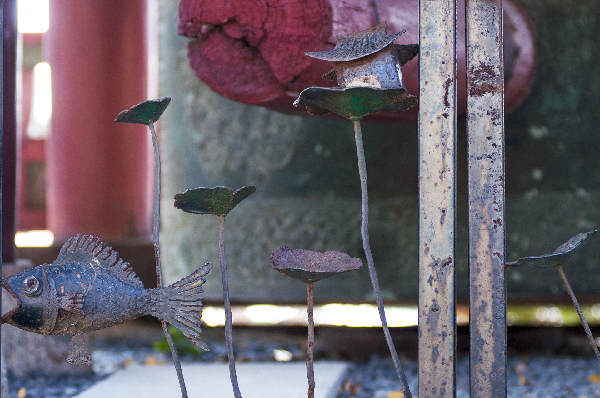 범종각으로 들어가는 문에 있는 물고기와 연잎과 암자.