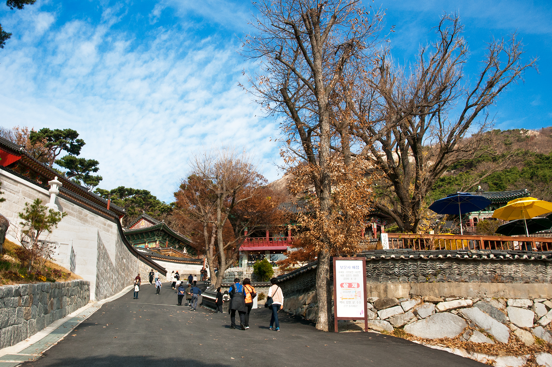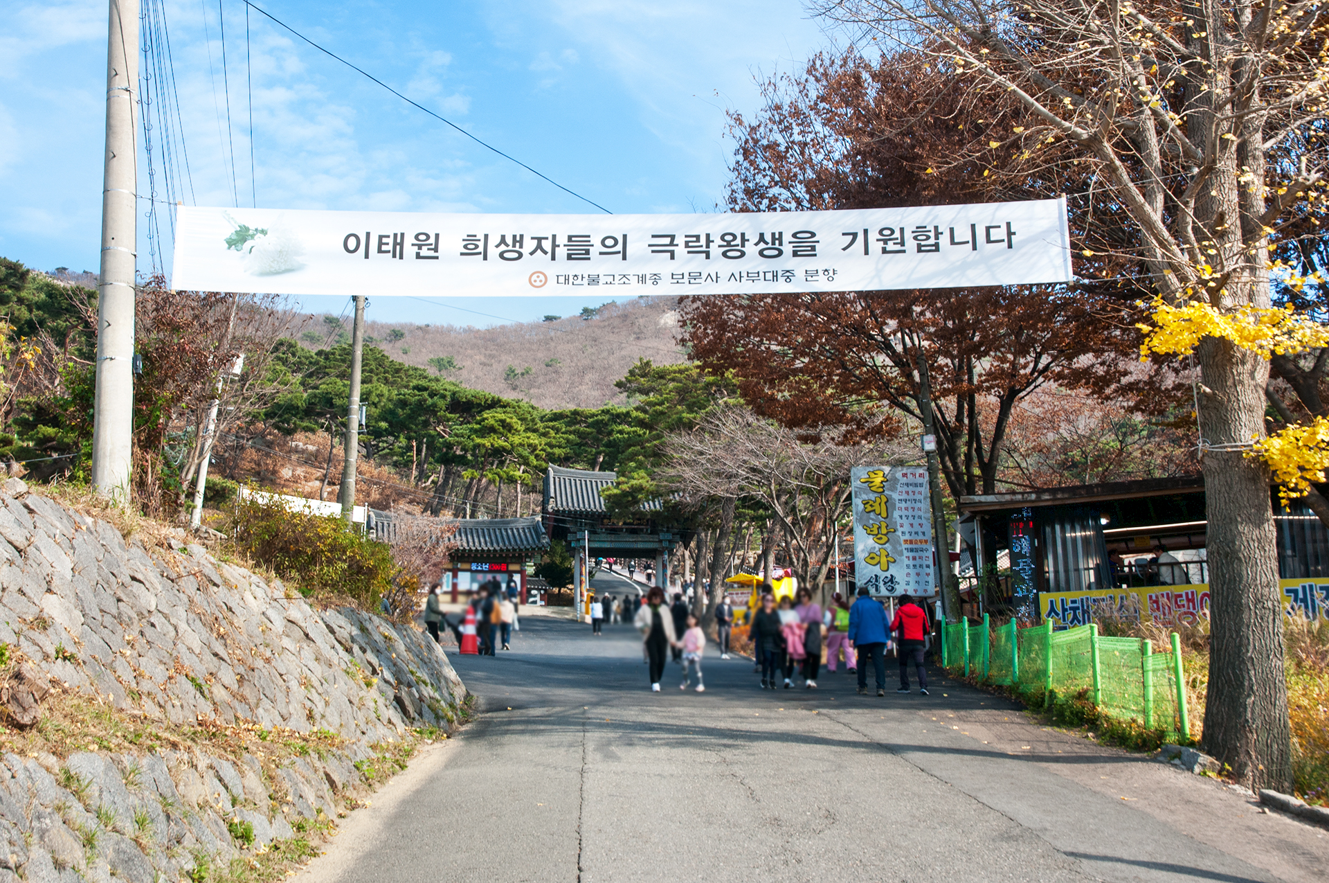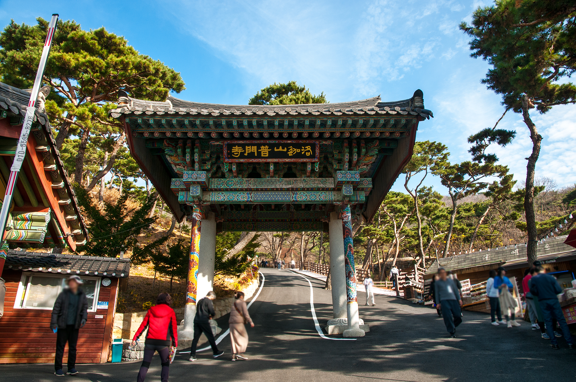 길가로 즐비하게 늘어선 음식점과 동네 어르신들의 노점을 지나면 일주문이 있다. 일주문은 문 밖의 사바세계와 문 안의 부처님의 세계를 나누는 상징적인 의미가 있다고 한다.