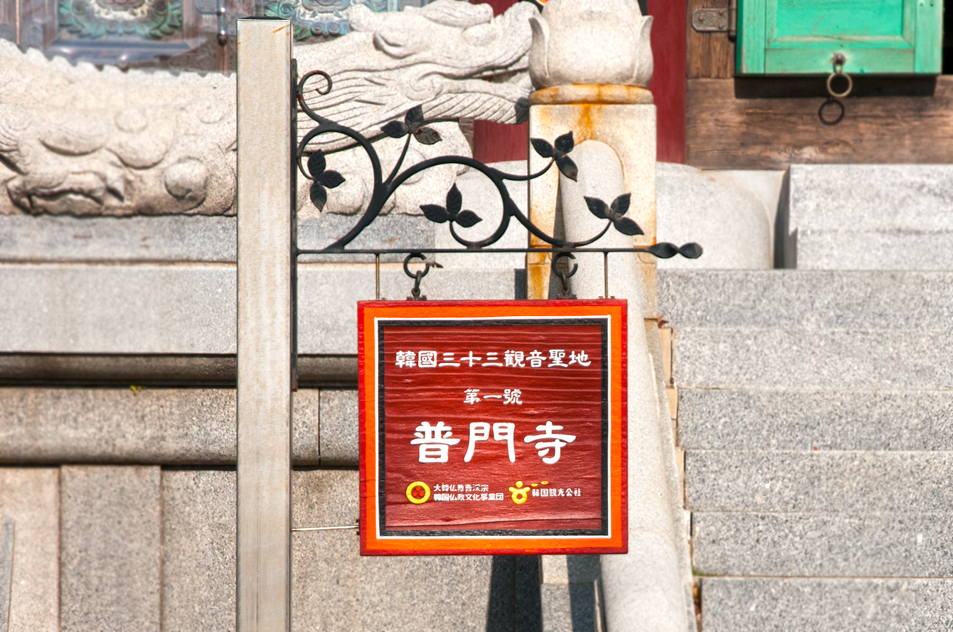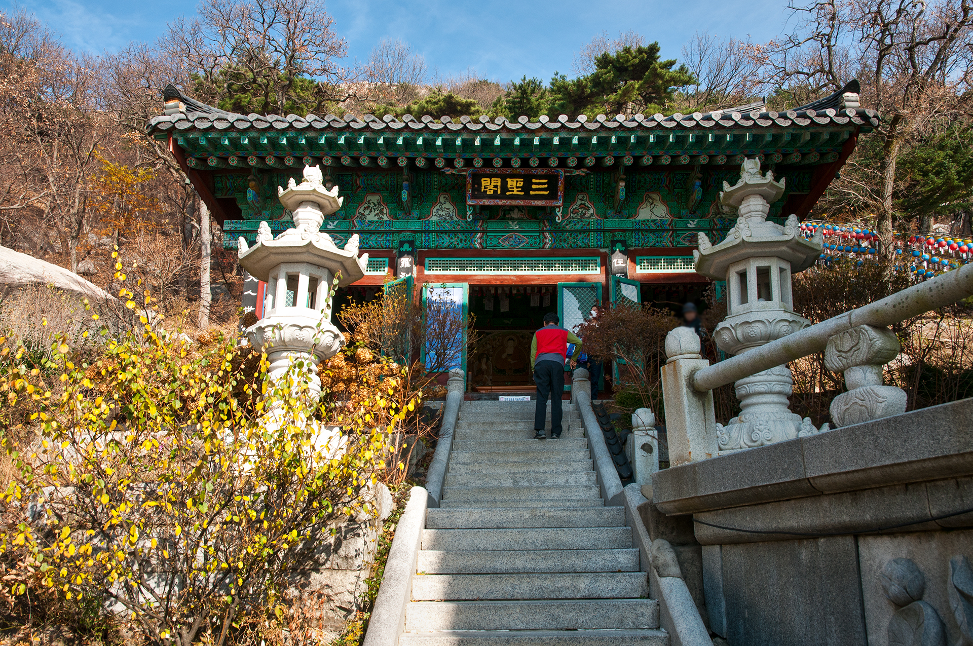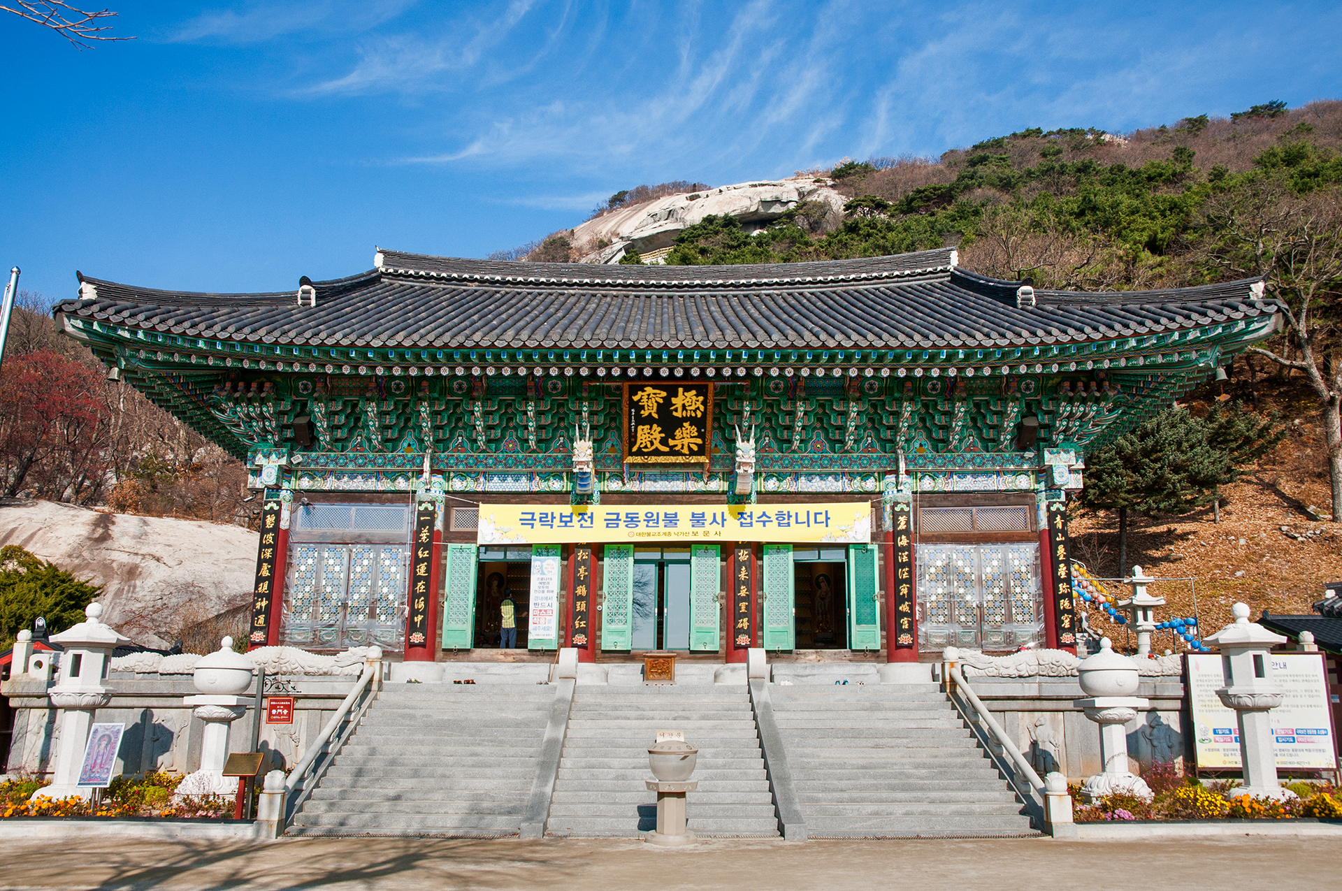 전각의 출입문은 채색된 꽃무늬의 문살로 단순한 가운데 소박한 멋을 더하고 있다. 뒤로는 낙가산의 눈썹바위가 보인다.