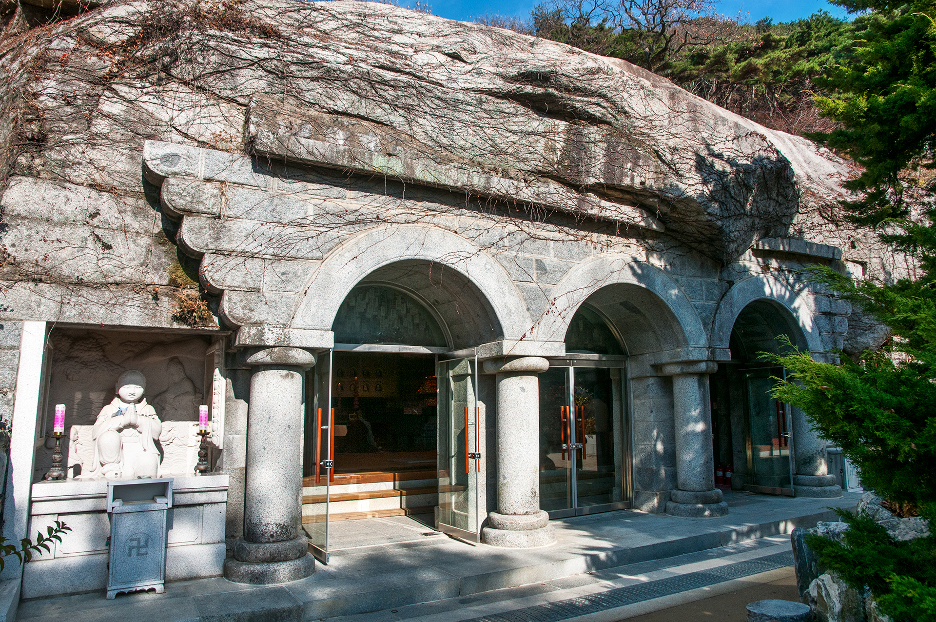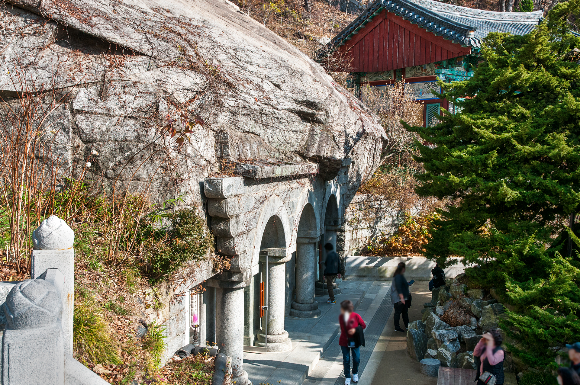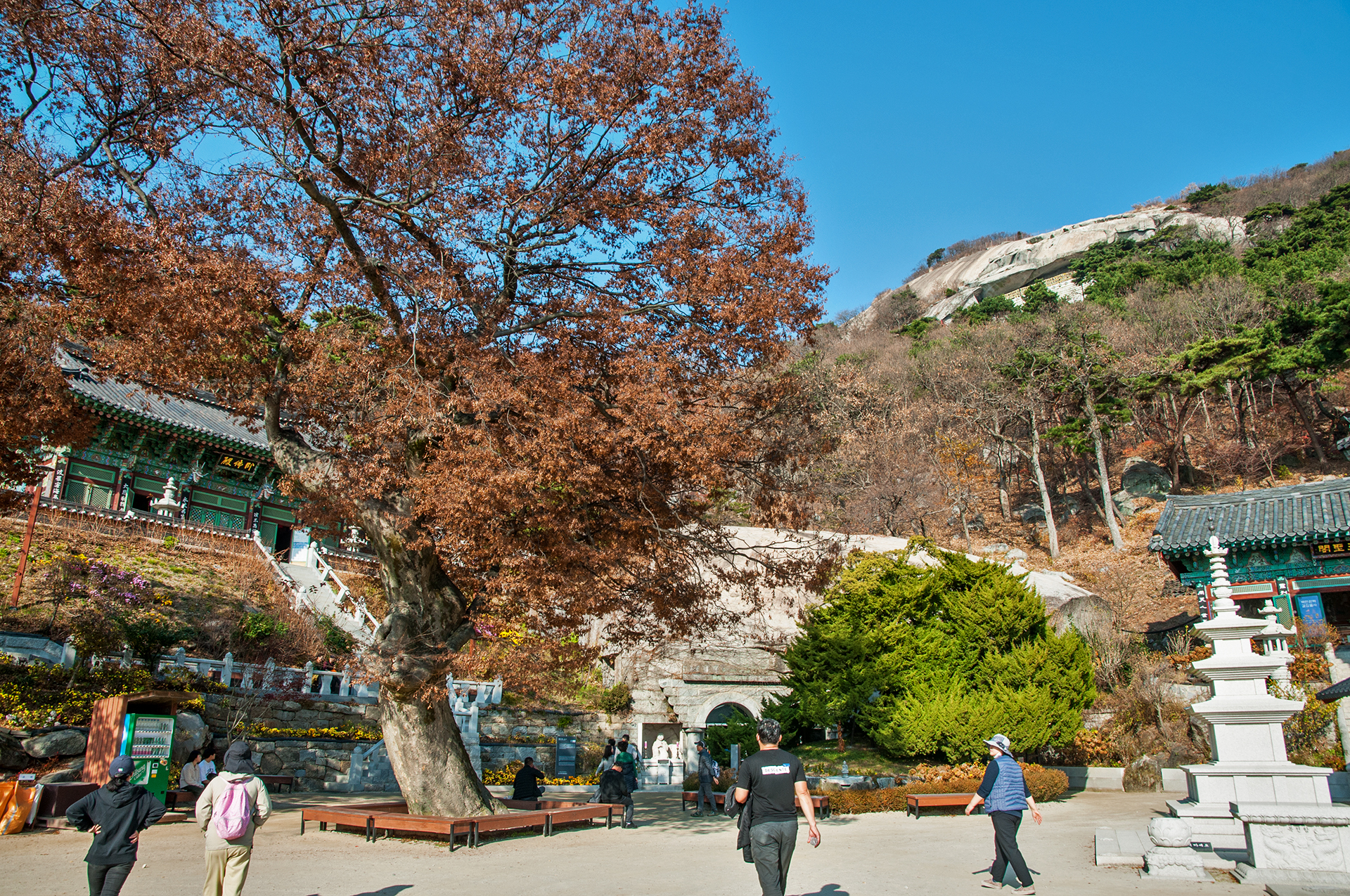 느티나무와 향나무의 모습, 그 뒤로 각각 와불전과 석실이 위치해 있다.