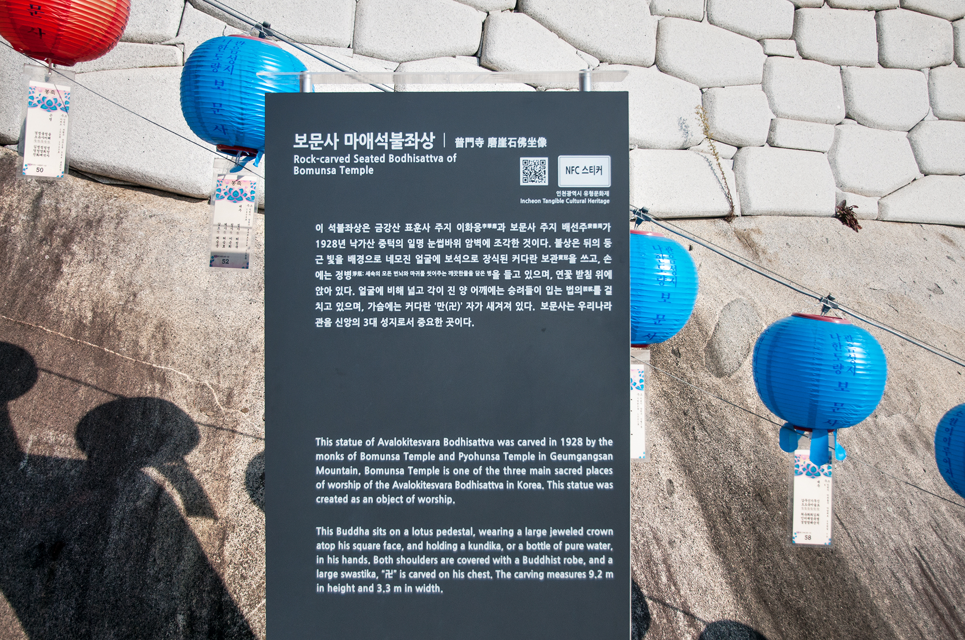 1928년 배선주 주지스님이 보문사가 관음 성지임을 나타내기 위하여 금강산 표훈사의 이화응 스님과 더불어 낙가산 눈썹바위 아래에 조성한 것으로 크기는 높이 920cm, 너비 330cm에 달하는 거상이다.