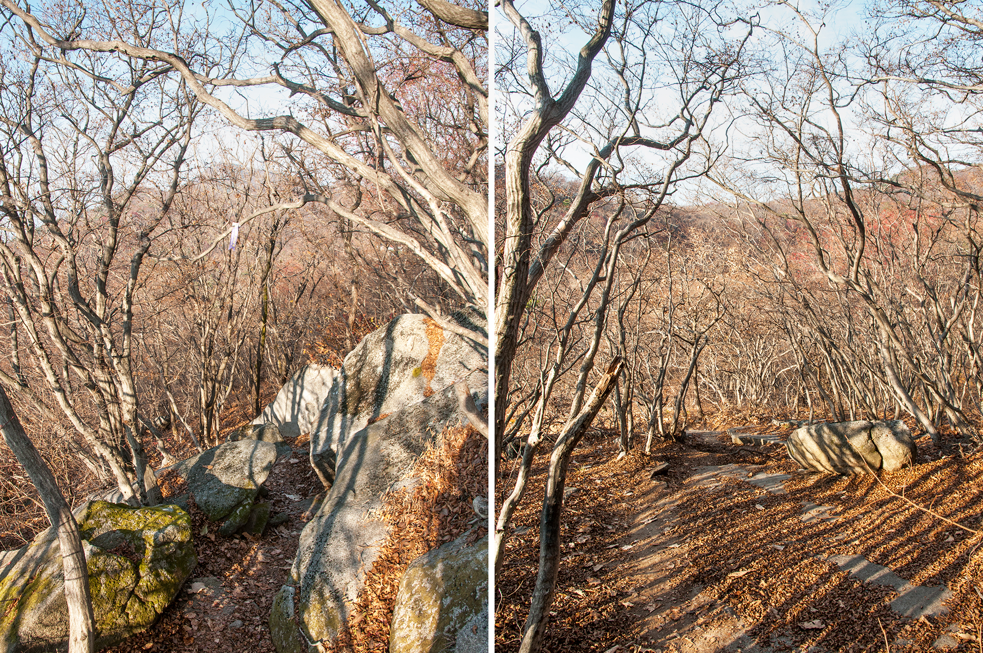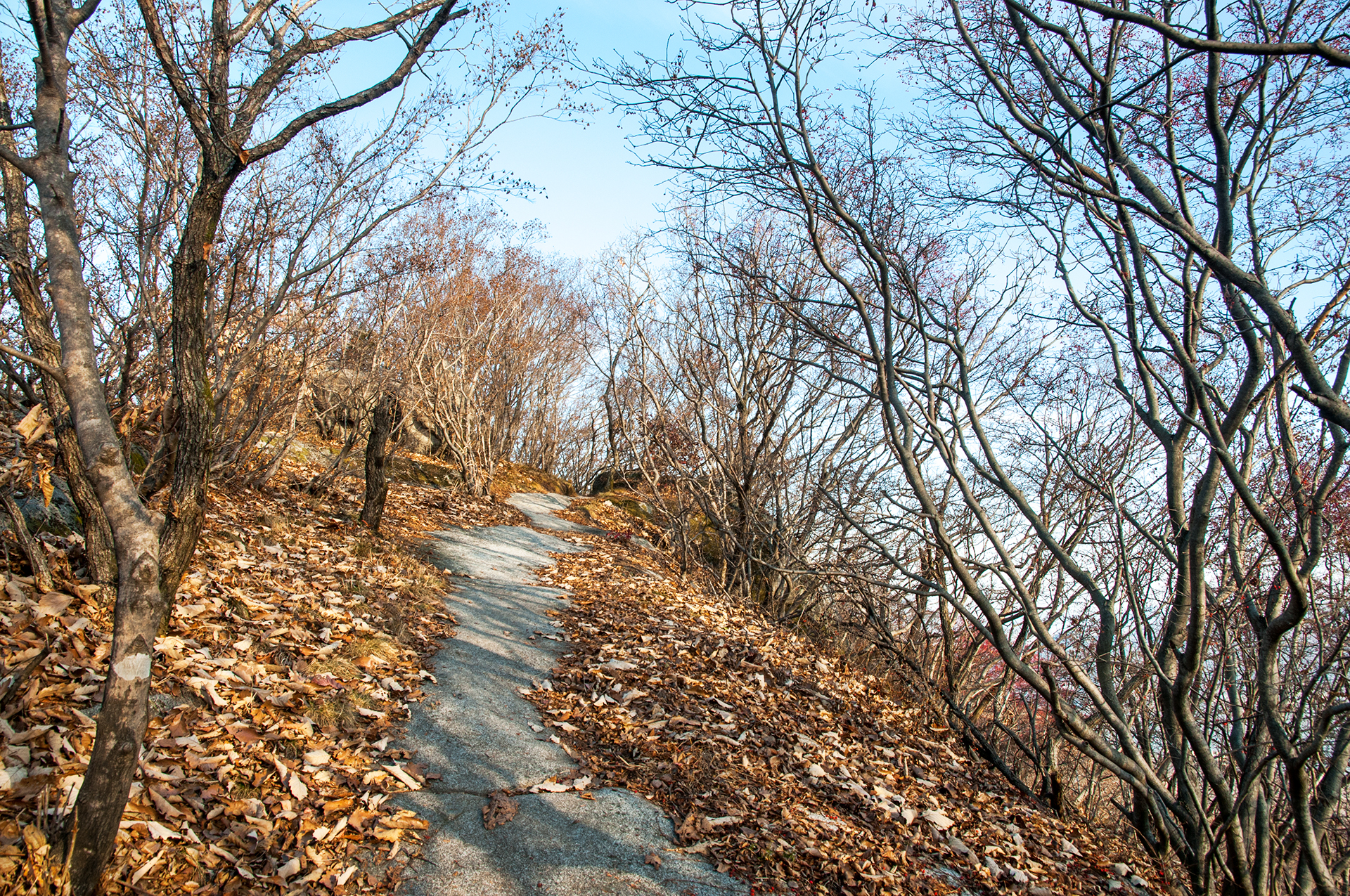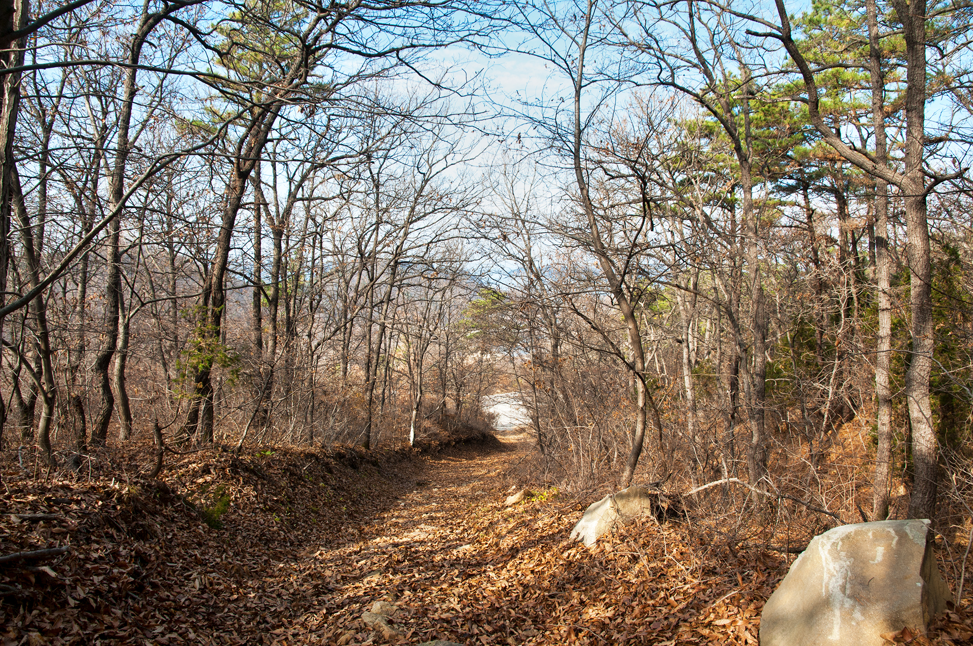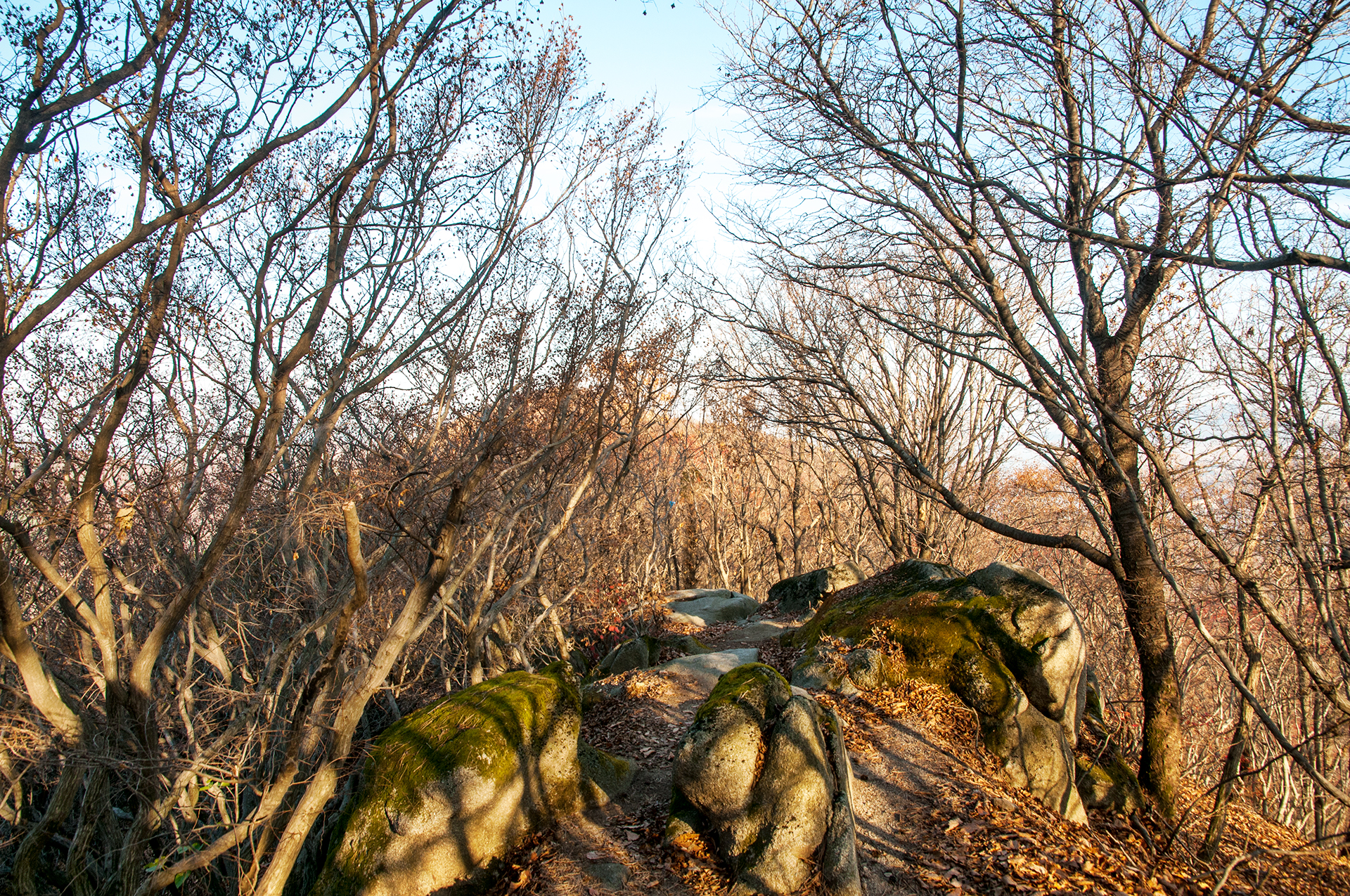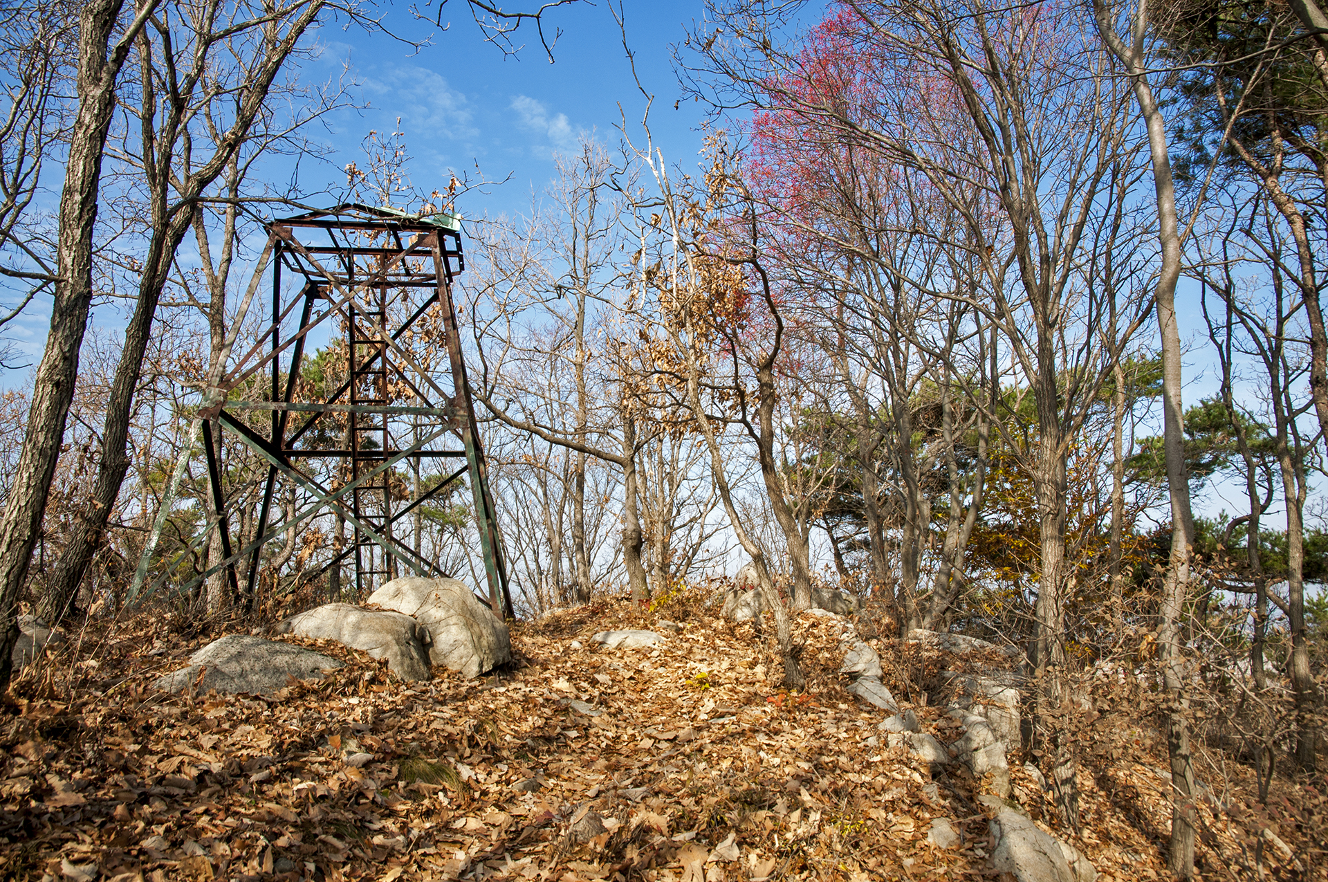 이미 북쪽의 산은 가을의 맛을 지운지 오래된 듯 하다. 등산로는 바짝 마른 낙엽 투성이고, 나무들은 잎을 떨군채 메마른 모습을 보여준다.