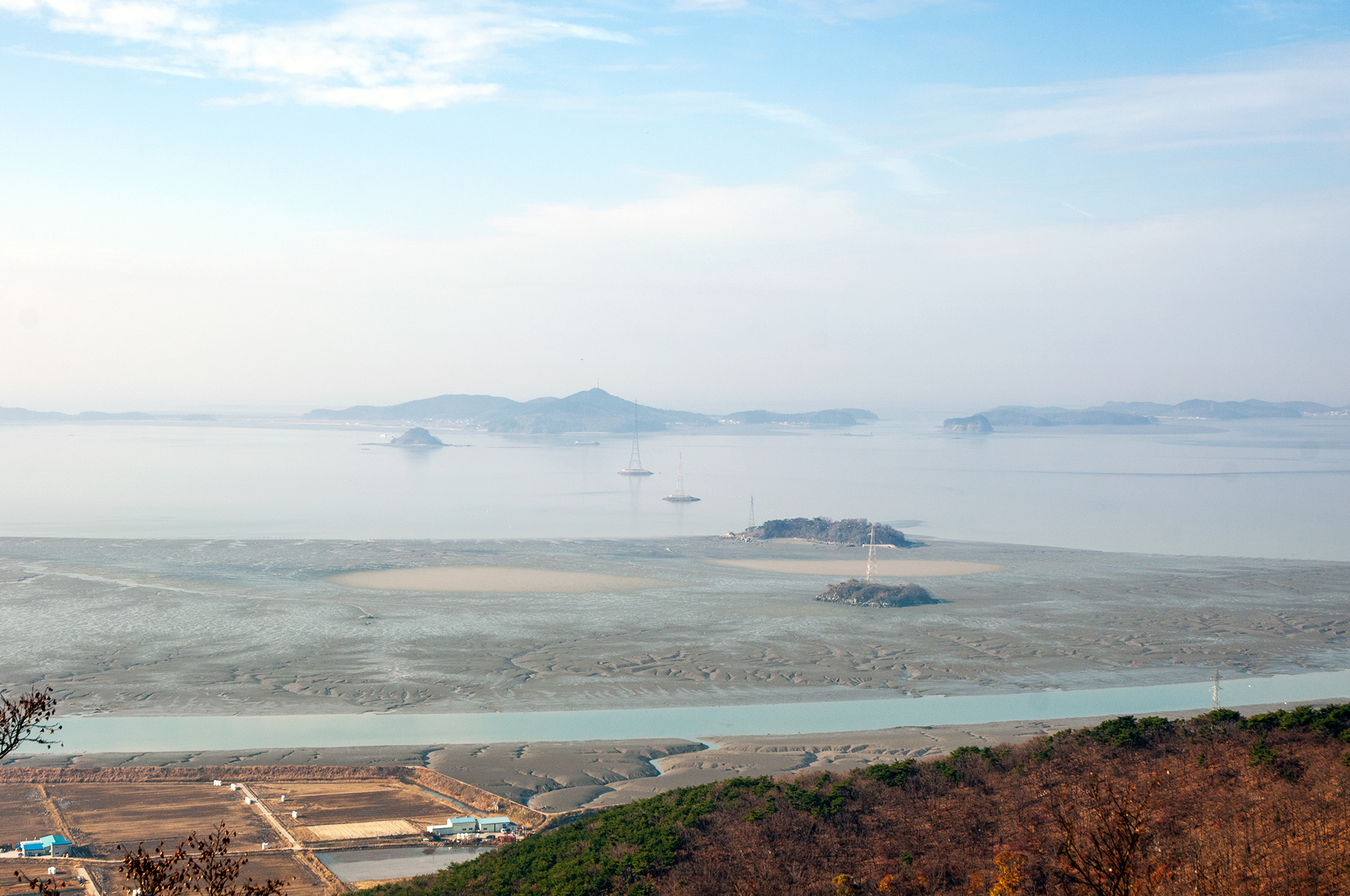 갯벌 건너 송전탑이 바다를 퐁당퐁당 건너가 주문도로 이어진다.