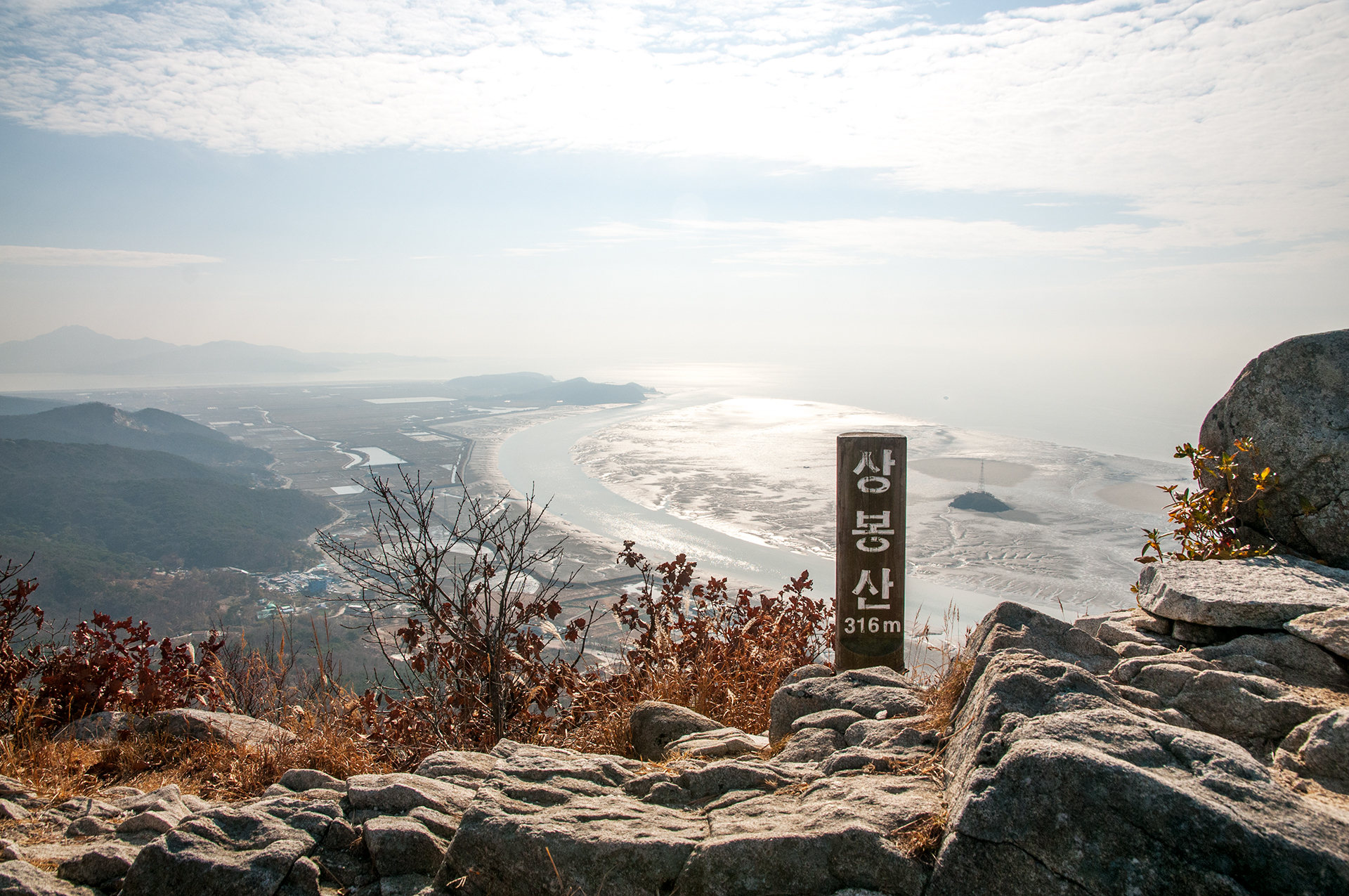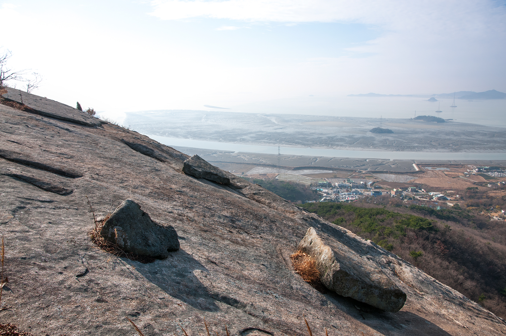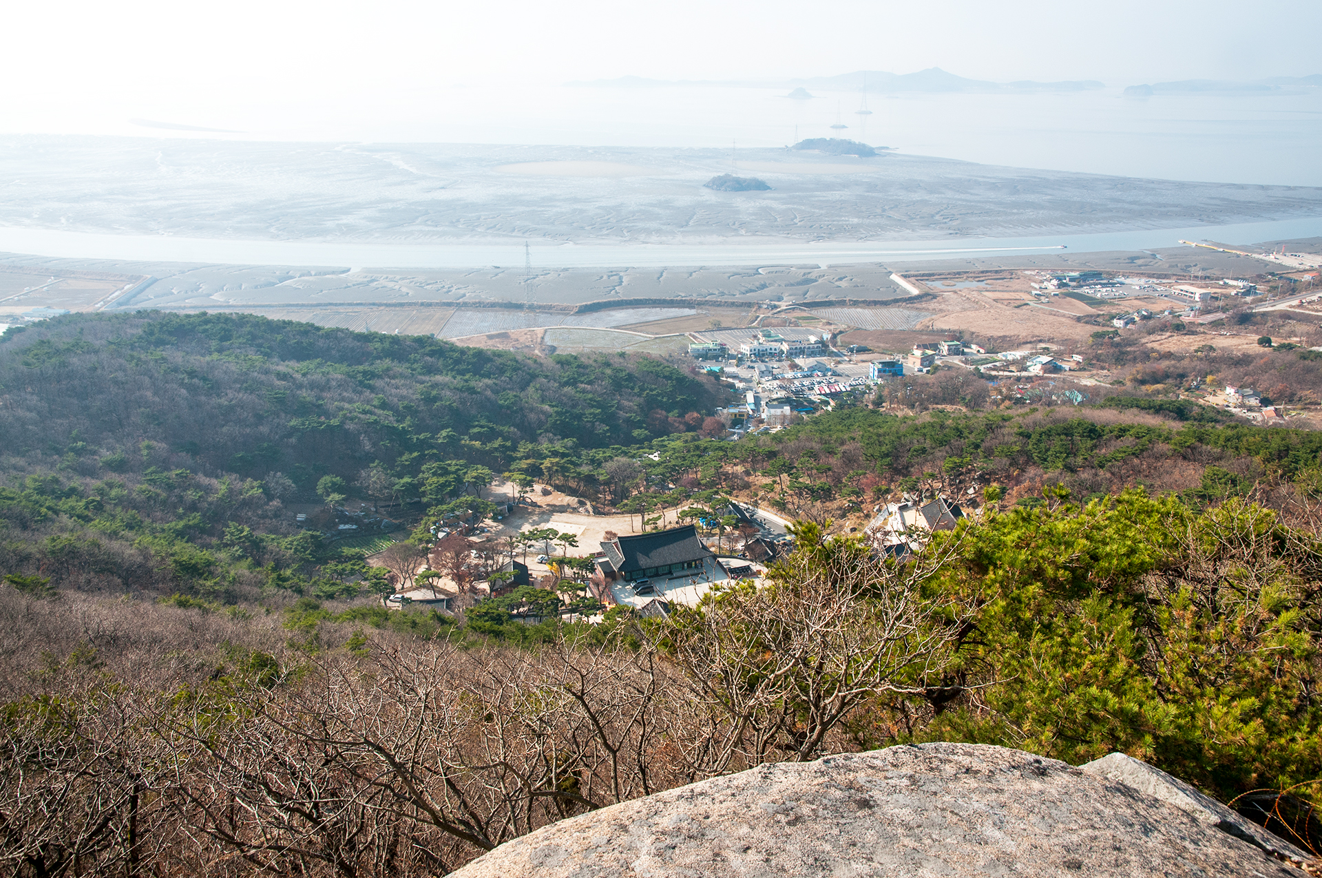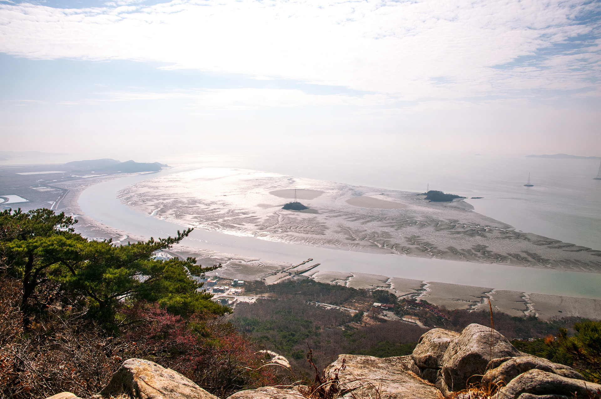 낙가산 앞 갯벌에 풀등이 넓게 펼쳐져 있다.