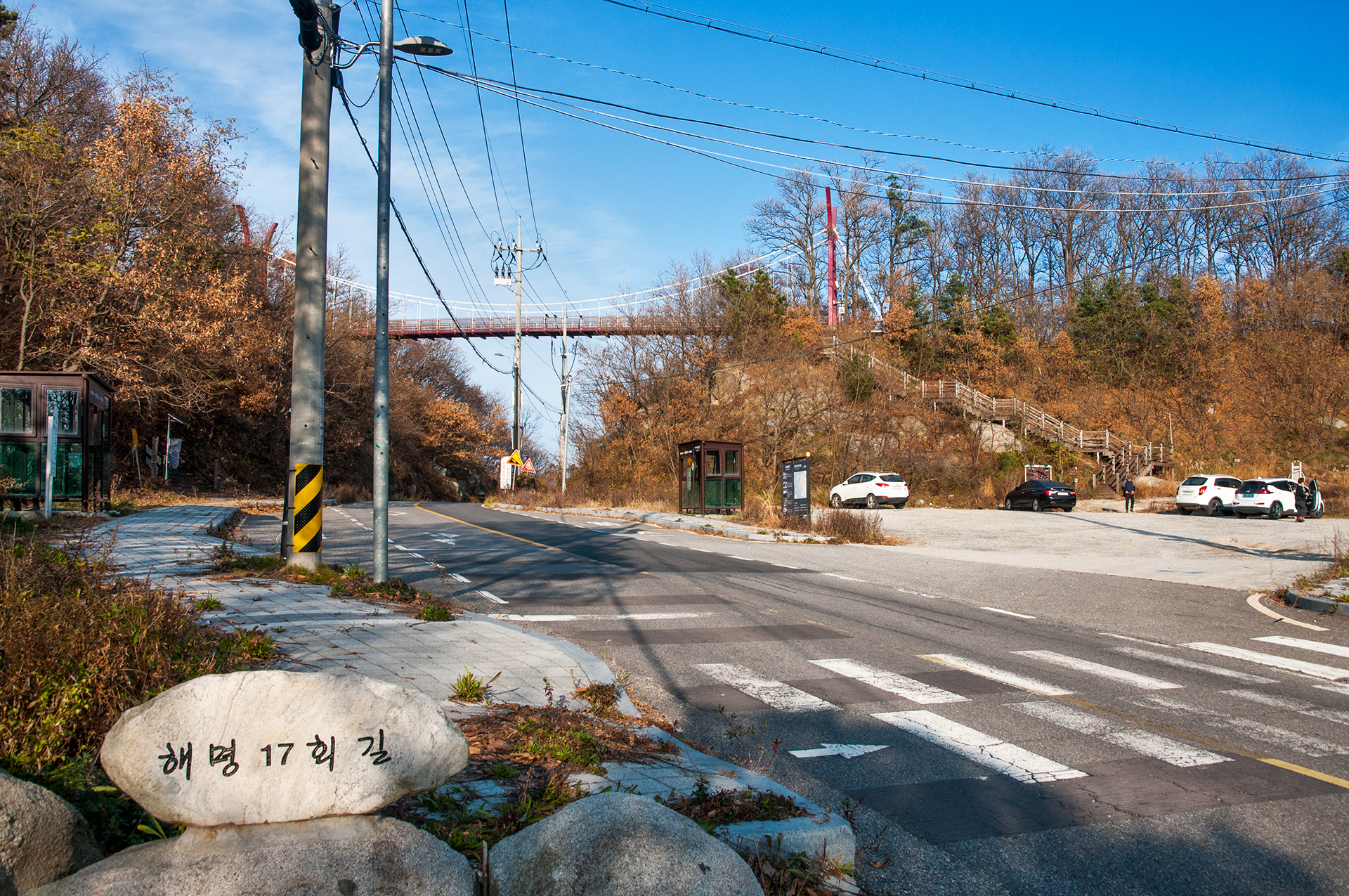 도로를 가로질러 놓여있는 출렁다리를 건너가면 본격적으로 해명산 산행이 시작된다.