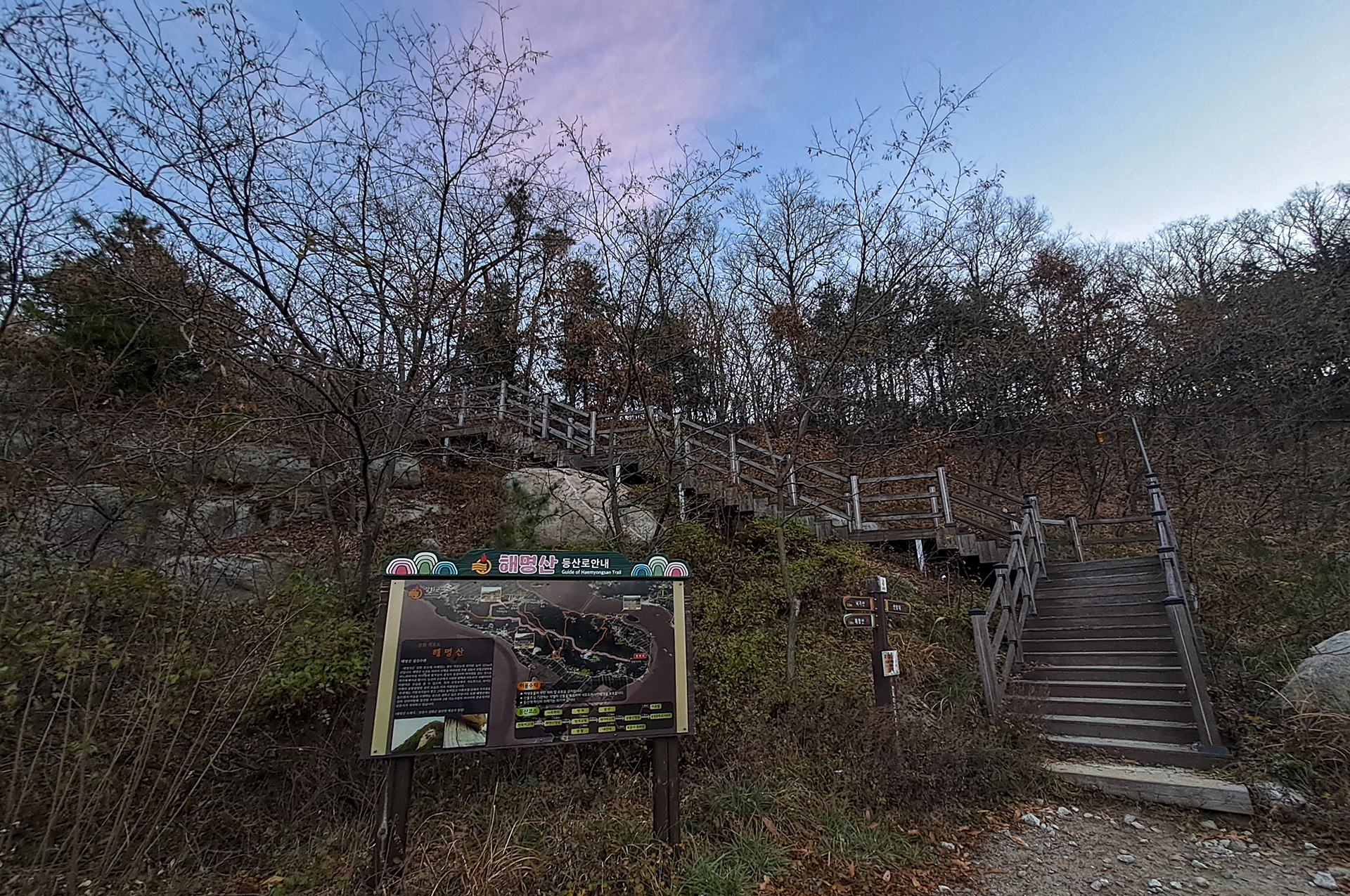 출렁다리에서 조금 올라온 지점으로 해명산 정상까지는 1.1km라고 하니 천천히 걸어보자