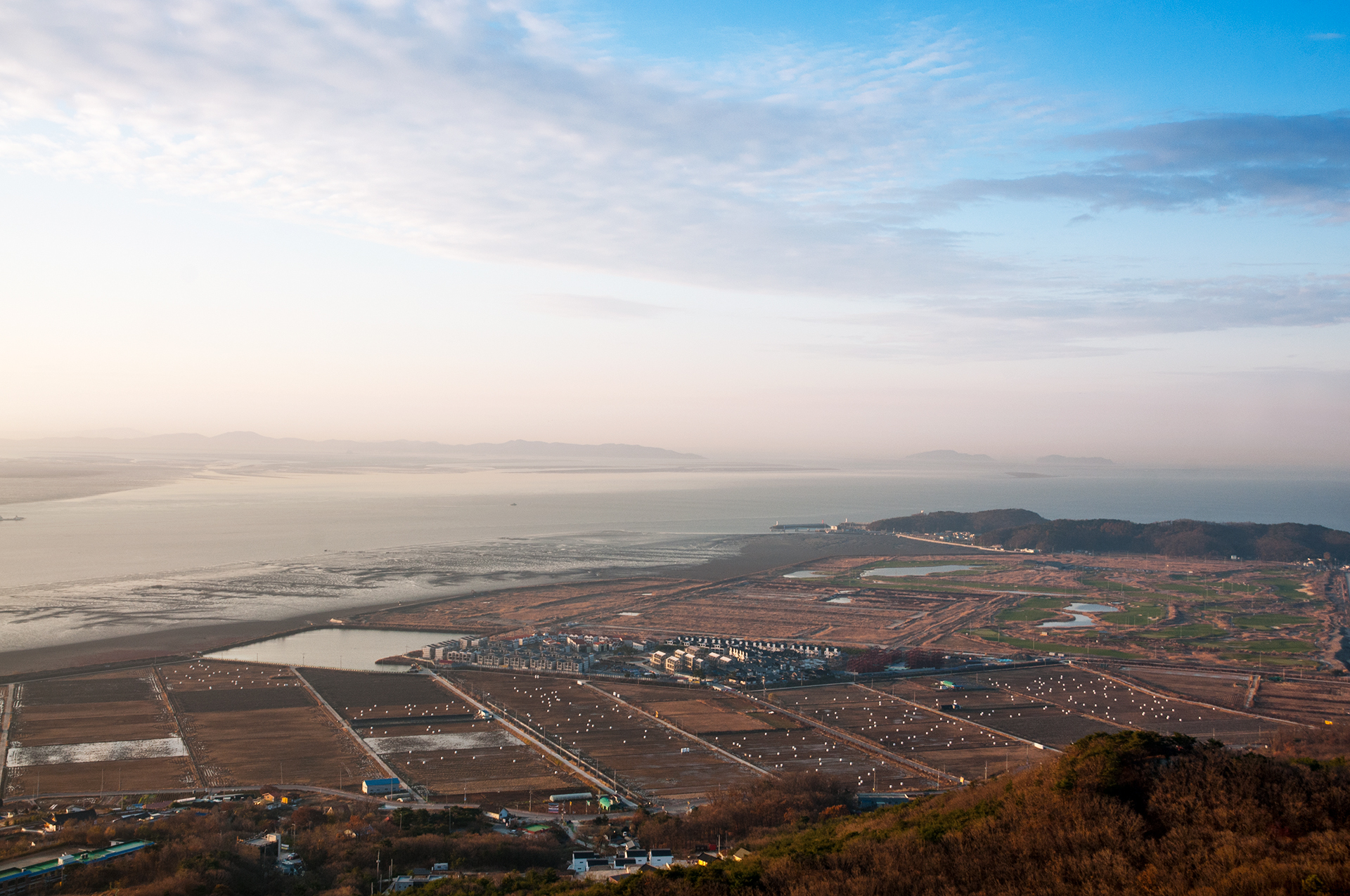 간조때라 물이 빠지고 있는 시간, 갯벌 앞으로 간척지의 모습이 광활하게 펼쳐지고, 논에는 마시멜로 같은 하얀 건초더미가 보인다.