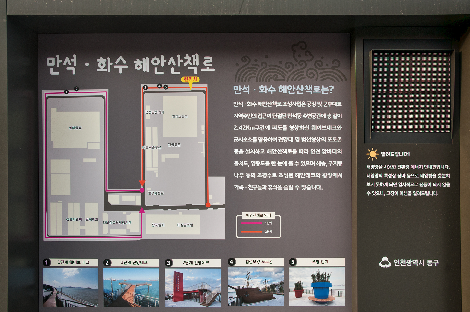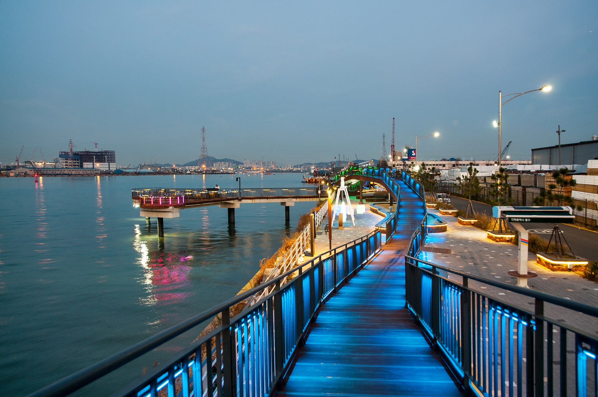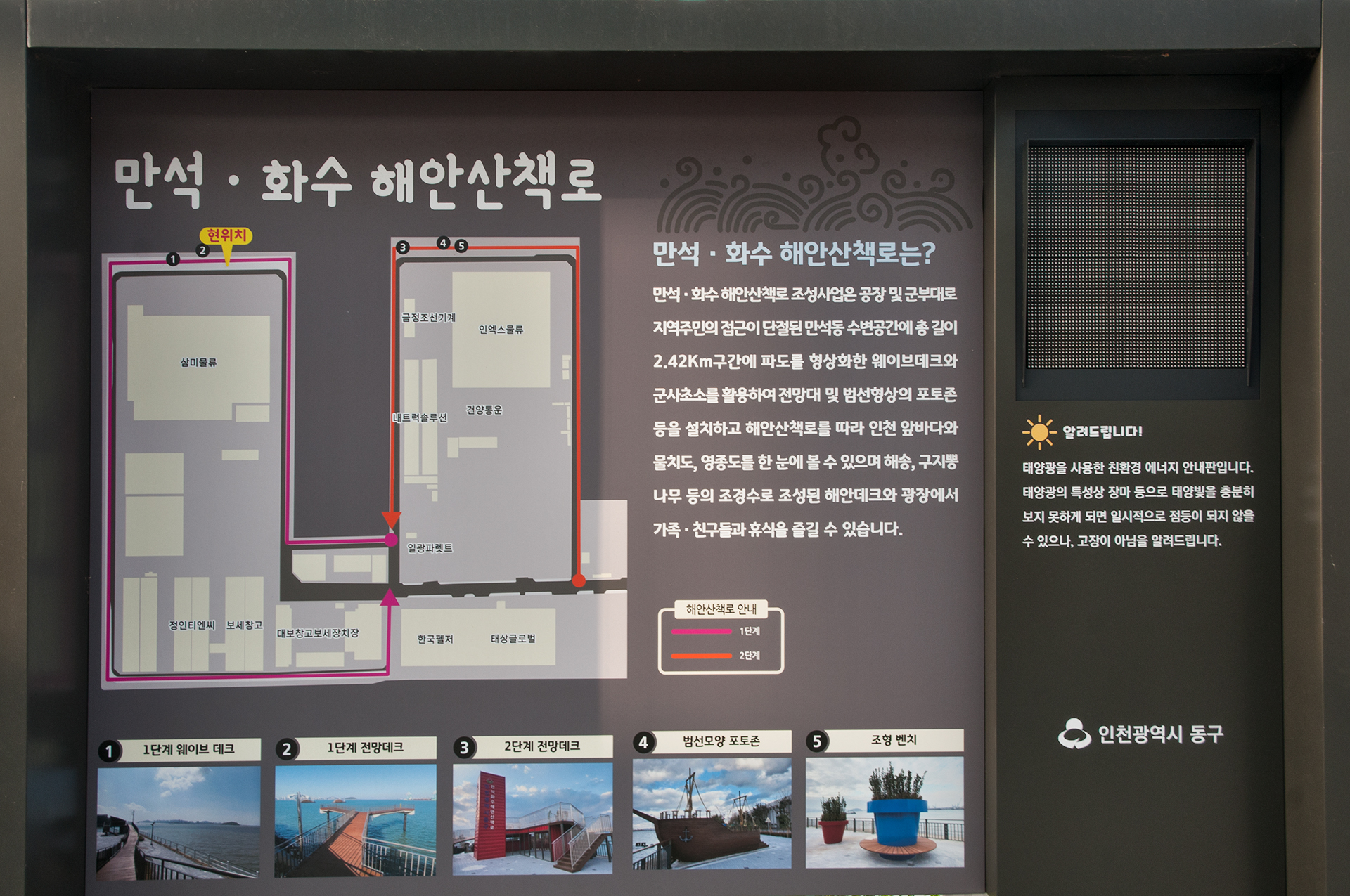 만석.화수 해안산책로는 공장과 군부대로 지역주민의 접근이 단절되었던 만석동 수변공간에 총 길이 2.42km 구간에 파도를 형상화한 웨이브데크와 군사초소를 활용하여 전망대 및 범선 포토존 등을 설치하여 휴식을 즐길 수 있는 공간으로 변화하였다.