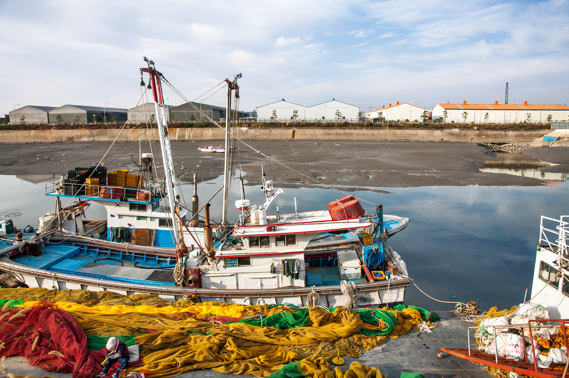 어선과 그물 손질이 한창인 어르신의 모습