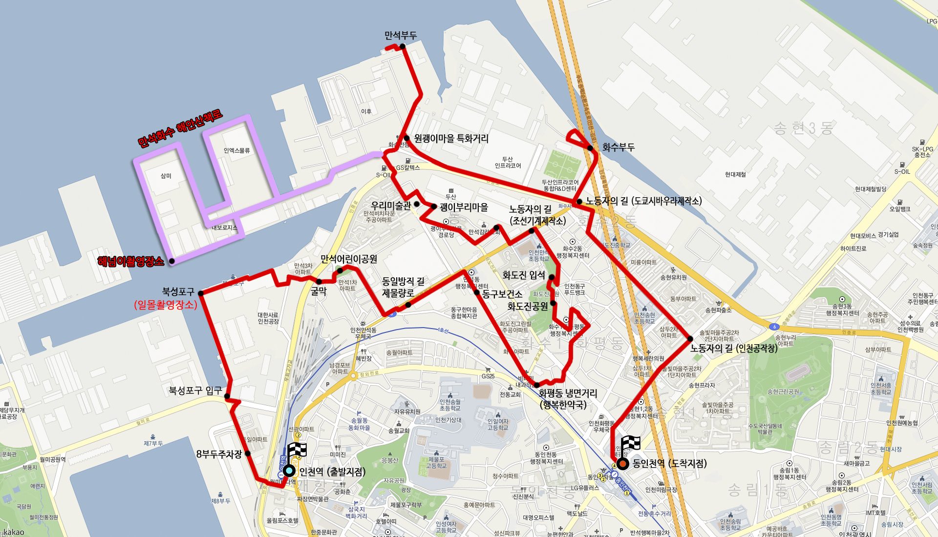 찾아가는 길이 쉽지는 않다. 예전 인천둘레길 14코스용 지도를 가져와 추가로 표시했다.
