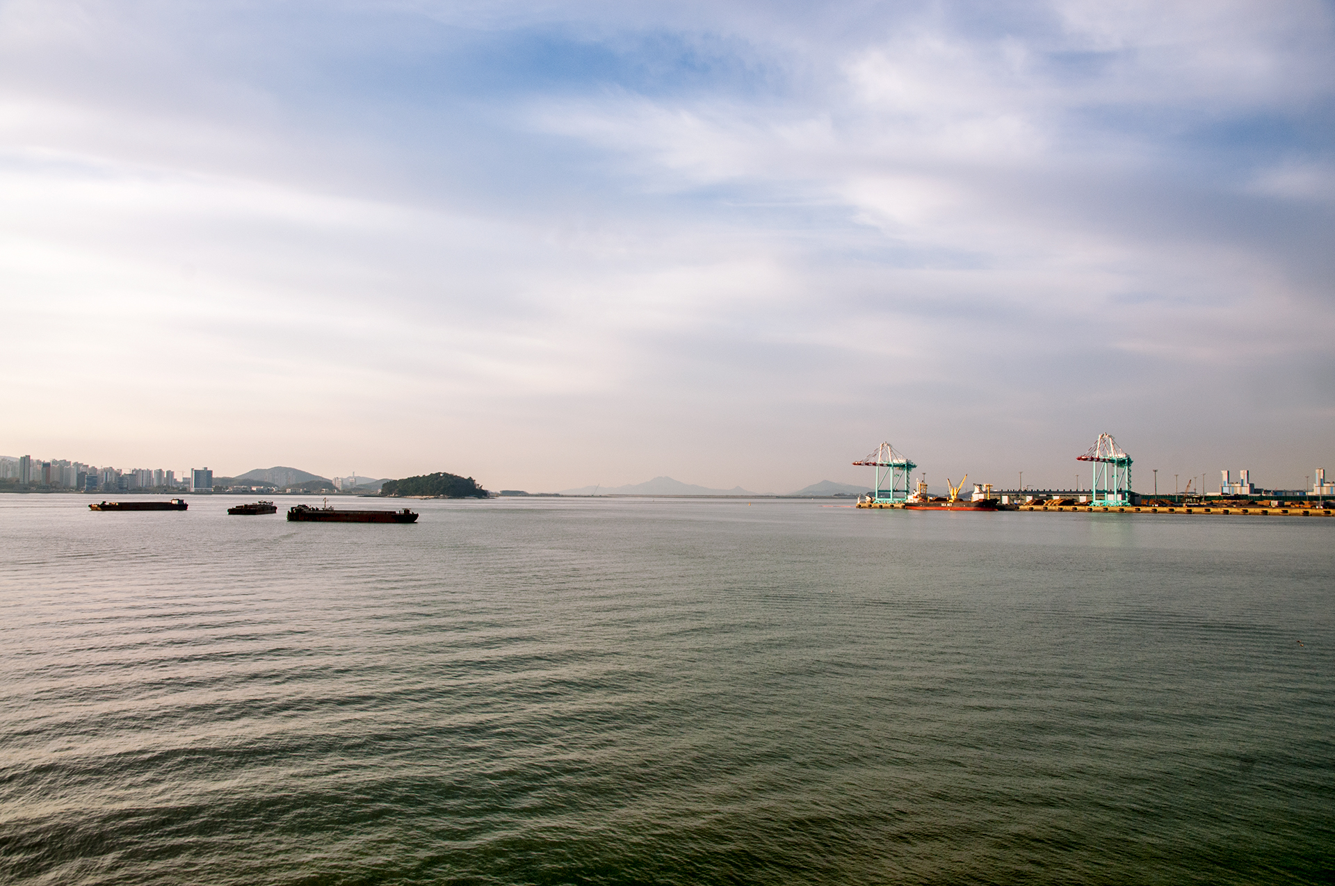 제일 가까이 보이는 섬은 물치도이고 왼쪽 도시는 영종도, 오른쪽으로는 강화도가 길고 희미하게 누워있다.
